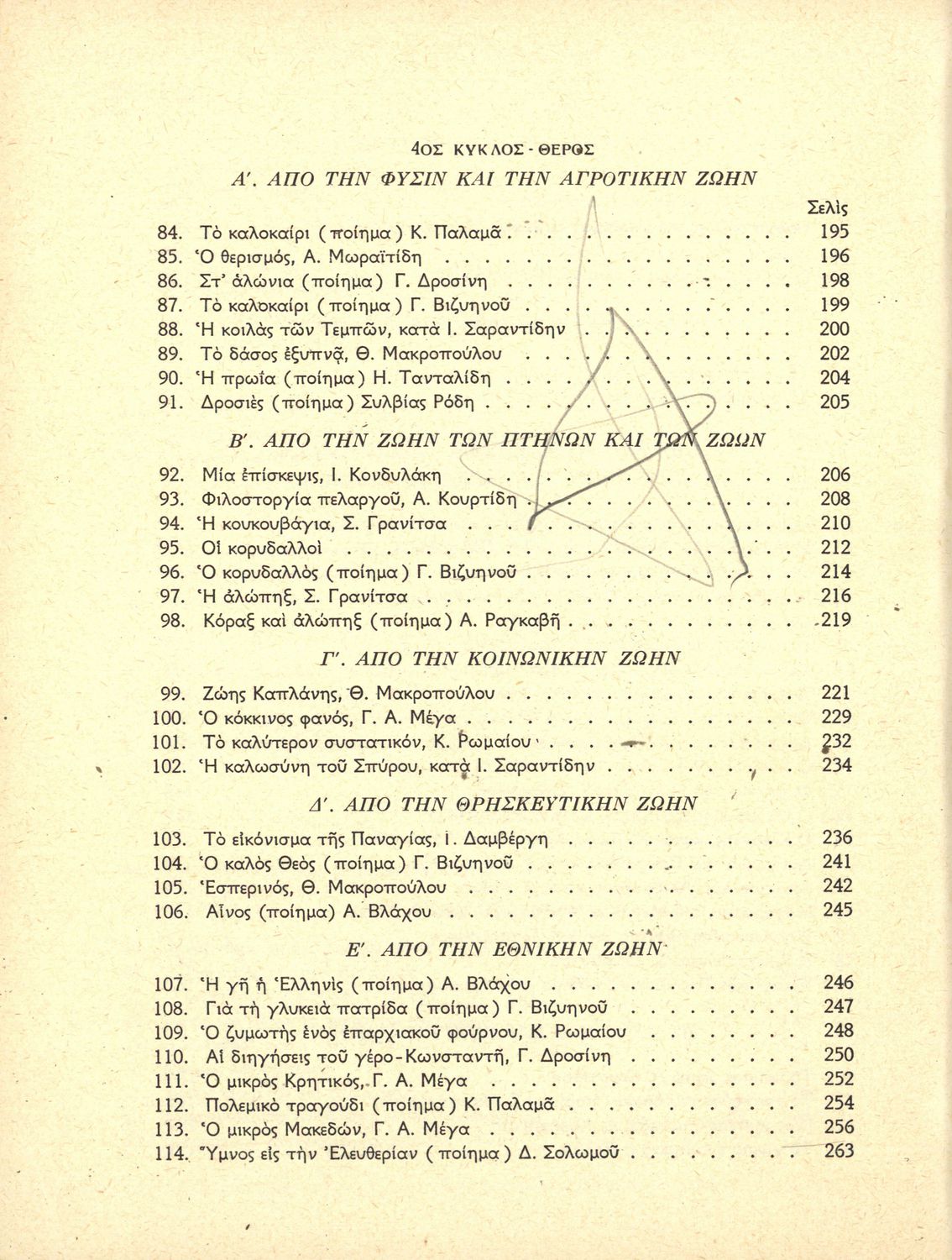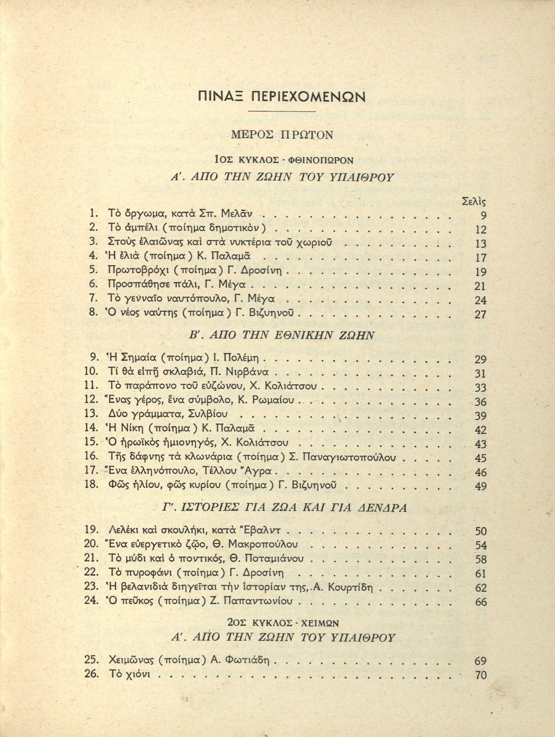 Αναγνωστικό Δ' Δημοτικού που είναι χωρισμένο σύμφωνα με τις εποχές του χρόνου και περιλαμβάνει ποιήματα και πεζά εμπνευσμένα από τη ζωή στην ύπαιθρο, την εθνική, οικογενειακή και κοινωνική ζωή, τη θρησκευτική παράδοση, τις ασχολίες των ανθρώπων, και την ελληνική φύση, ιστορία και μυθολογία.