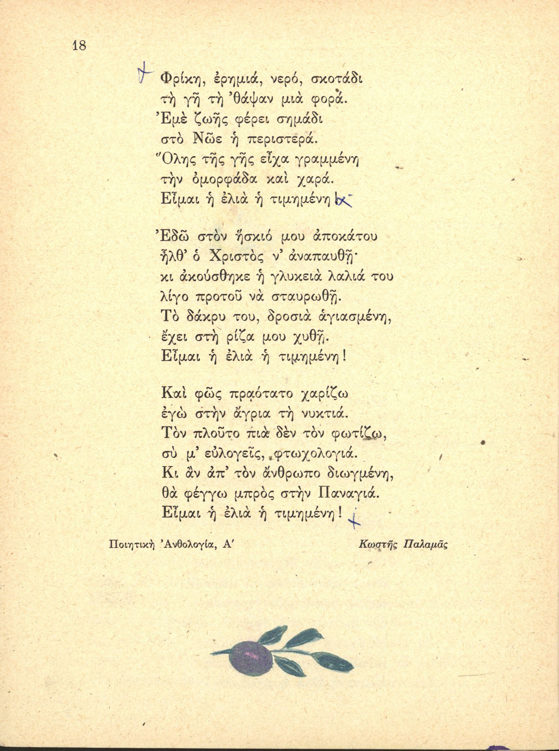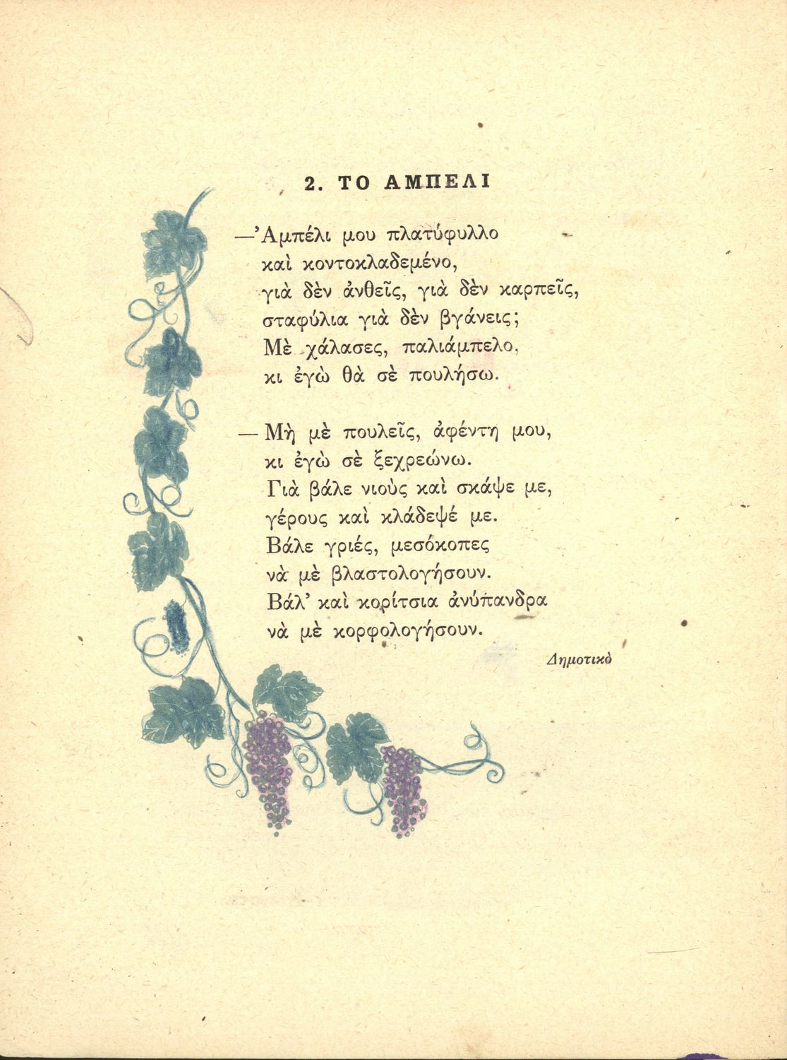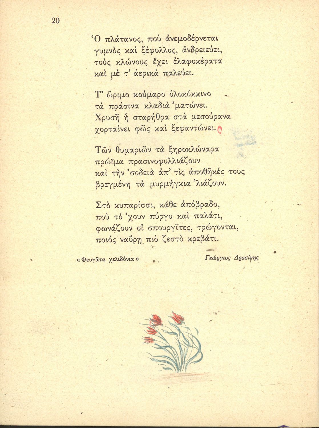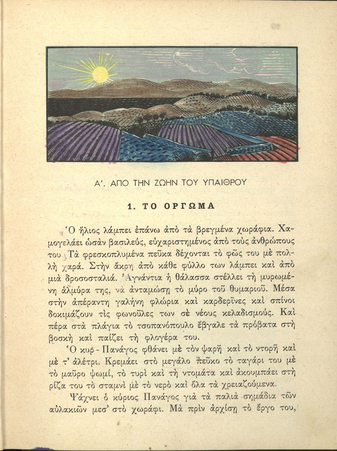 Αναγνωστικό Δ' Δημοτικού που είναι χωρισμένο σύμφωνα με τις εποχές του χρόνου και περιλαμβάνει ποιήματα και πεζά εμπνευσμένα από τη ζωή στην ύπαιθρο, την εθνική, οικογενειακή και κοινωνική ζωή, τη θρησκευτική παράδοση, τις ασχολίες των ανθρώπων, και την ελληνική φύση, ιστορία και μυθολογία.