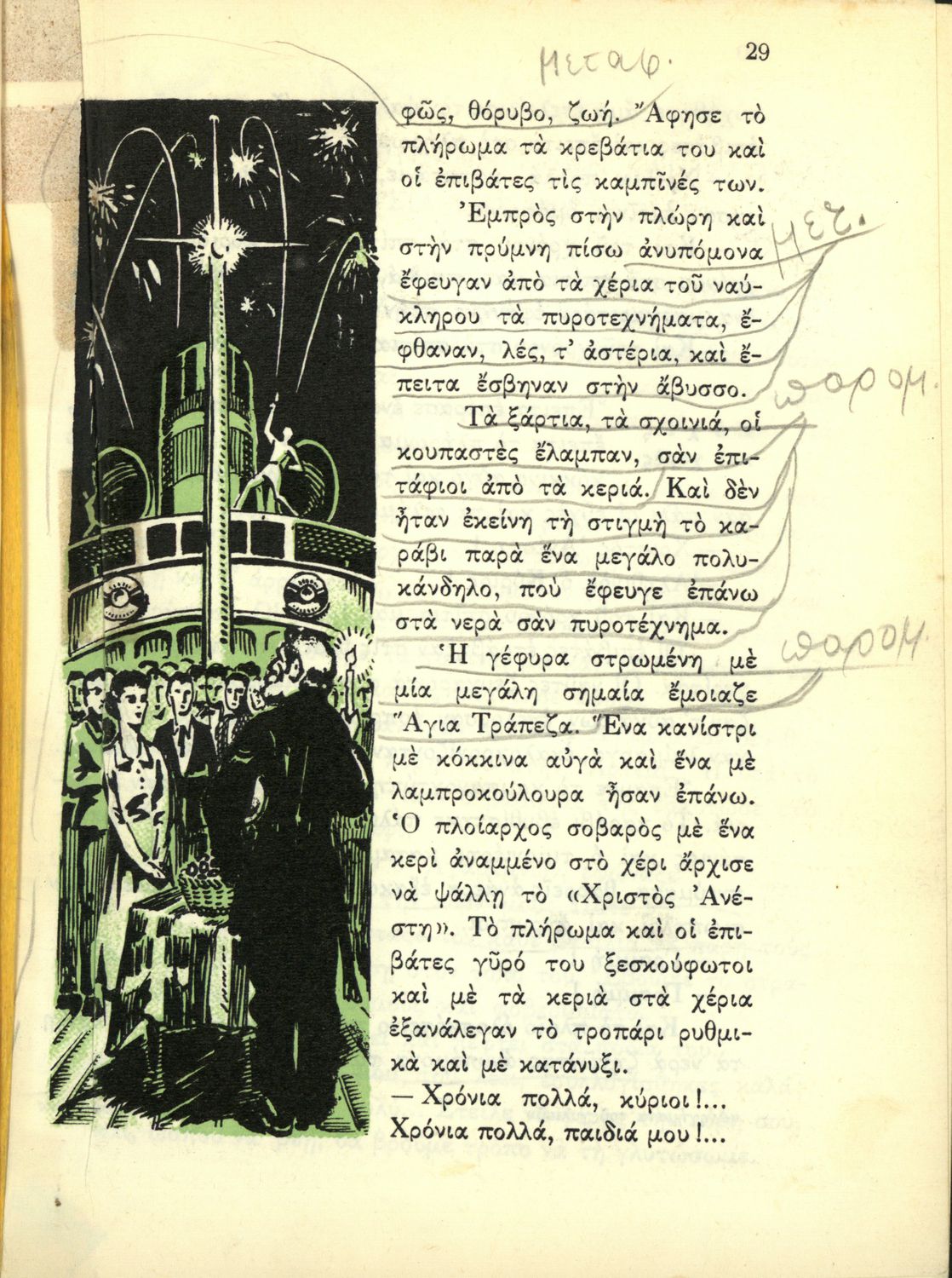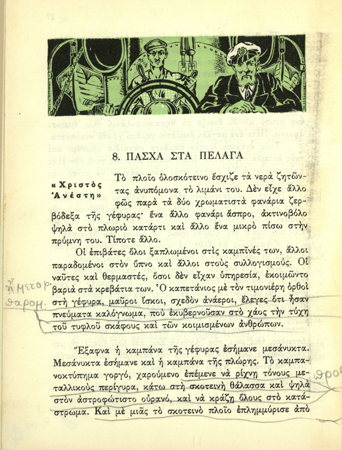 Αναγνωστικό Ε΄ Δημοτικού που περιέχει κείμενα εμπνευσμένα από την εθνική, κοινωνική και οικογενειακή ζωή και την ελληνική φύση, μυθολογία και ιστορία. Φέρει το σύμβολο της δικτατορίας.