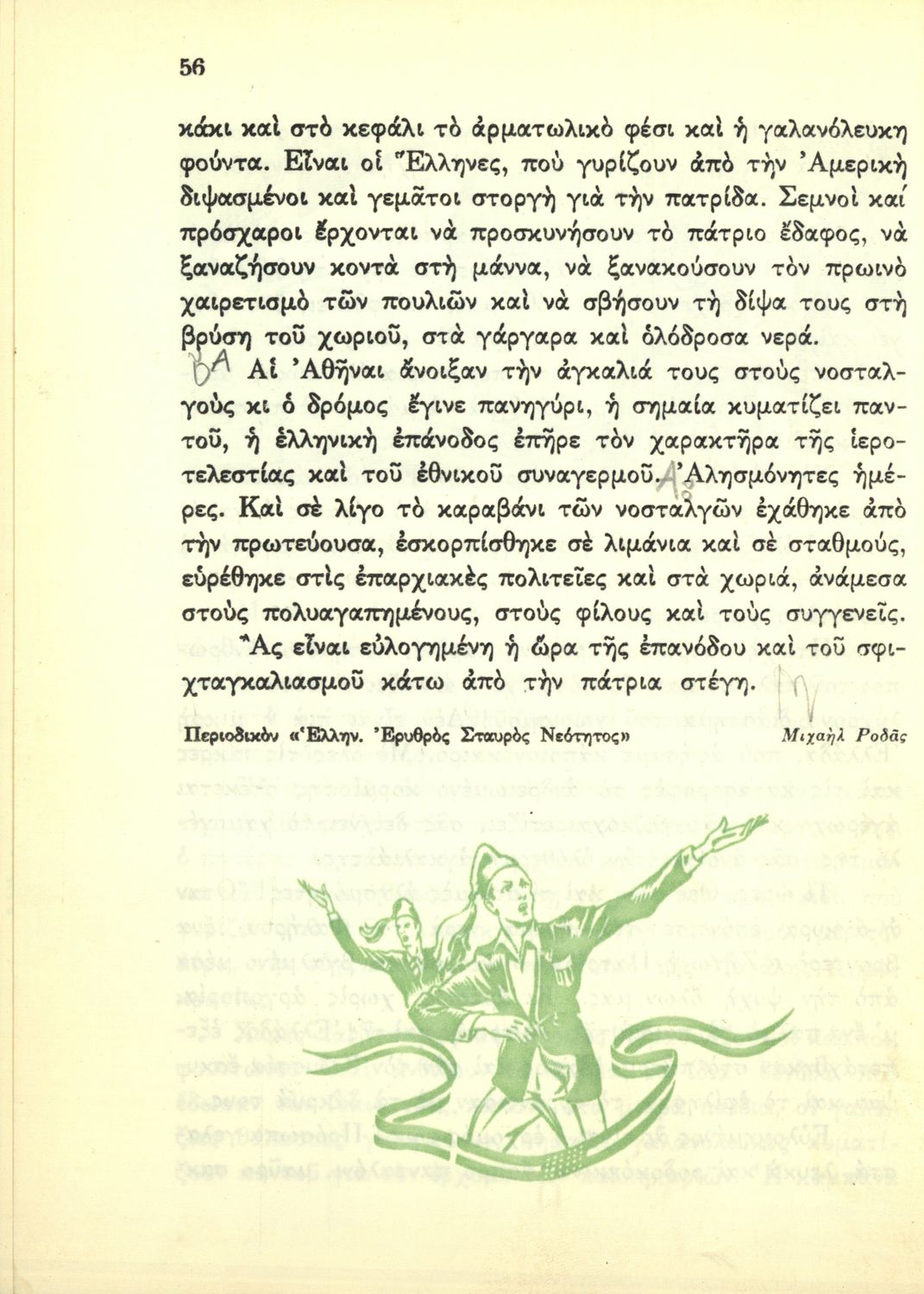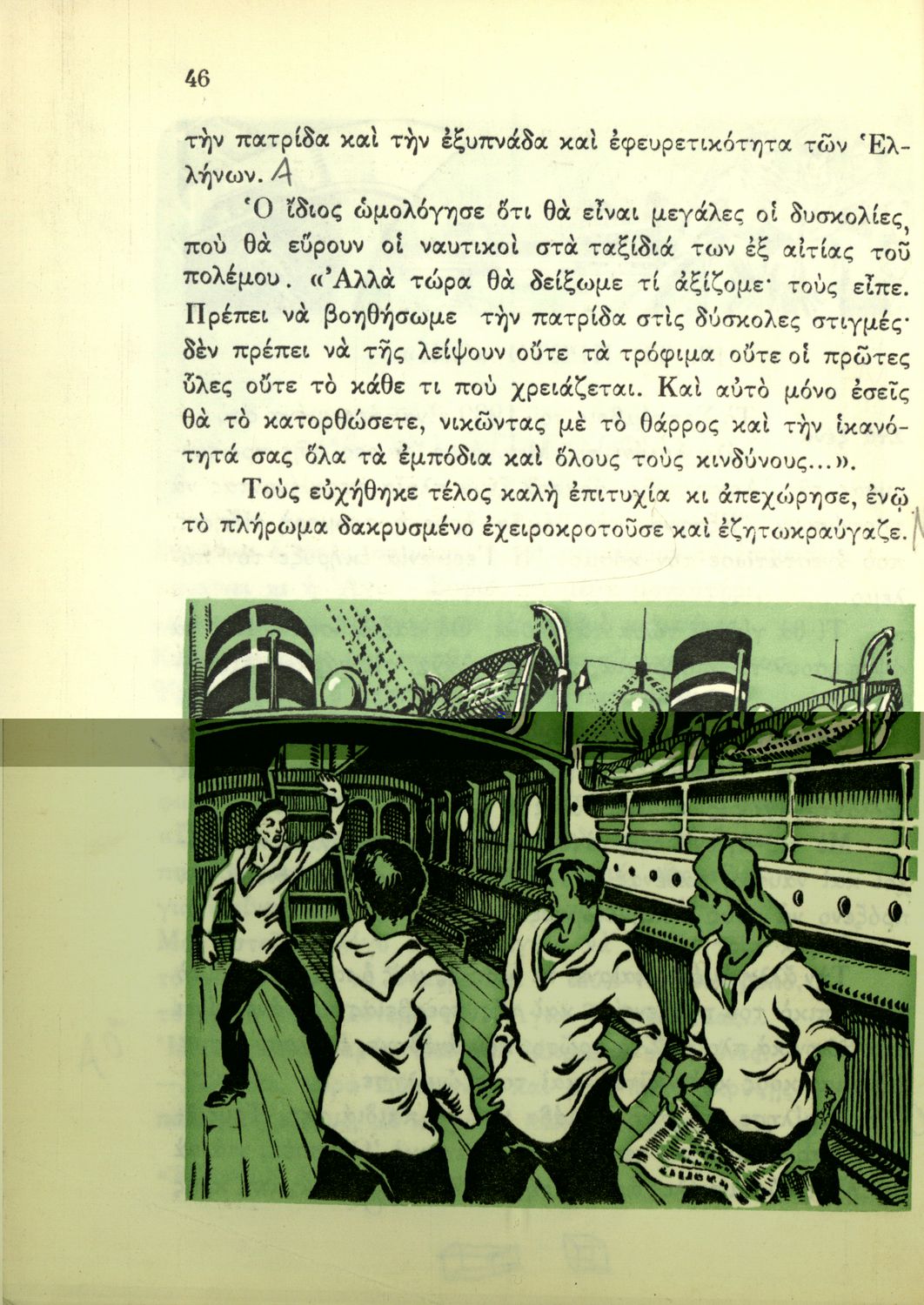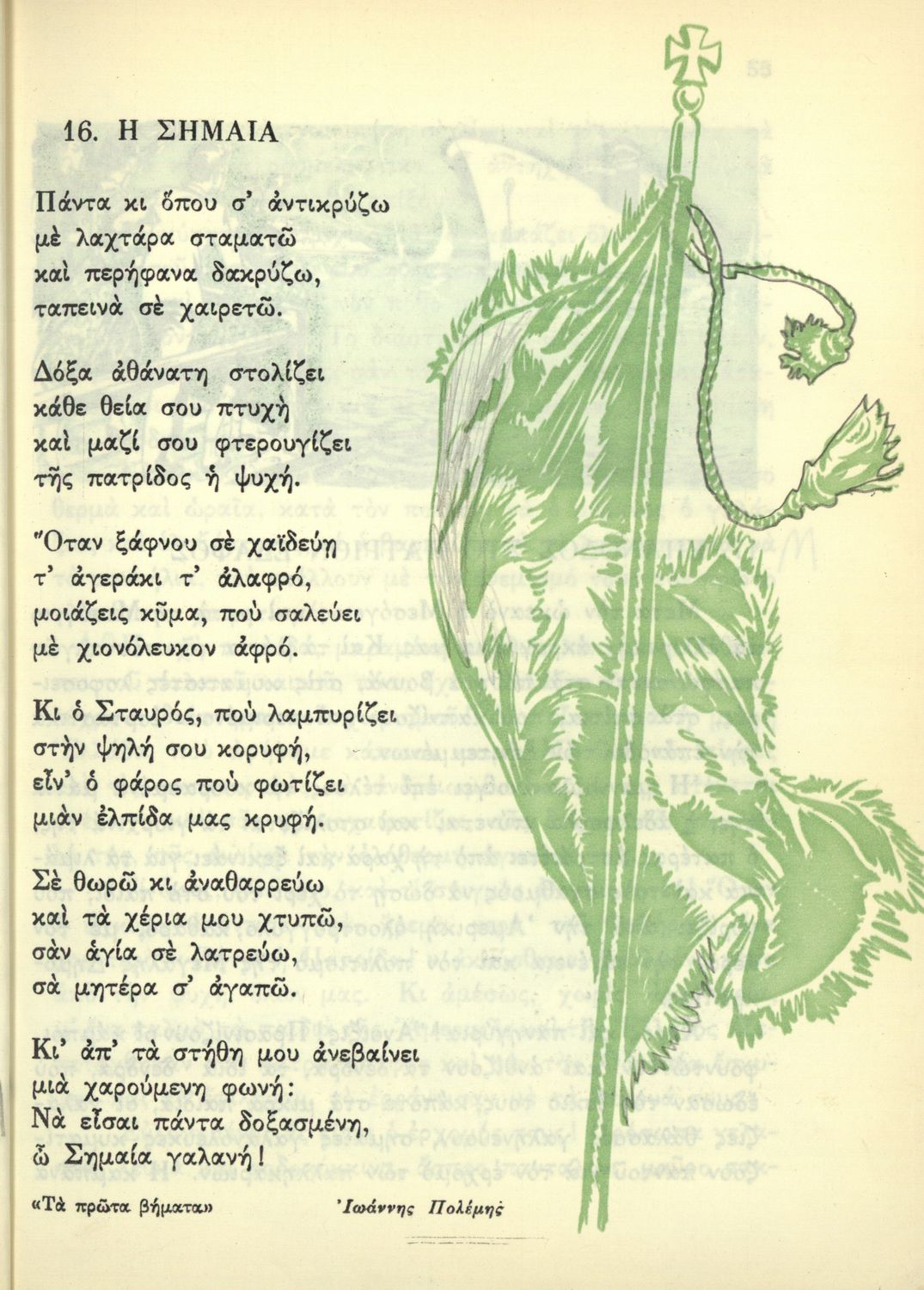 Αναγνωστικό Ε΄ Δημοτικού που περιέχει κείμενα εμπνευσμένα από την εθνική, κοινωνική και οικογενειακή ζωή και την ελληνική φύση, μυθολογία και ιστορία. Φέρει το σύμβολο της δικτατορίας.