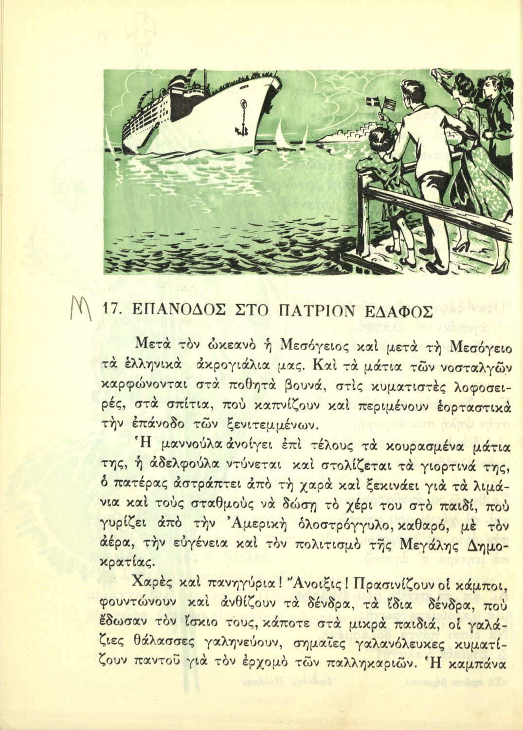 Αναγνωστικό Ε΄ Δημοτικού που περιέχει πεζά και ποιήματα εμπνευσμένα από τη θρησκευτική, εθνική, κοινωνική ζωή καθώς και από τις ασχολίες των Ελλήνων, την αρχαία και σύγχρονη ελληνική ιστορία και τον πολιτισμό.