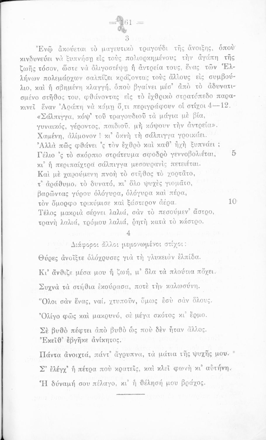 Σχολικό εγχειρίδιο Νέων Ελληνικών ΣΤ΄ Γυμνασίου και Λυκείου που περιλαμβάνει κείμενα Ελλήνων και ξένων συγγραφέων με θέματα από την σύγχρονη ελληνική ιστορία και την οικογενειακή και θρησκευτική ζωή, και δημοτικά τραγούδια. Περιέχει και παράρτημα με βιογραφίες των συγγραφέων και λεξιλόγιο.