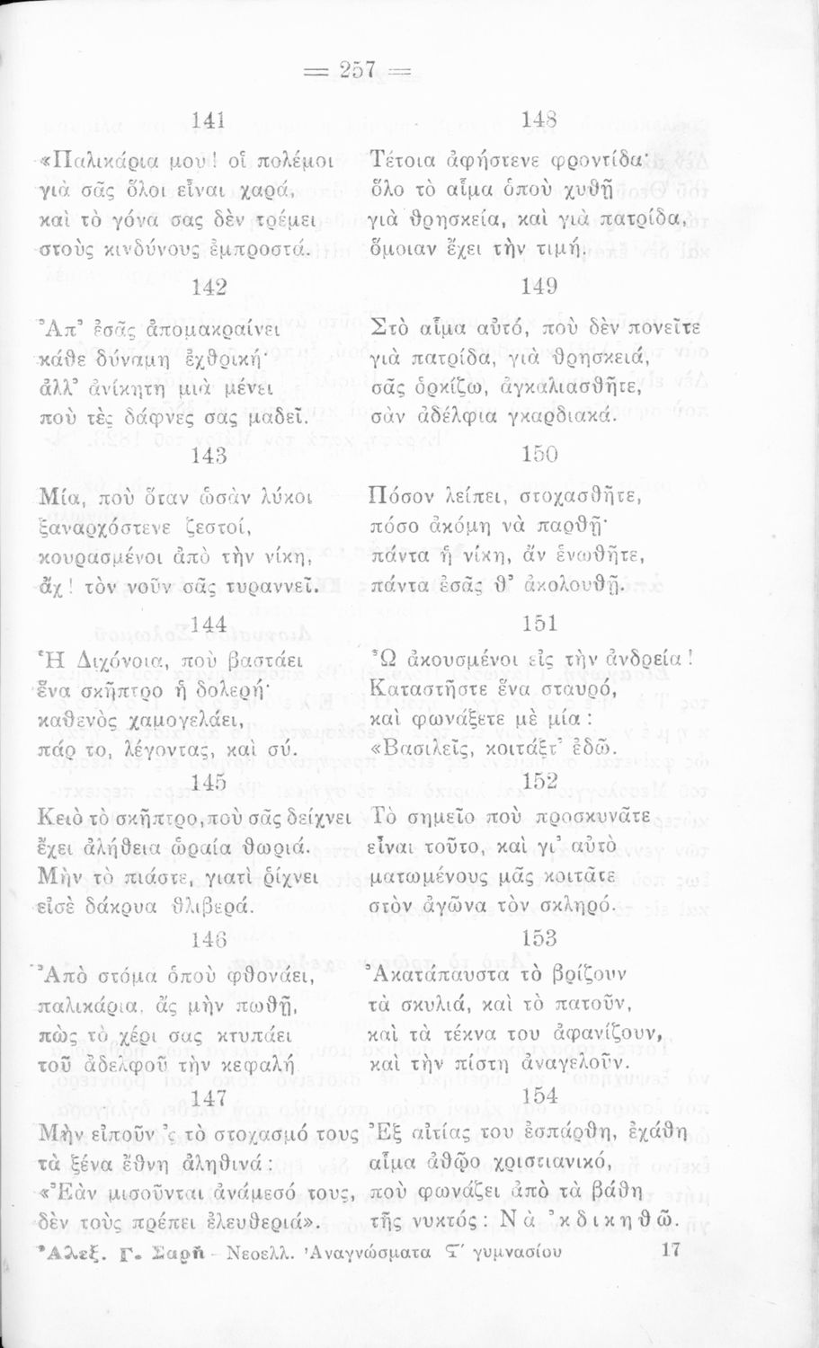 Σχολικό εγχειρίδιο Νέων Ελληνικών ΣΤ΄ Γυμνασίου και Λυκείου που περιλαμβάνει κείμενα Ελλήνων και ξένων συγγραφέων με θέματα από την σύγχρονη ελληνική ιστορία και την οικογενειακή και θρησκευτική ζωή, και δημοτικά τραγούδια. Περιέχει και παράρτημα με βιογραφίες των συγγραφέων και λεξιλόγιο.