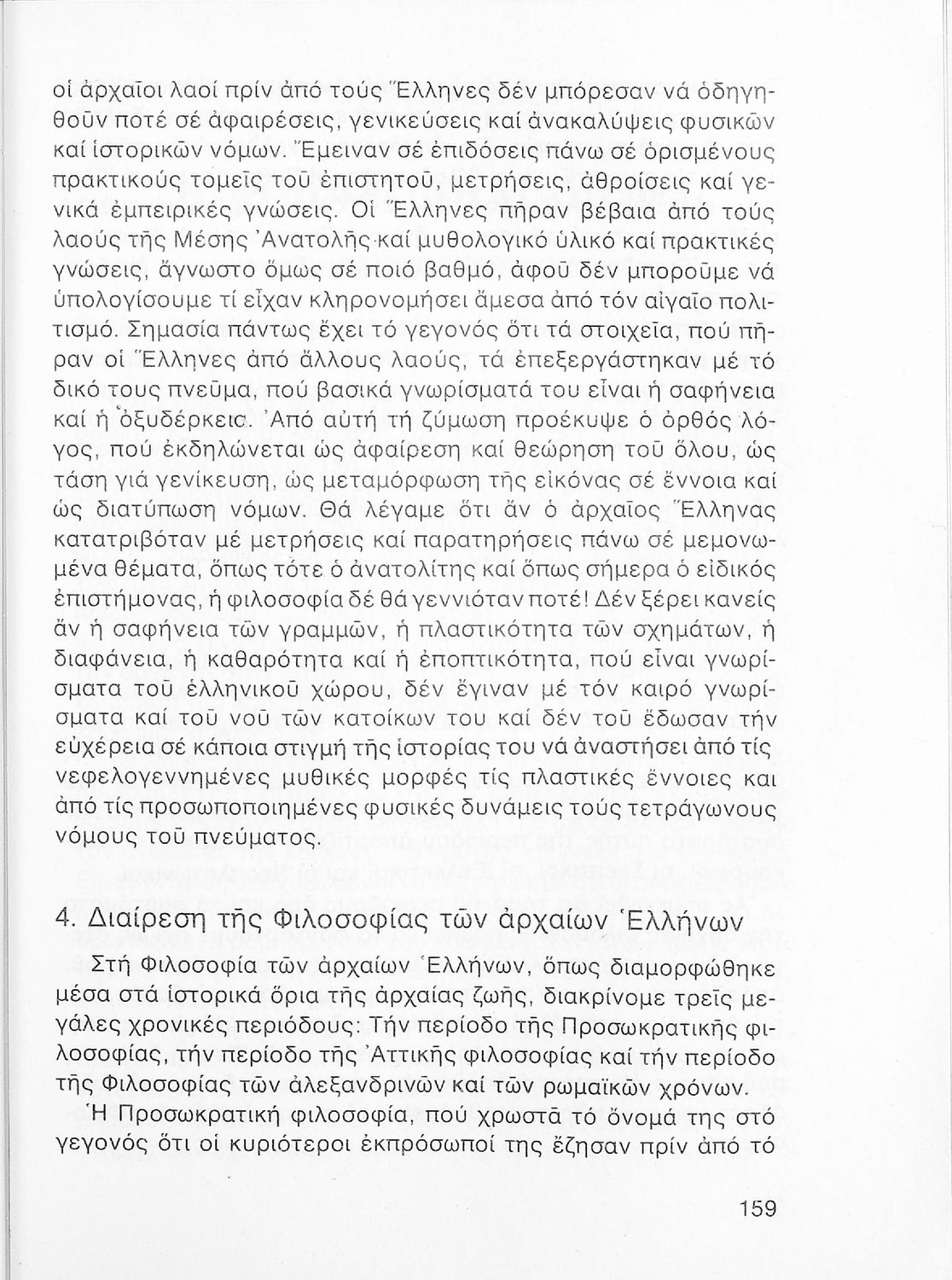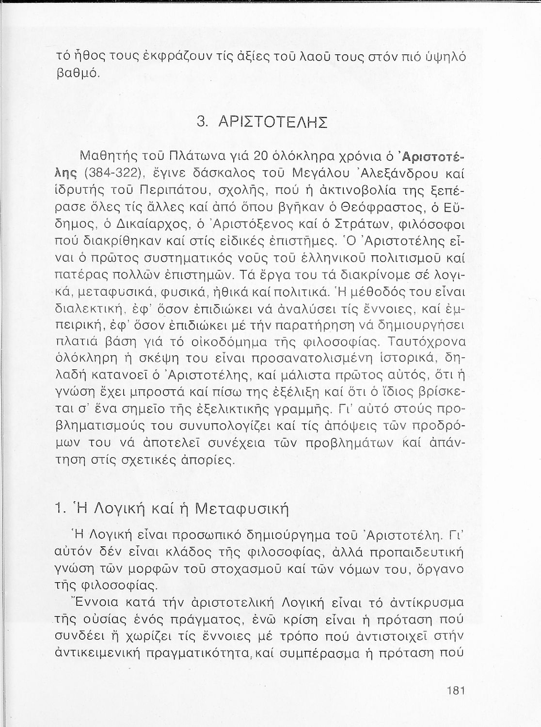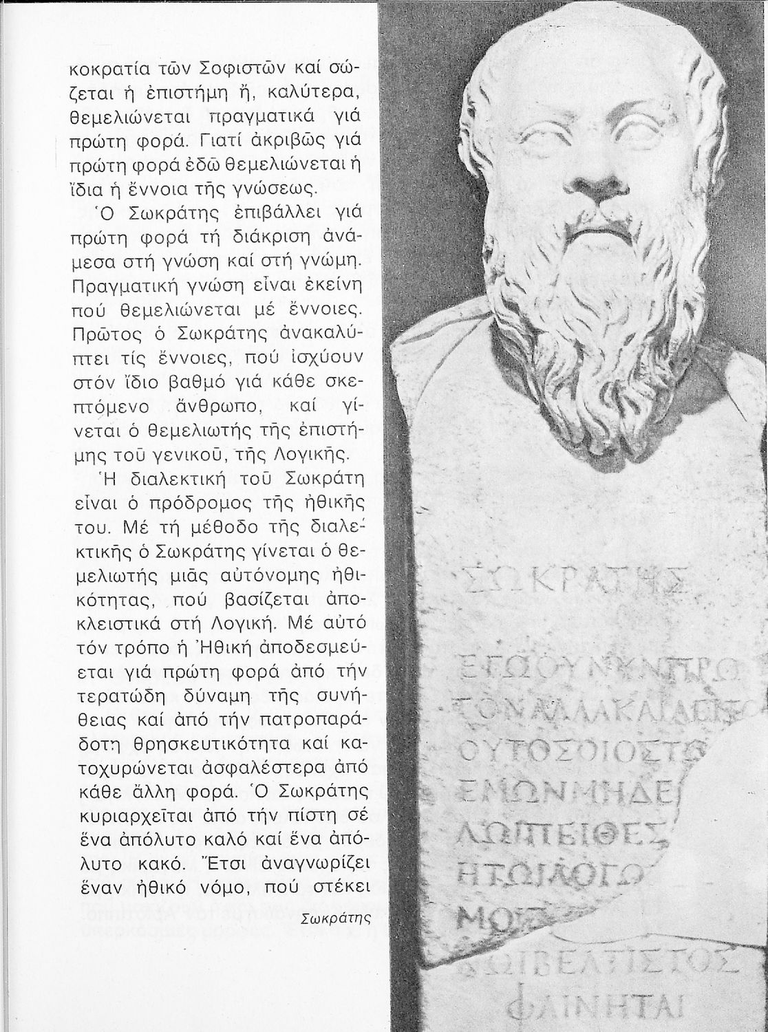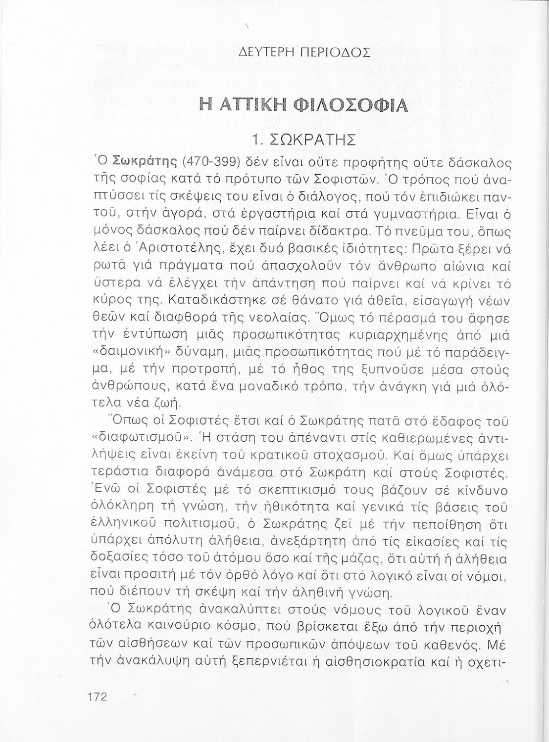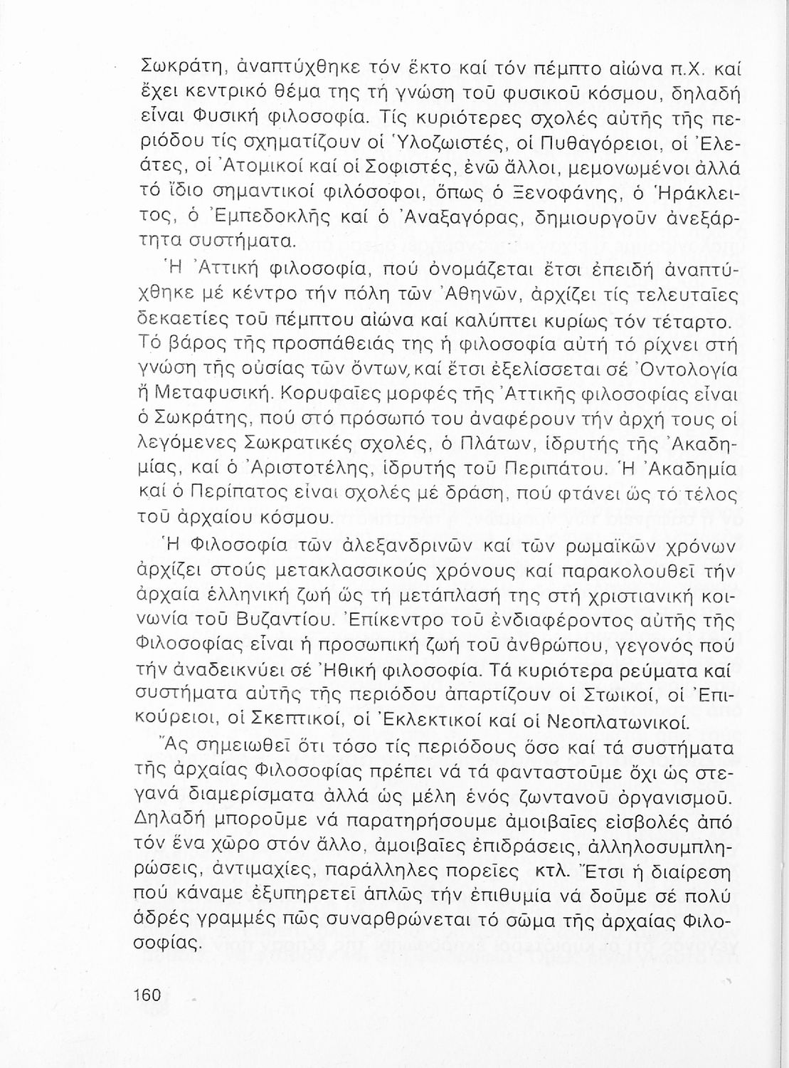 Σχολικό εγχειρίδιο Φιλοσοφίας Γ΄ Λυκείου που ακολουθεί μια ιστορική πραγμάτευση επιστημολογικών, ηθικών και αισθητικών ζητημάτων και καλύπτει δύο περιόδους: α) την ελληνική αρχαιότητα και β) την σύγχρονη ευρωπαϊκή σκέψη από τον Descartes και τον Kant στον λογικό θετικισμό και τον νεοκαντιανισμό. Περιέχει εκτενές κεφάλαιο για τους προσωκρατικούς.