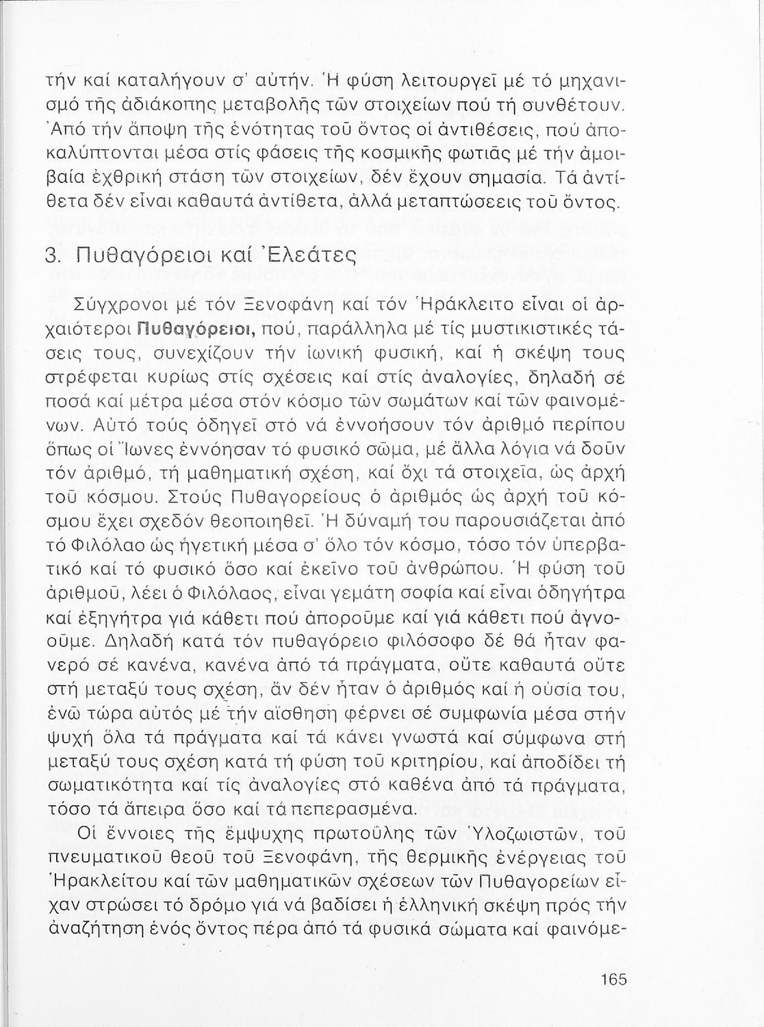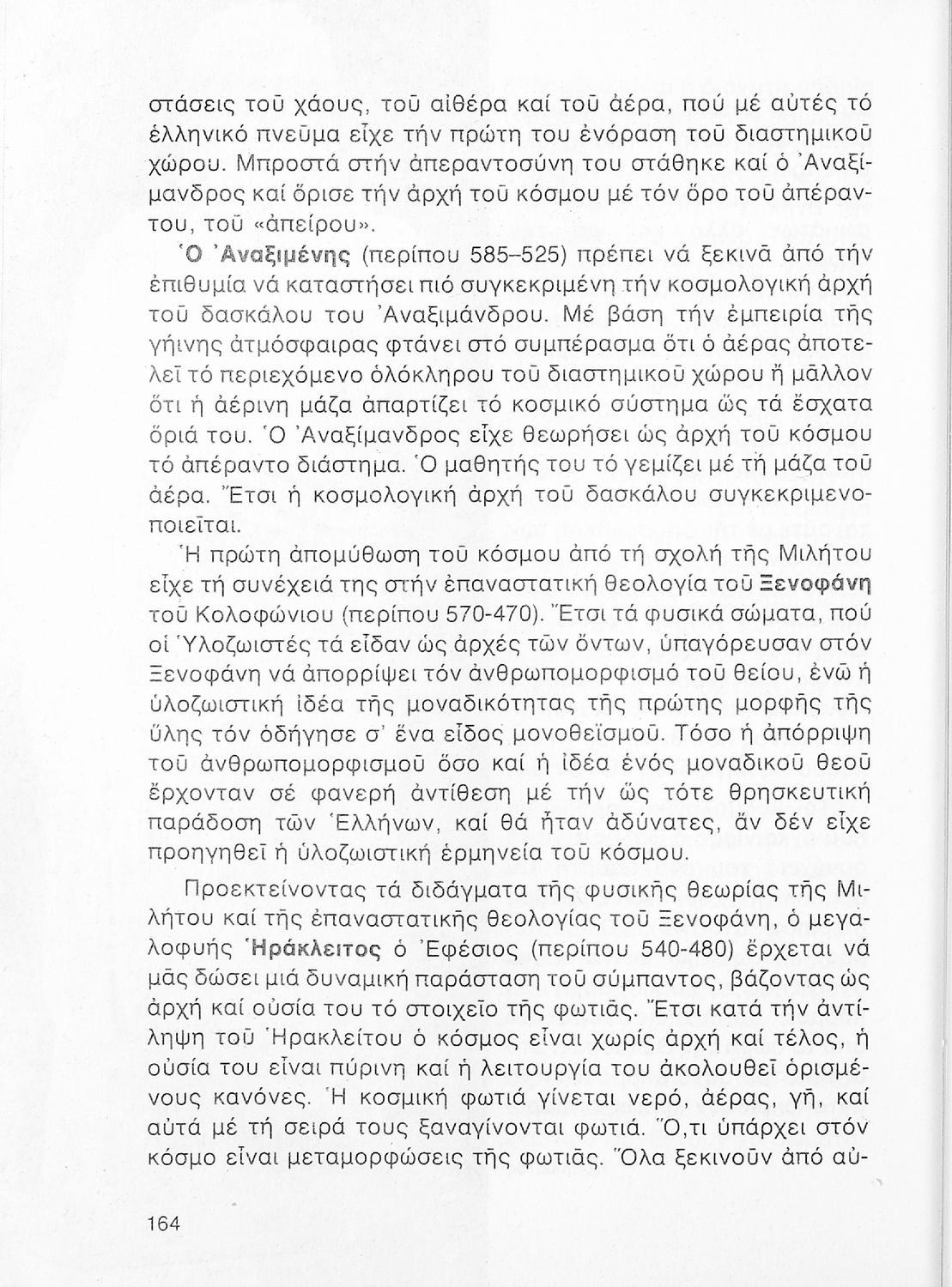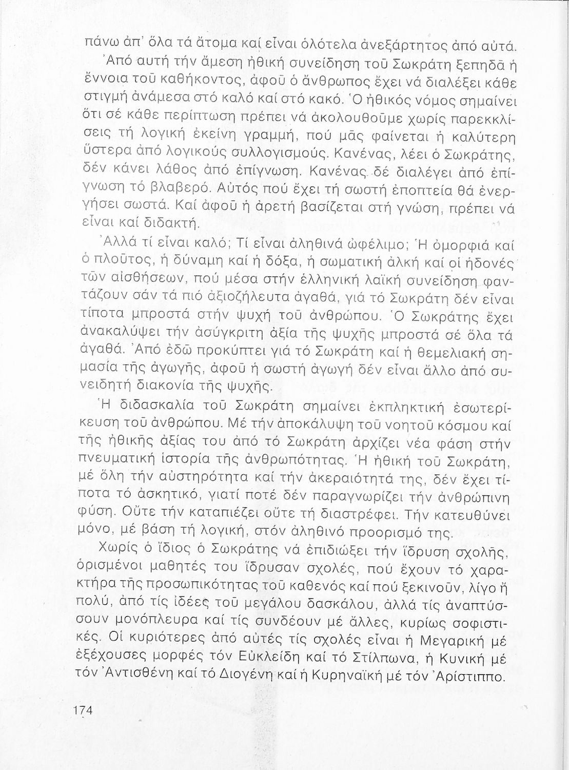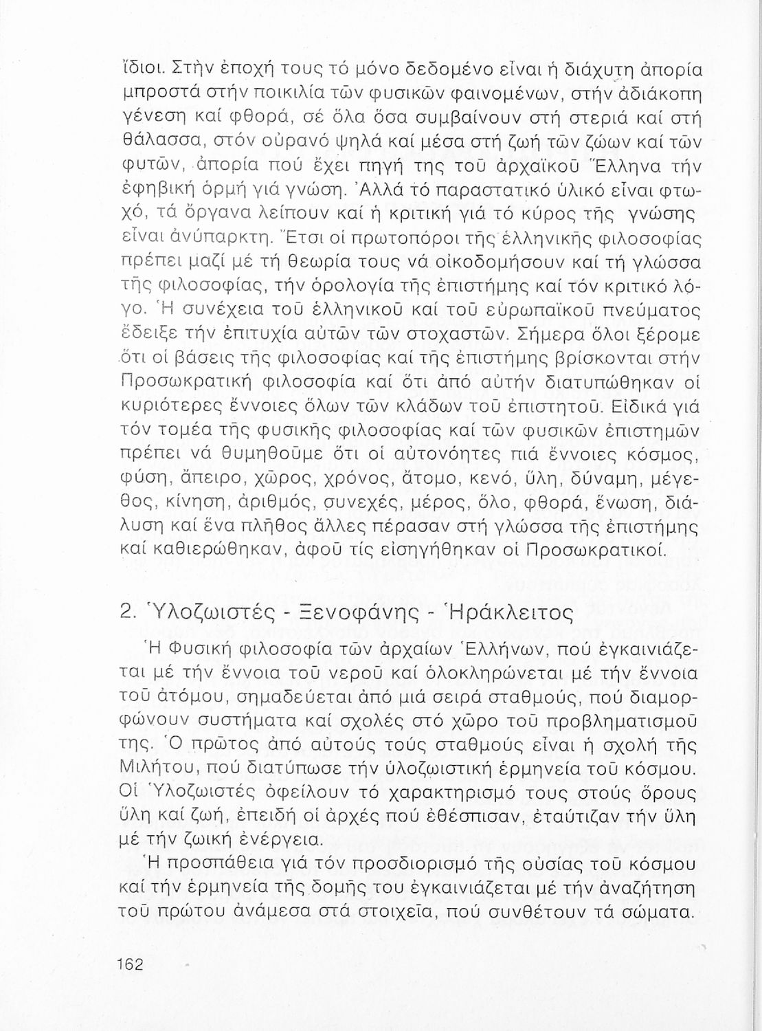 Σχολικό εγχειρίδιο Φιλοσοφίας Γ΄ Λυκείου που ακολουθεί μια ιστορική πραγμάτευση επιστημολογικών, ηθικών και αισθητικών ζητημάτων και καλύπτει δύο περιόδους: α) την ελληνική αρχαιότητα και β) την σύγχρονη ευρωπαϊκή σκέψη από τον Descartes και τον Kant στον λογικό θετικισμό και τον νεοκαντιανισμό. Περιέχει εκτενές κεφάλαιο για τους προσωκρατικούς.