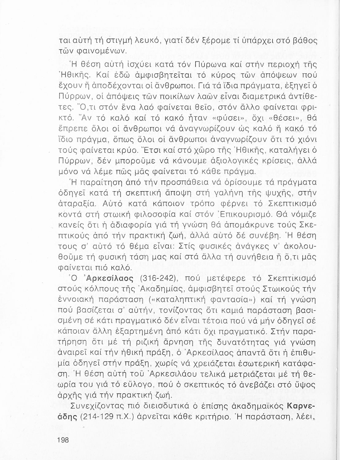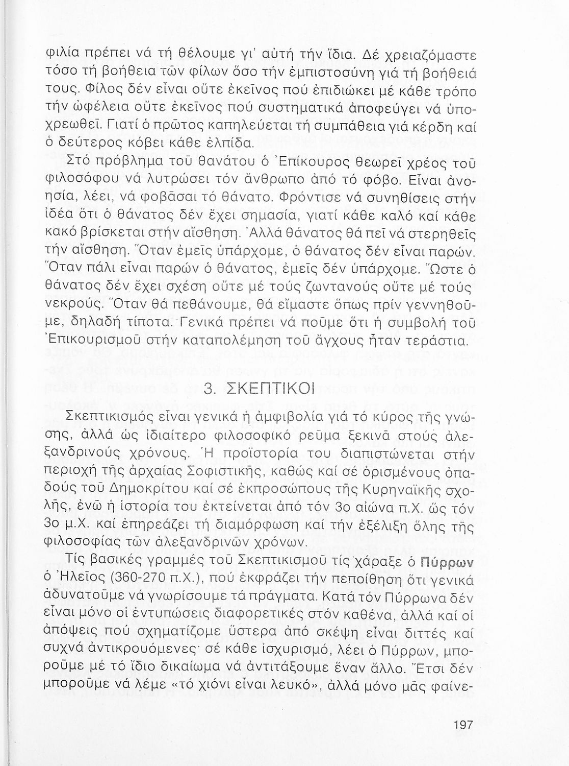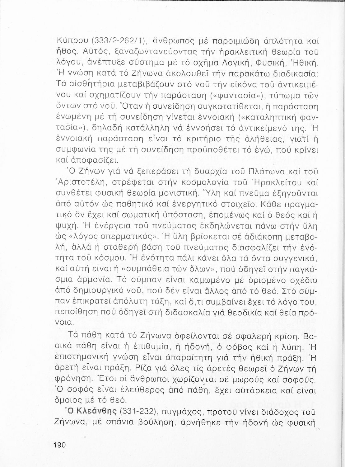 Σχολικό εγχειρίδιο Φιλοσοφίας Γ΄ Λυκείου που ακολουθεί μια ιστορική πραγμάτευση επιστημολογικών, ηθικών και αισθητικών ζητημάτων και καλύπτει δύο περιόδους: α) την ελληνική αρχαιότητα και β) την σύγχρονη ευρωπαϊκή σκέψη από τον Descartes και τον Kant στον λογικό θετικισμό και τον νεοκαντιανισμό. Περιέχει εκτενές κεφάλαιο για τους προσωκρατικούς.