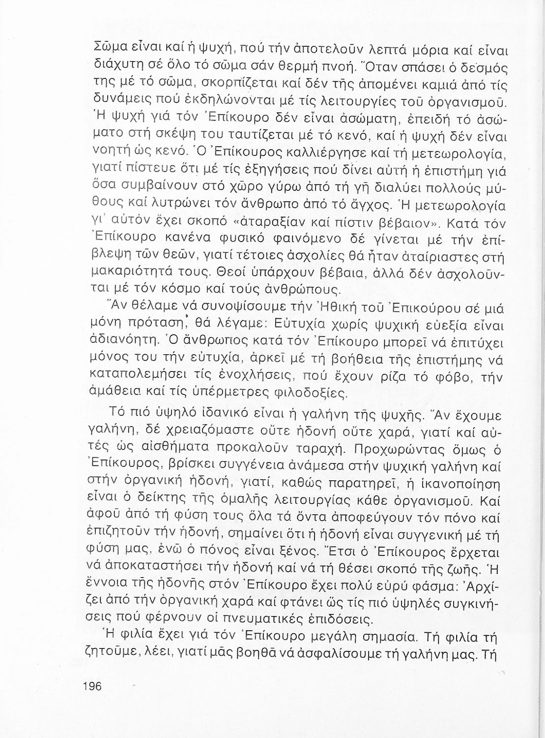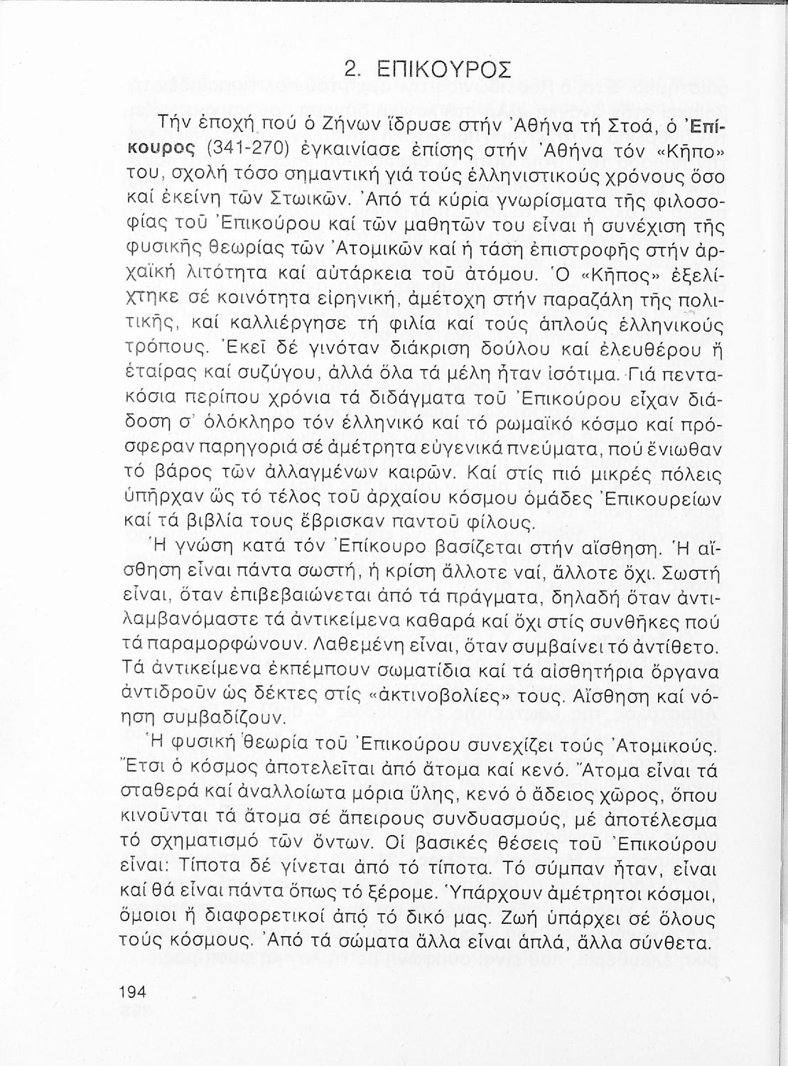 Βαθμίδα εκπαίδευσης: Δευτεροβάθμια Τάξη: Γ' Λυκείου Μάθημα: Φιλοσοφία Γλώσσα: Δημοτική Παρουσίαση περιεχομένου: Σχολικό εγχειρίδιο Φιλοσοφίας Γ΄ Λυκείου που ακολουθεί μια ιστορική πραγμάτευση επιστημολογικών, ηθικών και αισθητικών ζητημάτων και καλύπτει δύο περιόδους: α) την ελληνική αρχαιότητα και β) την σύγχρονη ευρωπαϊκή σκέψη από τον Descartes και τον Kant στον λογικό θετικισμό και τον νεοκαντιανισμό. Περιέχει εκτενές κεφάλαιο για τους προσωκρατικούς. |