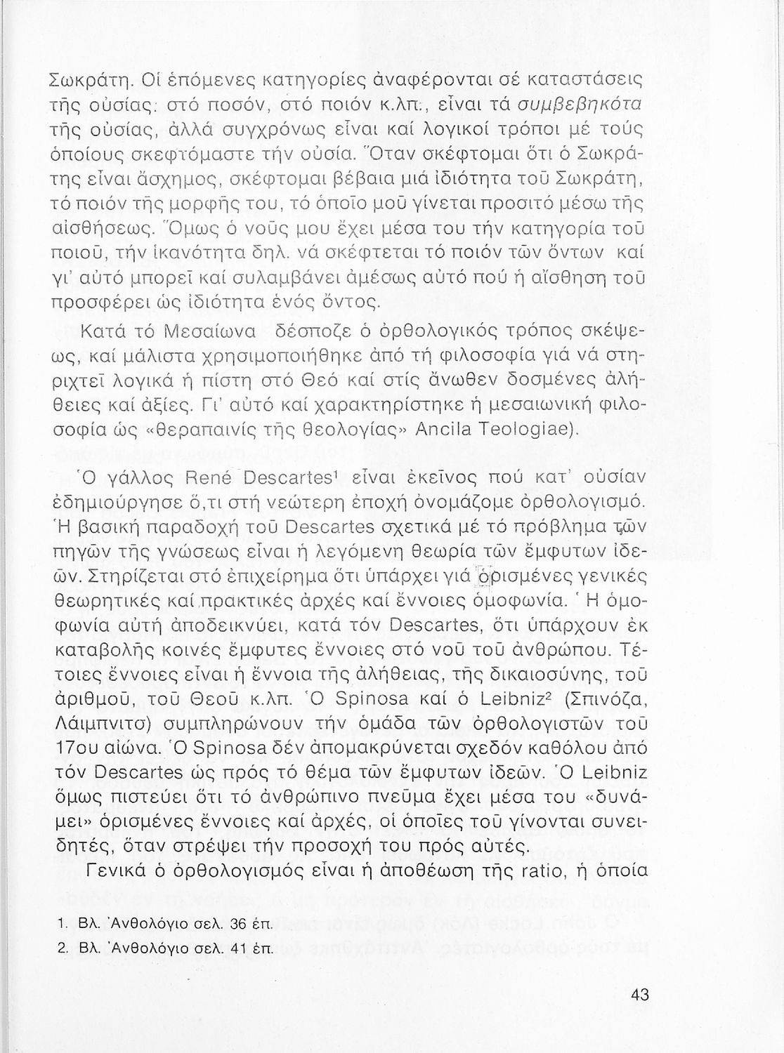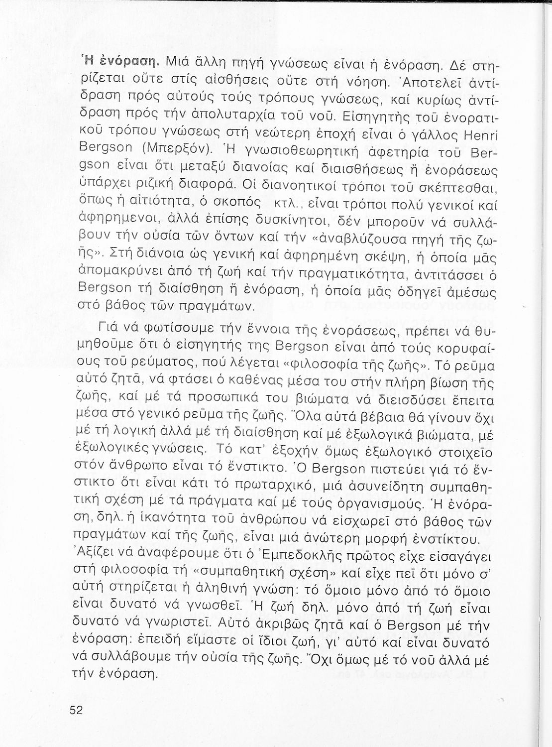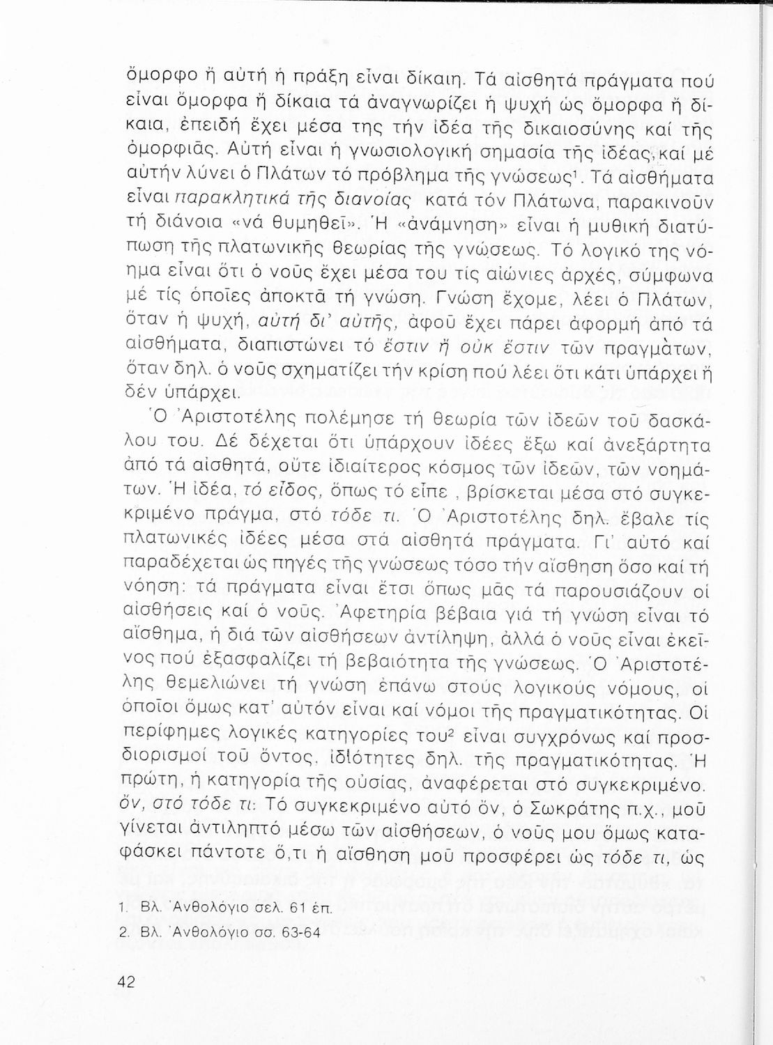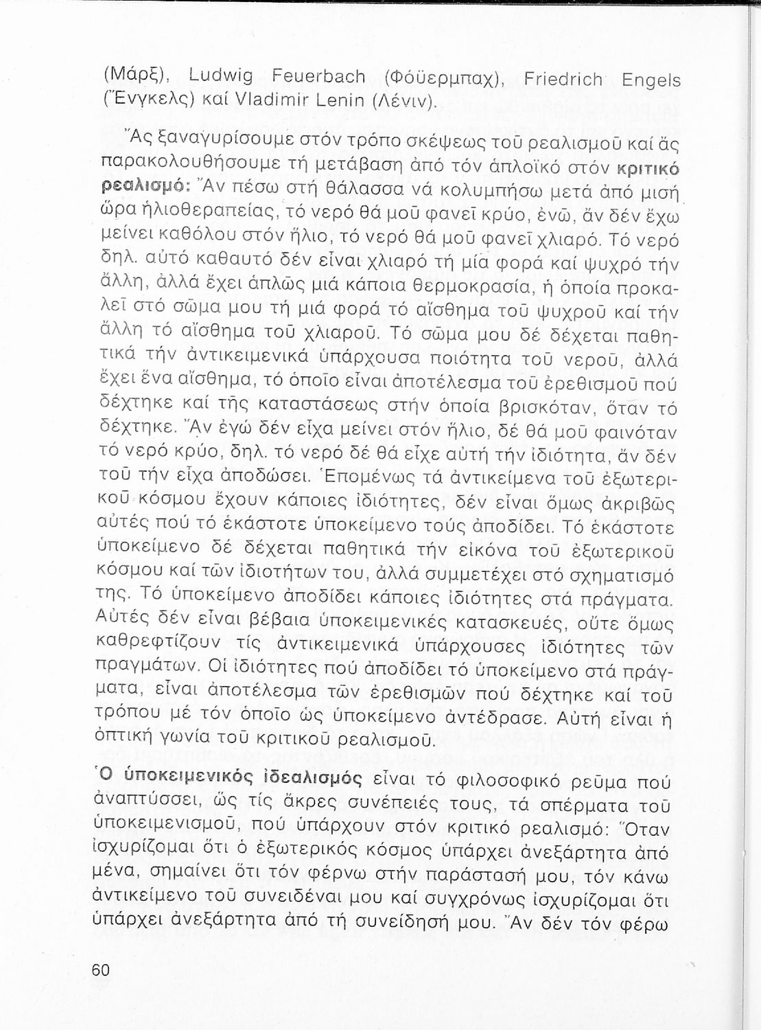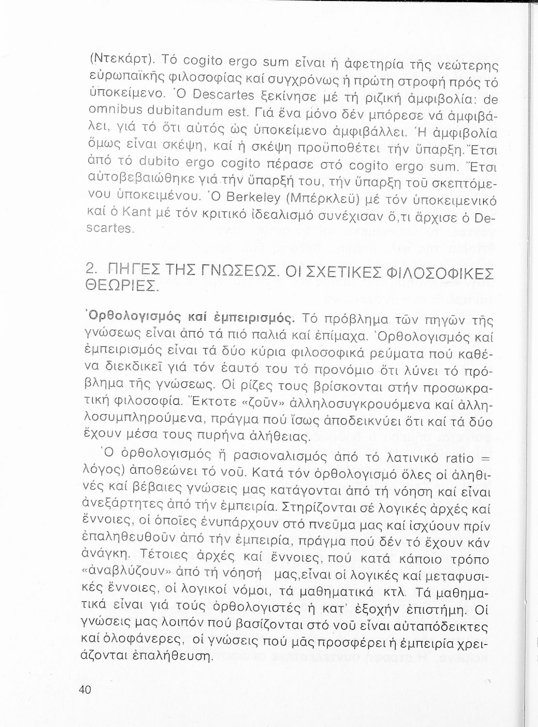 Σχολικό εγχειρίδιο Φιλοσοφίας Γ΄ Λυκείου που ακολουθεί μια ιστορική πραγμάτευση επιστημολογικών, ηθικών και αισθητικών ζητημάτων και καλύπτει δύο περιόδους: α) την ελληνική αρχαιότητα και β) την σύγχρονη ευρωπαϊκή σκέψη από τον Descartes και τον Kant στον λογικό θετικισμό και τον νεοκαντιανισμό. Περιέχει εκτενές κεφάλαιο για τους προσωκρατικούς.
