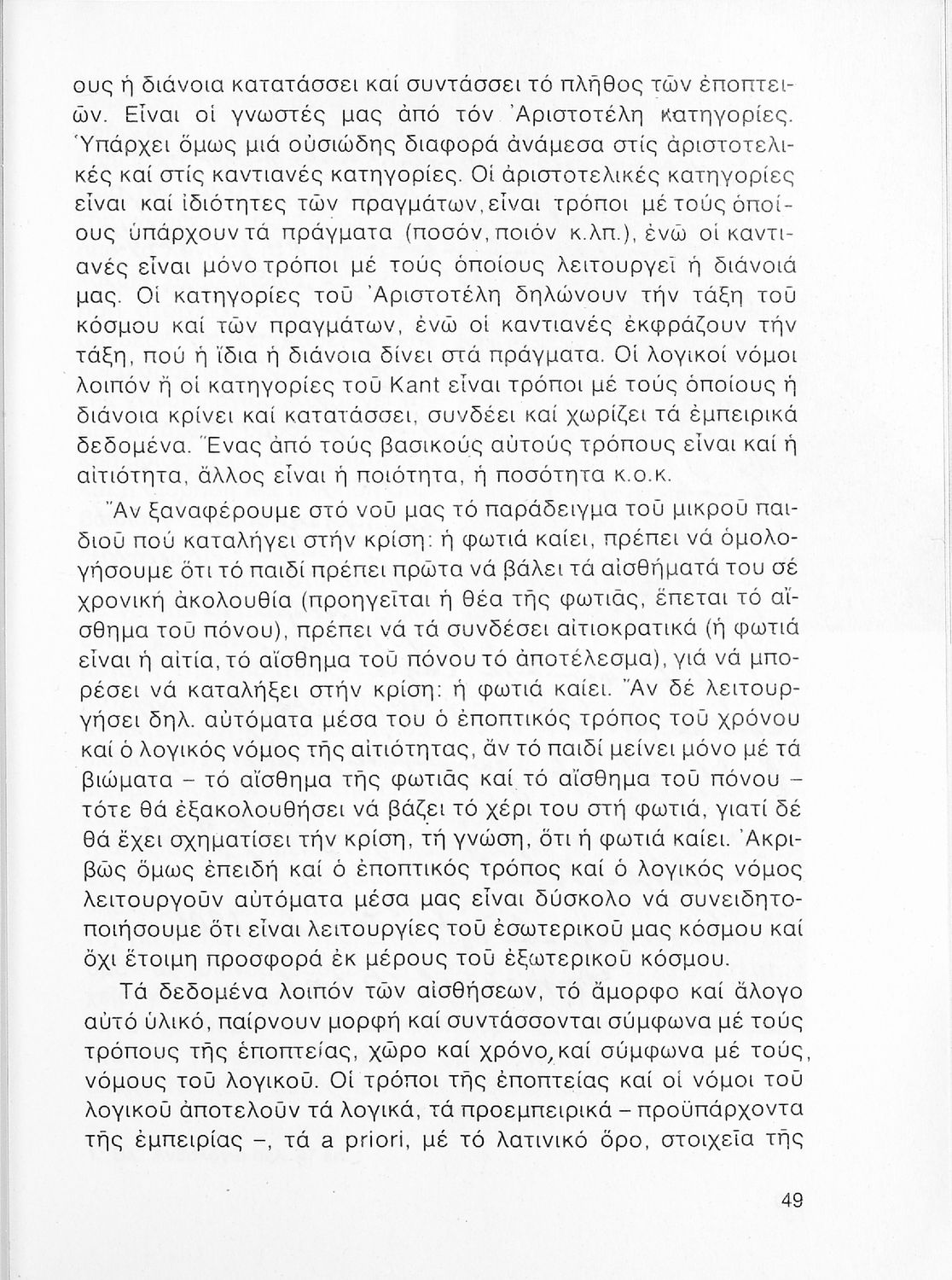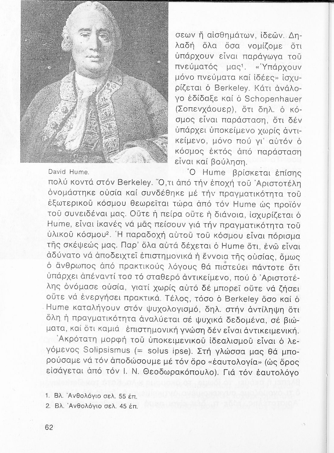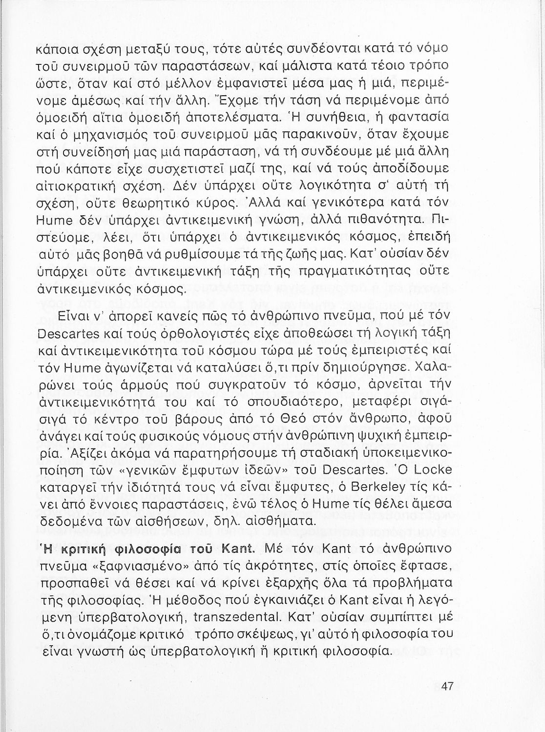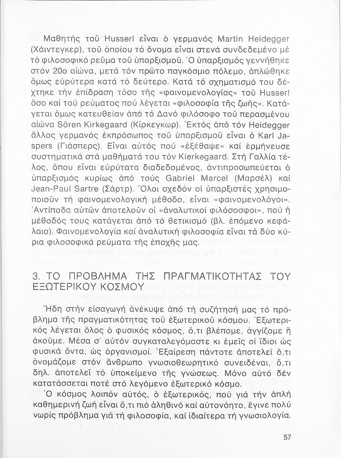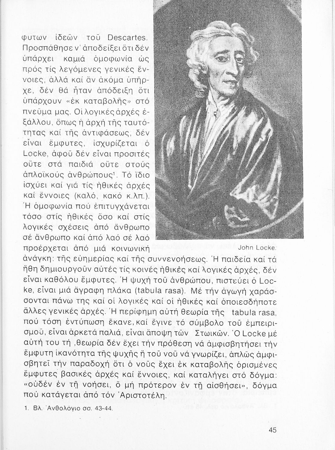 Σχολικό εγχειρίδιο Φιλοσοφίας Γ΄ Λυκείου που ακολουθεί μια ιστορική πραγμάτευση επιστημολογικών, ηθικών και αισθητικών ζητημάτων και καλύπτει δύο περιόδους: α) την ελληνική αρχαιότητα και β) την σύγχρονη ευρωπαϊκή σκέψη από τον Descartes και τον Kant στον λογικό θετικισμό και τον νεοκαντιανισμό. Περιέχει εκτενές κεφάλαιο για τους προσωκρατικούς.