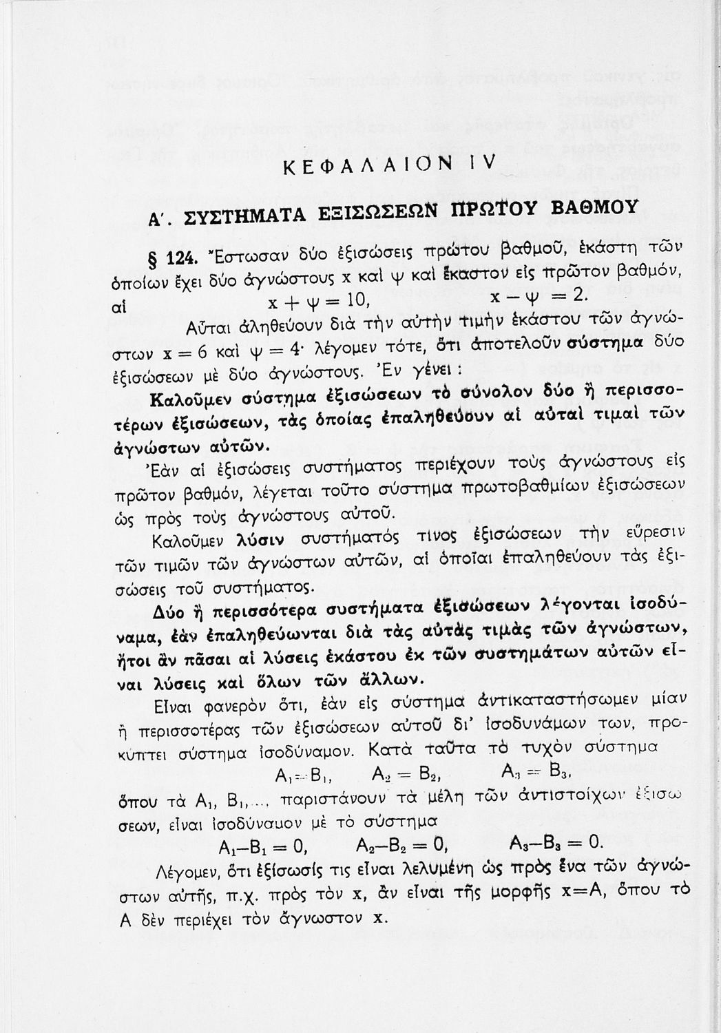 Παρουσίαση περιεχομένου: Σχολικό εγχειρίδιο Άλγεβρας Δ΄ Γυμνασίου που εστιάζει στις ιδιότητες των αριθμών, στις εξισώσεις, στους λογάριθμους και στις παραγώγους. Ο συγγραφέας ήταν καθηγητής στο Πανεπιστήμιο. Φέρει το σύμβολο της δικτατορίας.