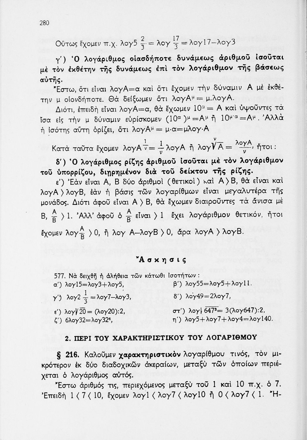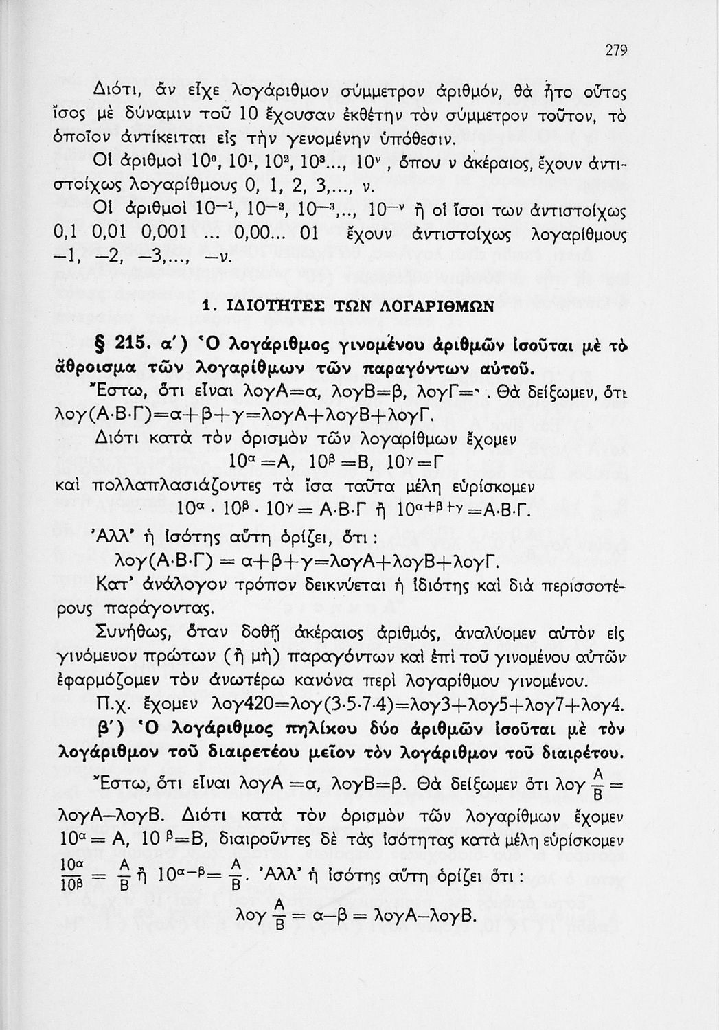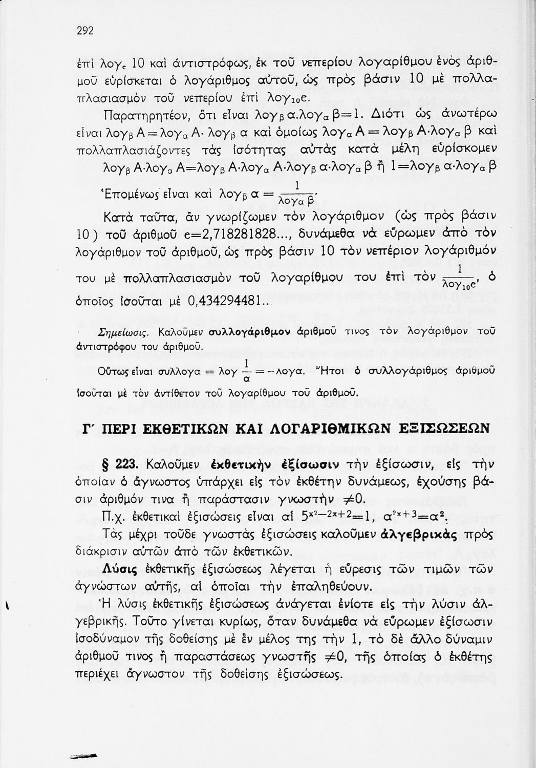 Παρουσίαση περιεχομένου: Σχολικό εγχειρίδιο Άλγεβρας Δ΄ Γυμνασίου που εστιάζει στις ιδιότητες των αριθμών, στις εξισώσεις, στους λογάριθμους και στις παραγώγους. Ο συγγραφέας ήταν καθηγητής στο Πανεπιστήμιο. Φέρει το σύμβολο της δικτατορίας.