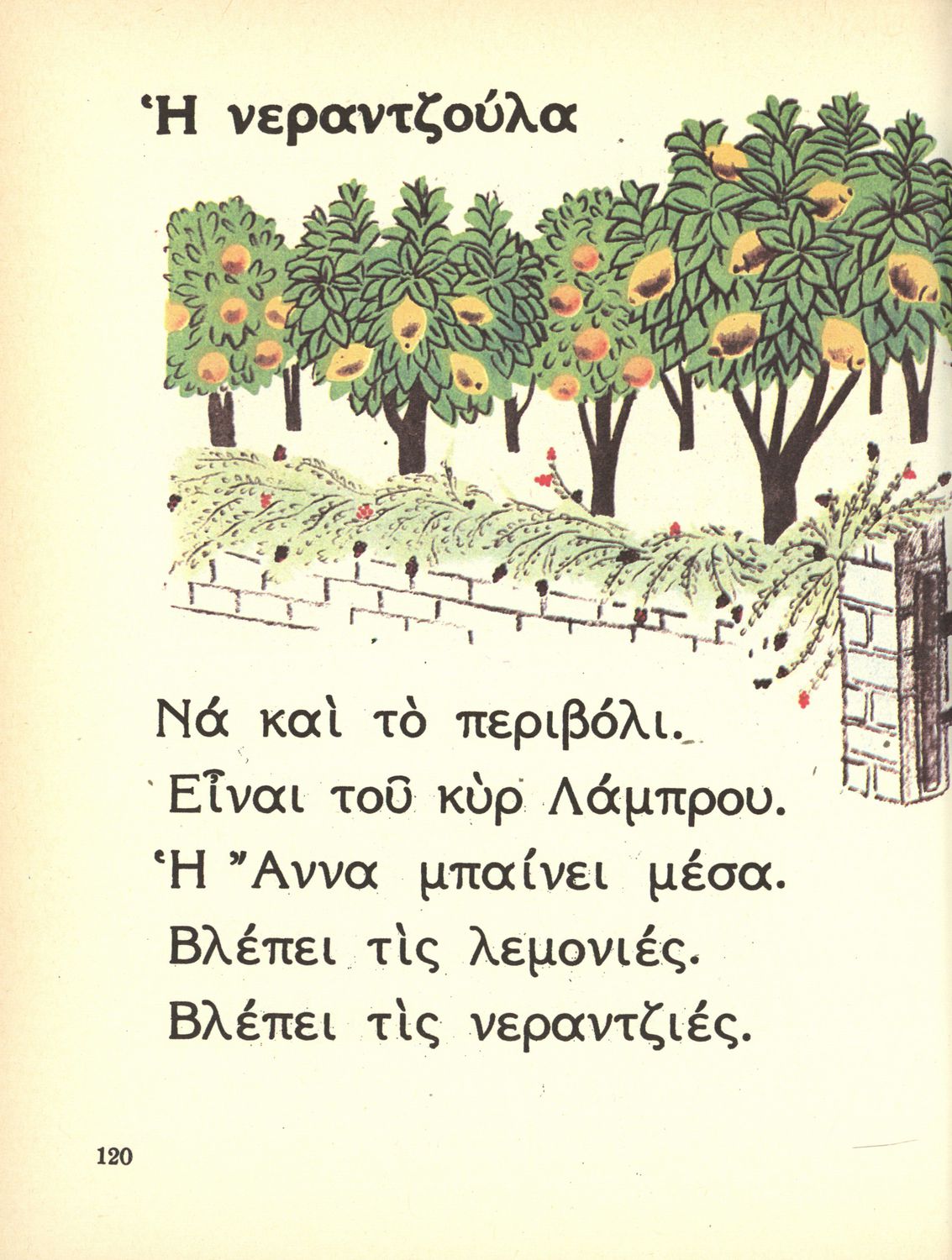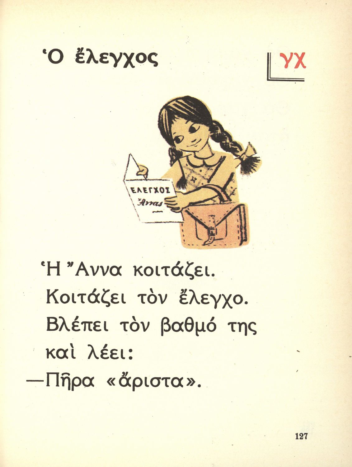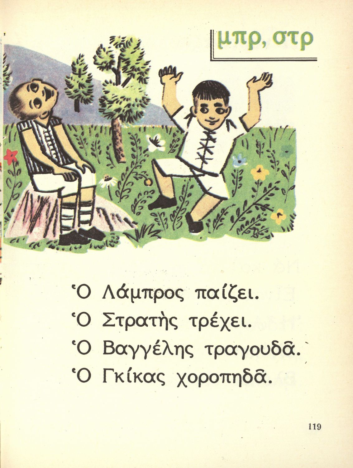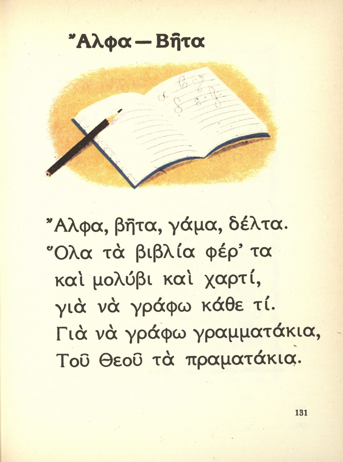 Αναγνωστικό Α΄ Δημοτικού που περιέχει γράμματα, συλλαβές, λέξεις, προτάσεις και κείμενα εμπνευσμένα από την οικογενειακή και κοινωνική ζωή του τόπου. Φέρει το σύμβολο της δικτατορίας.