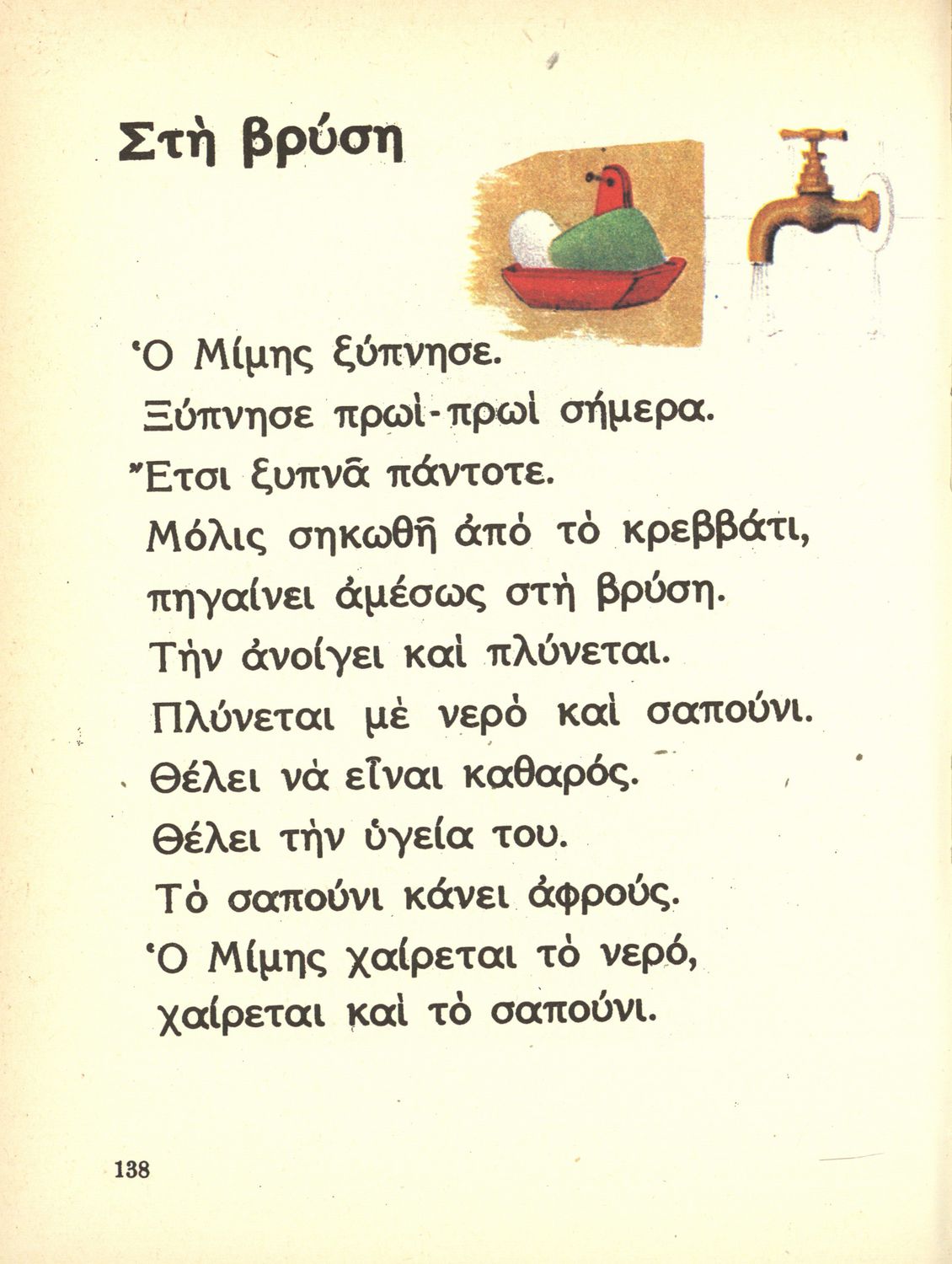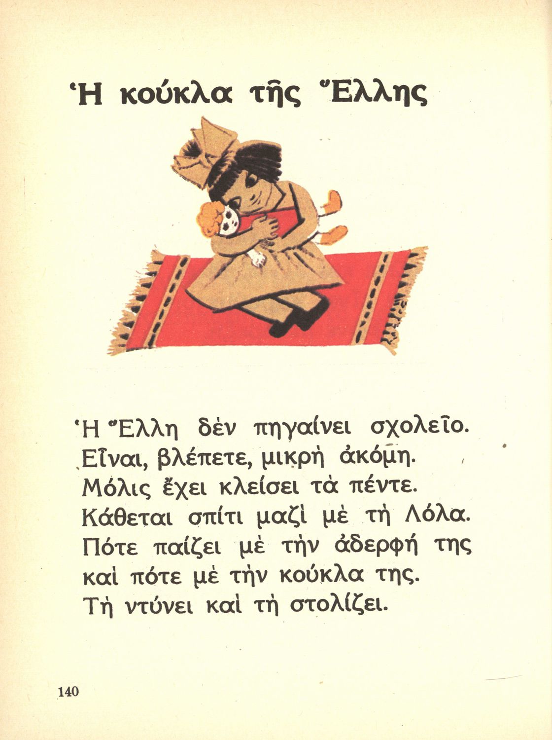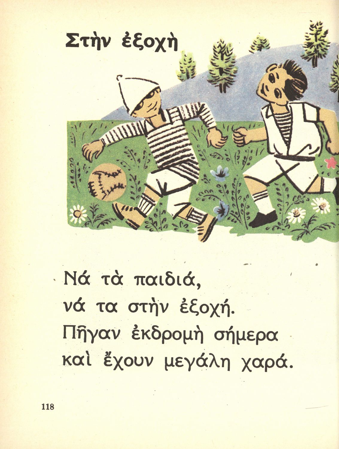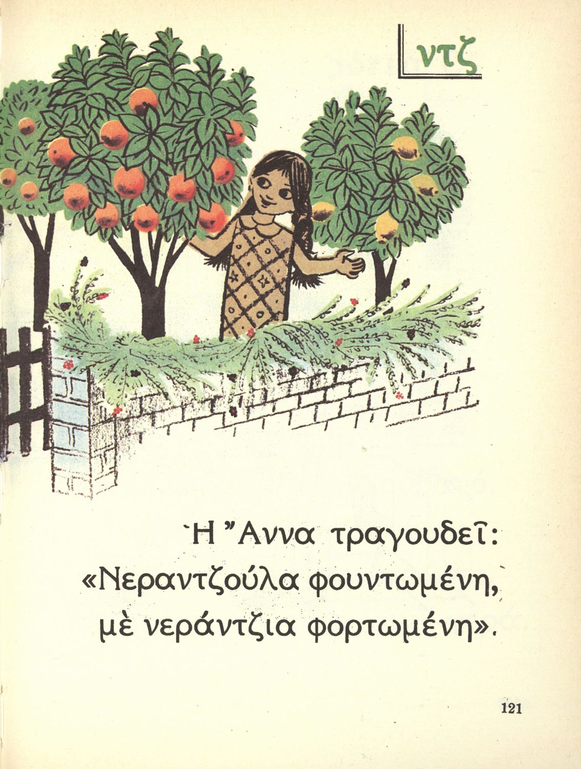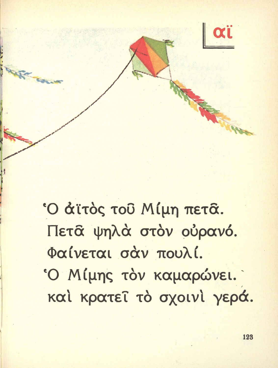 Αναγνωστικό Α΄ Δημοτικού που περιέχει γράμματα, συλλαβές, λέξεις, προτάσεις και κείμενα εμπνευσμένα από την οικογενειακή και κοινωνική ζωή του τόπου. Φέρει το σύμβολο της δικτατορίας.