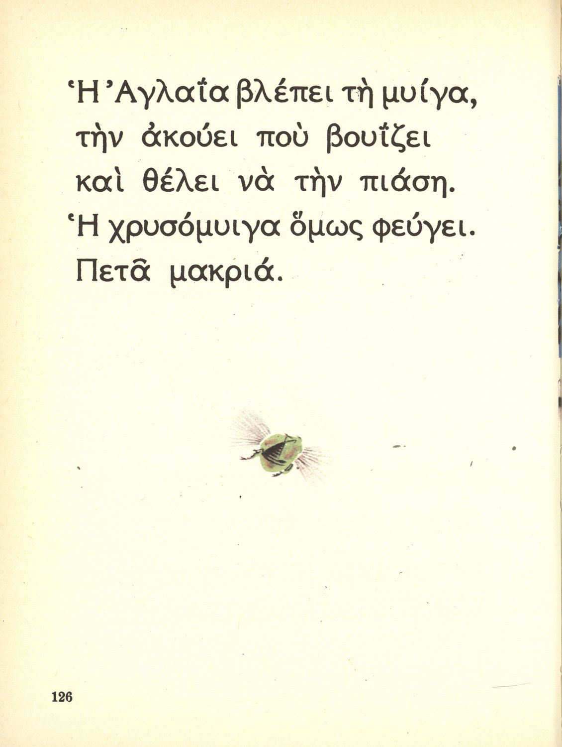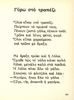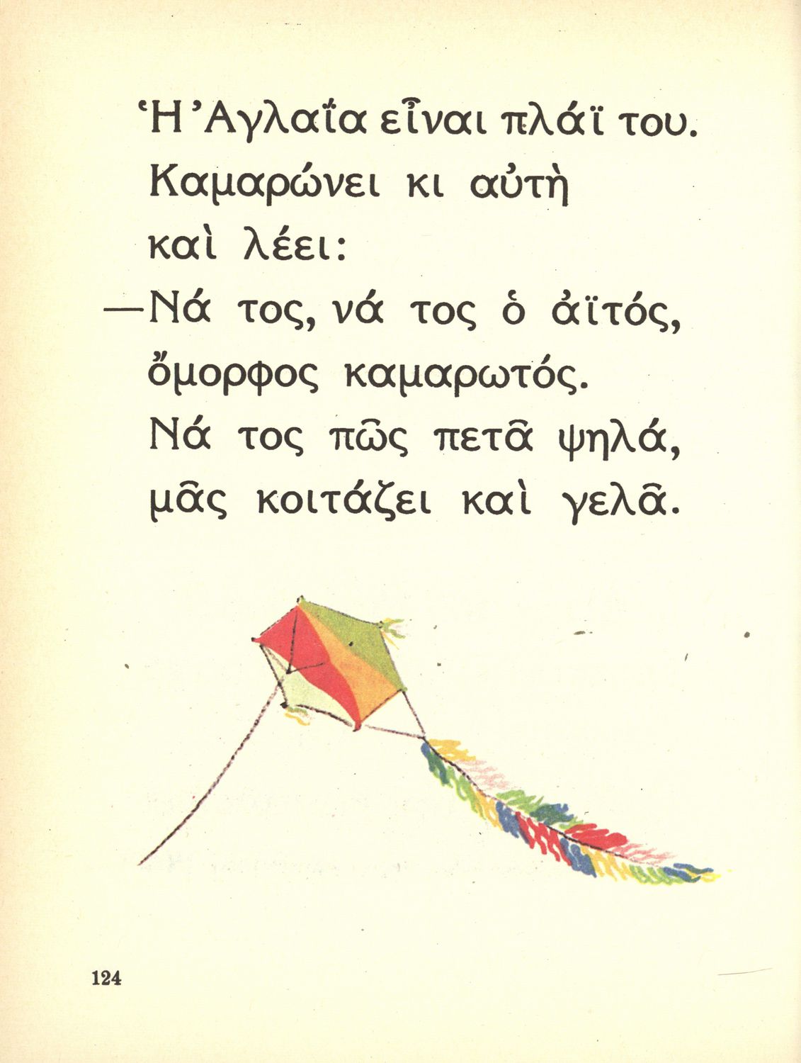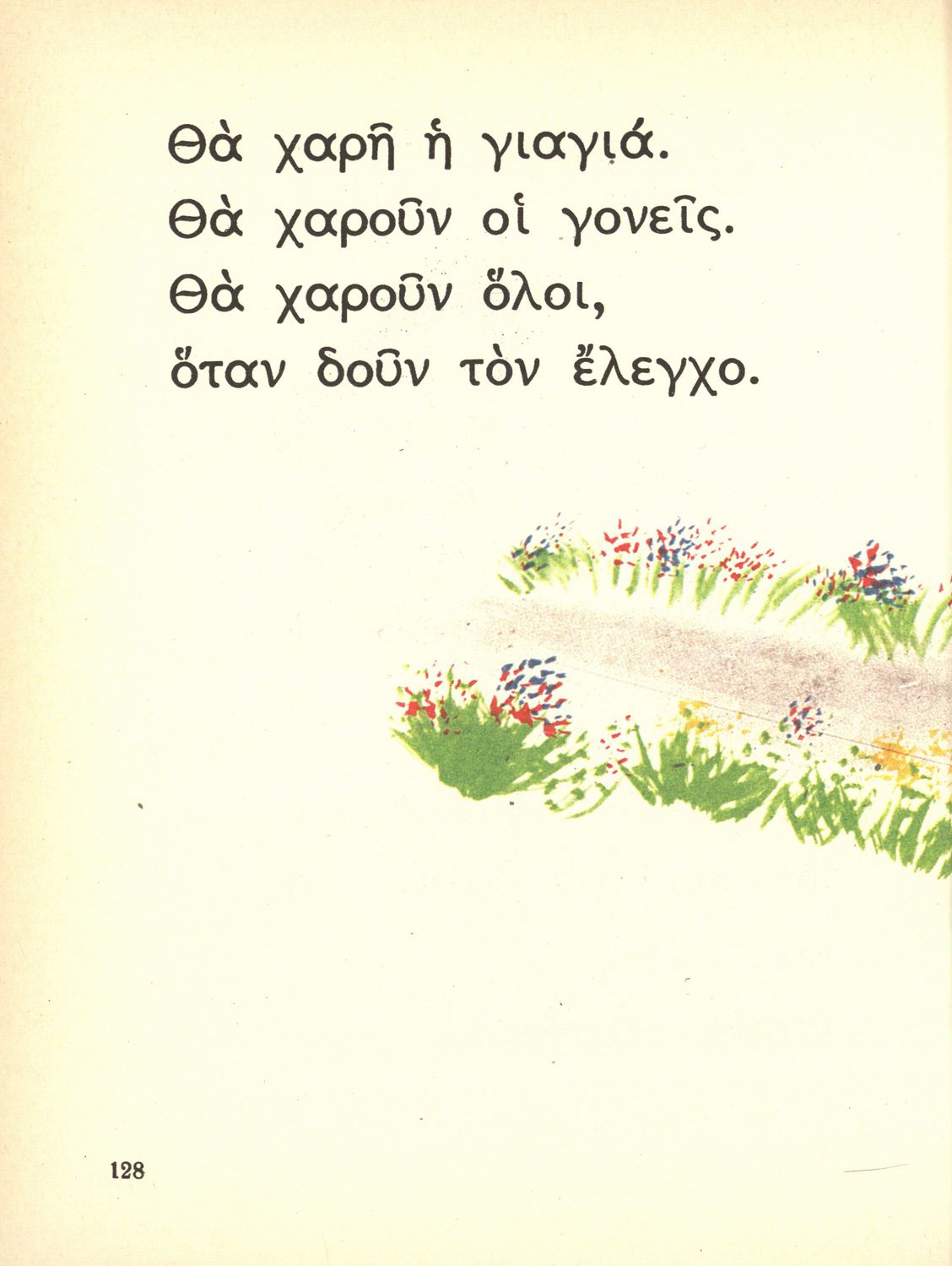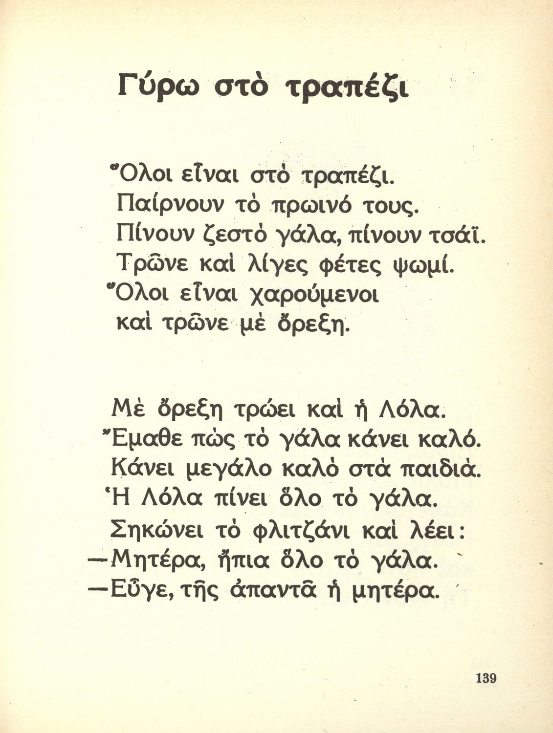 Αναγνωστικό Α΄ Δημοτικού που περιέχει γράμματα, συλλαβές, λέξεις, προτάσεις και κείμενα εμπνευσμένα από την οικογενειακή και κοινωνική ζωή του τόπου. Φέρει το σύμβολο της δικτατορίας.