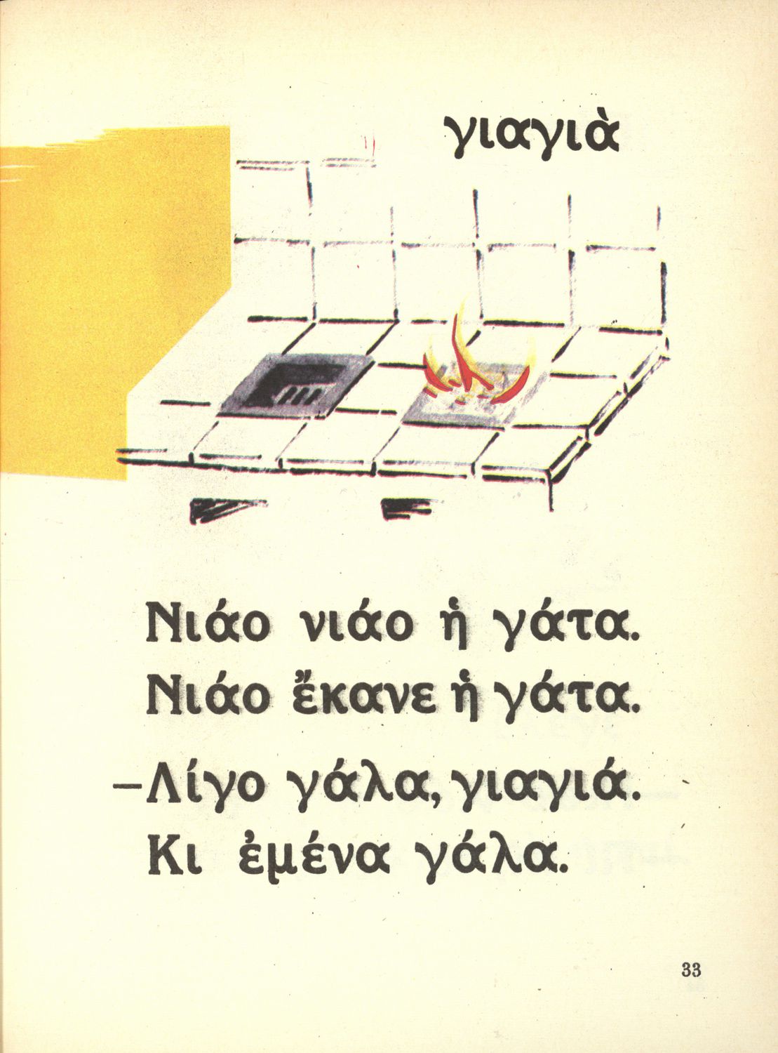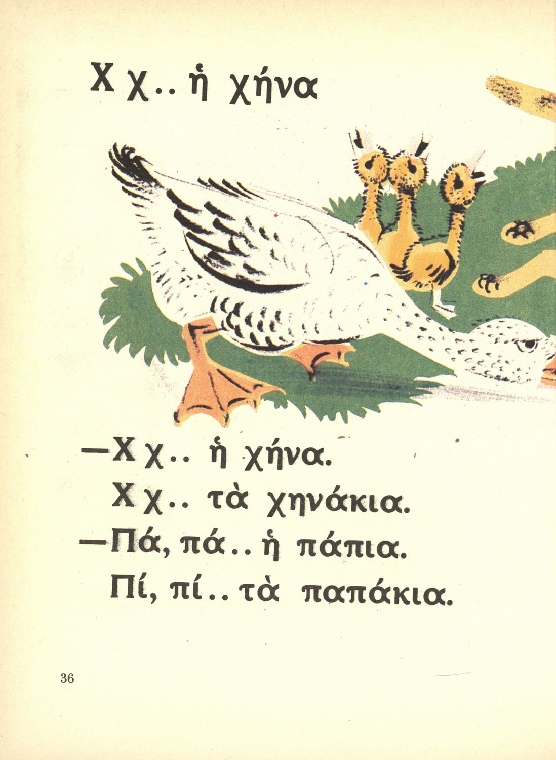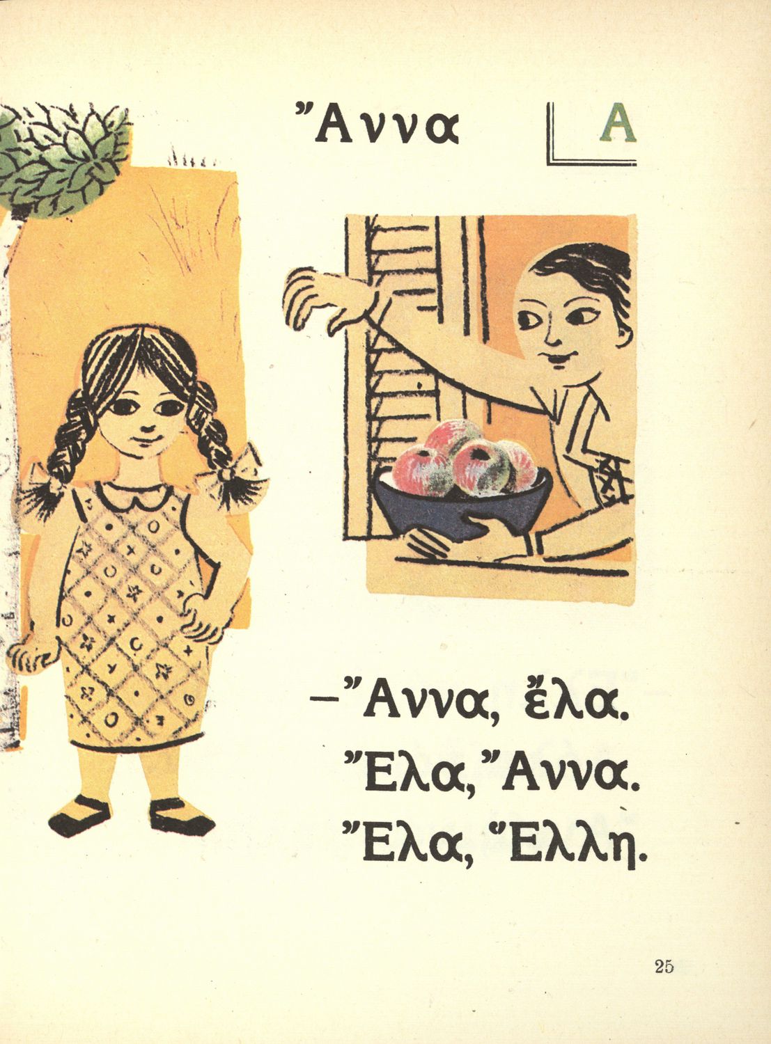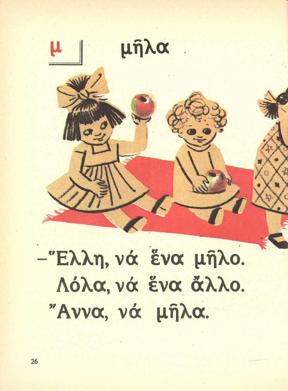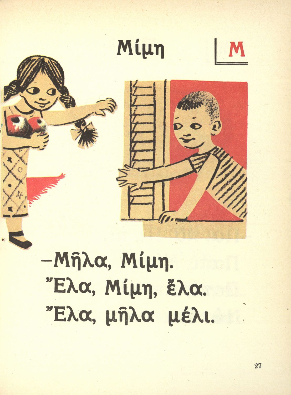 Αναγνωστικό Α΄ Δημοτικού που περιέχει γράμματα, συλλαβές, λέξεις, προτάσεις και κείμενα εμπνευσμένα από την οικογενειακή και κοινωνική ζωή του τόπου. Φέρει το σύμβολο της δικτατορίας.