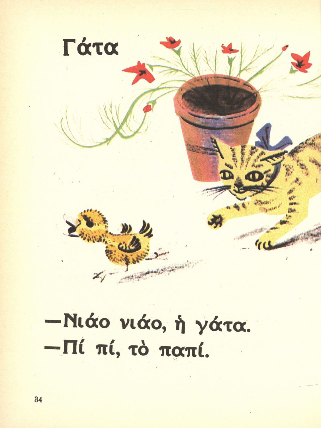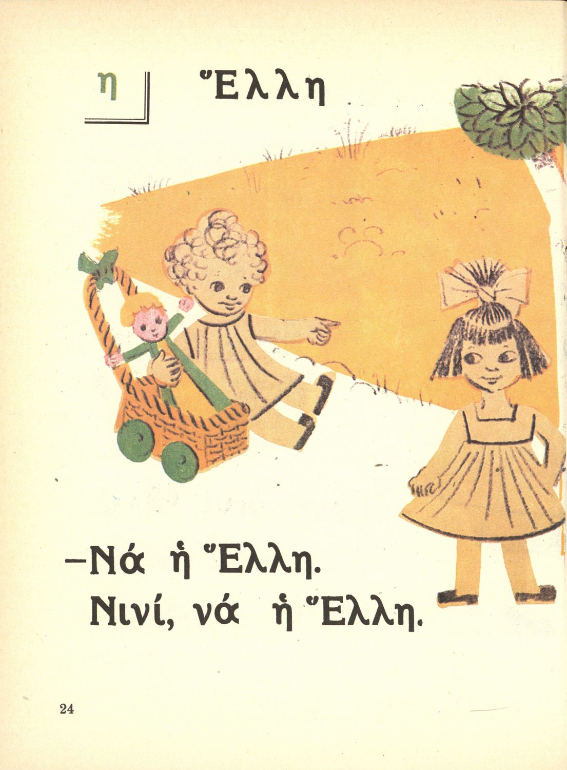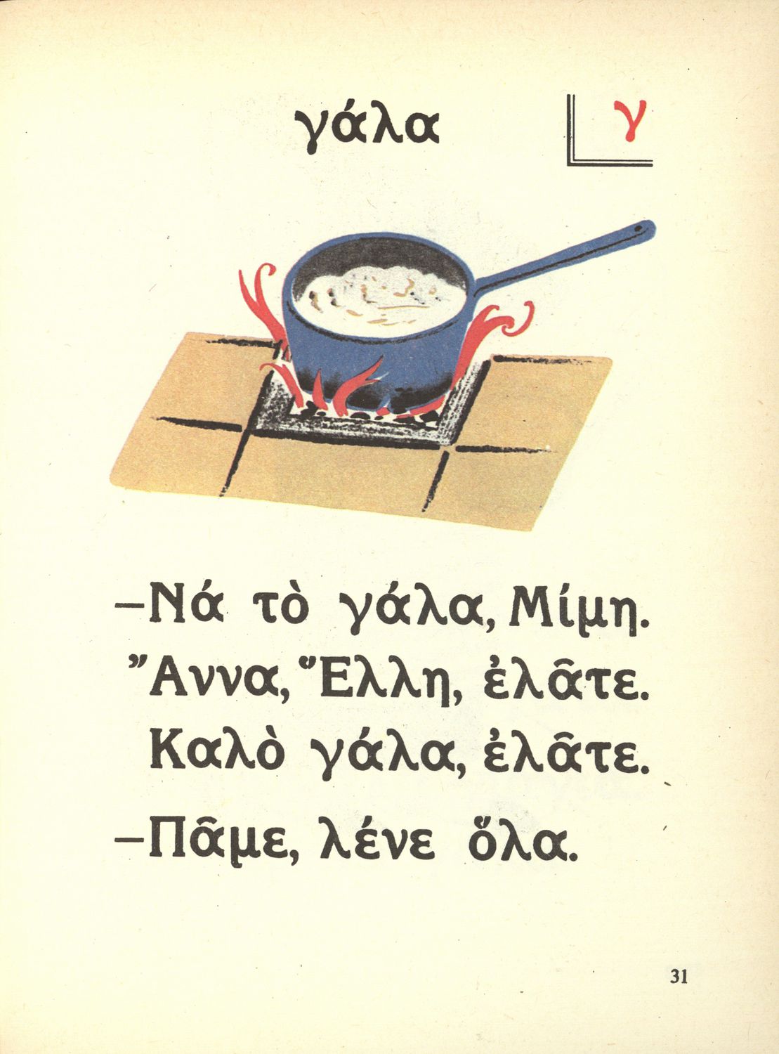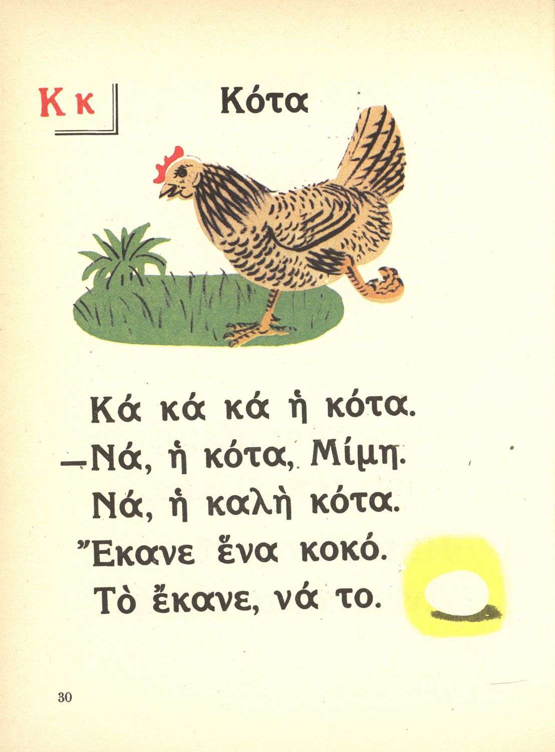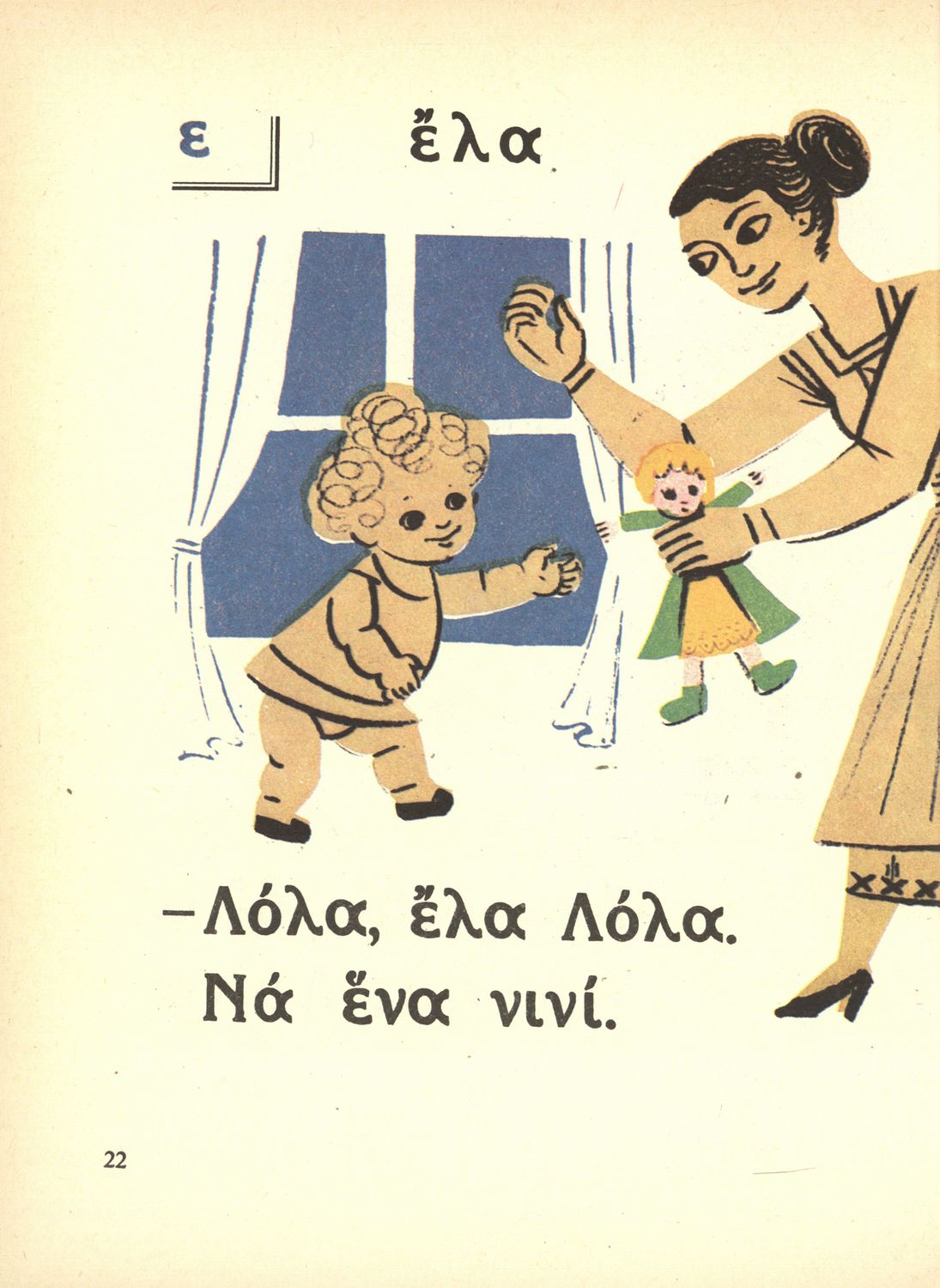Αναγνωστικό Α΄ Δημοτικού που περιέχει γράμματα, συλλαβές, λέξεις, προτάσεις και κείμενα εμπνευσμένα από την οικογενειακή και κοινωνική ζωή του τόπου. Φέρει το σύμβολο της δικτατορίας.