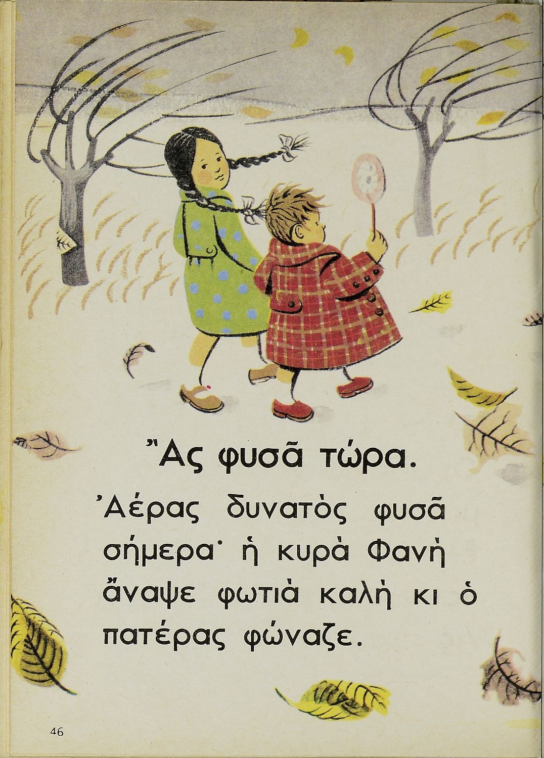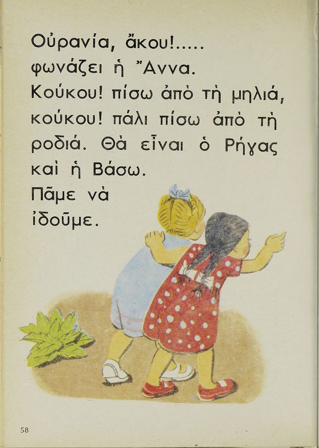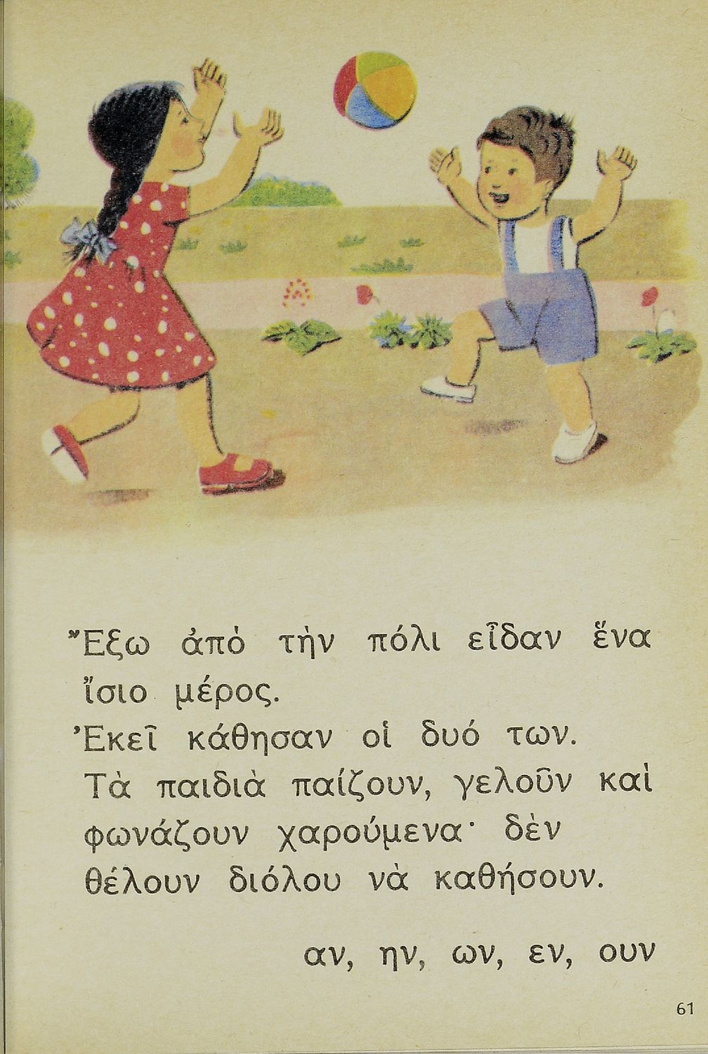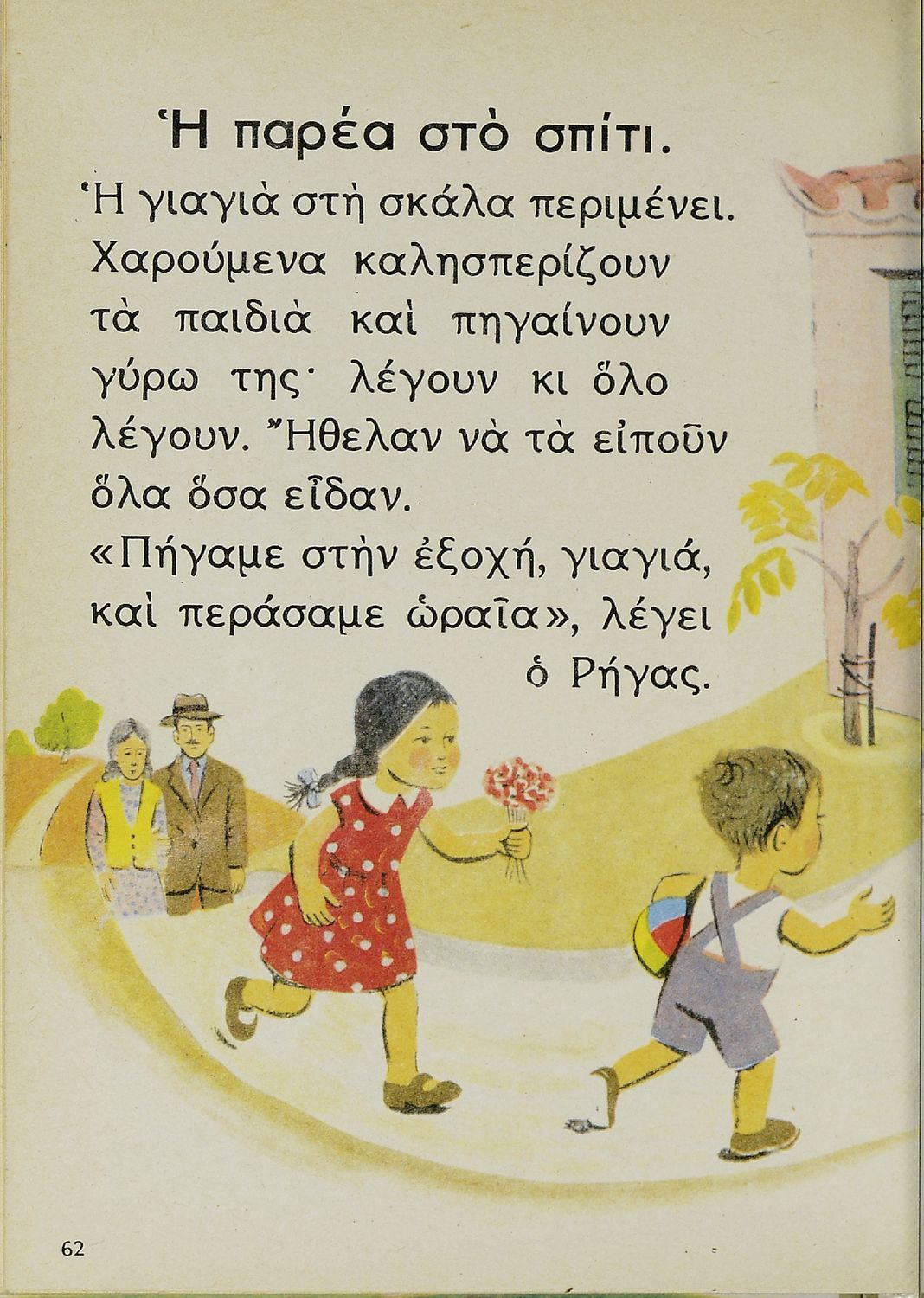 Αναγνωστικό Α΄ Δημοτικού που περιέχει ποιήματα και πεζά με σκηνές και προκρίνει τις αξίες της καλοσύνης, της υπευθυνότητας, της εργατικότητας, της αγάπης προς τα ζώα, αλλά και της διασκέδασης.