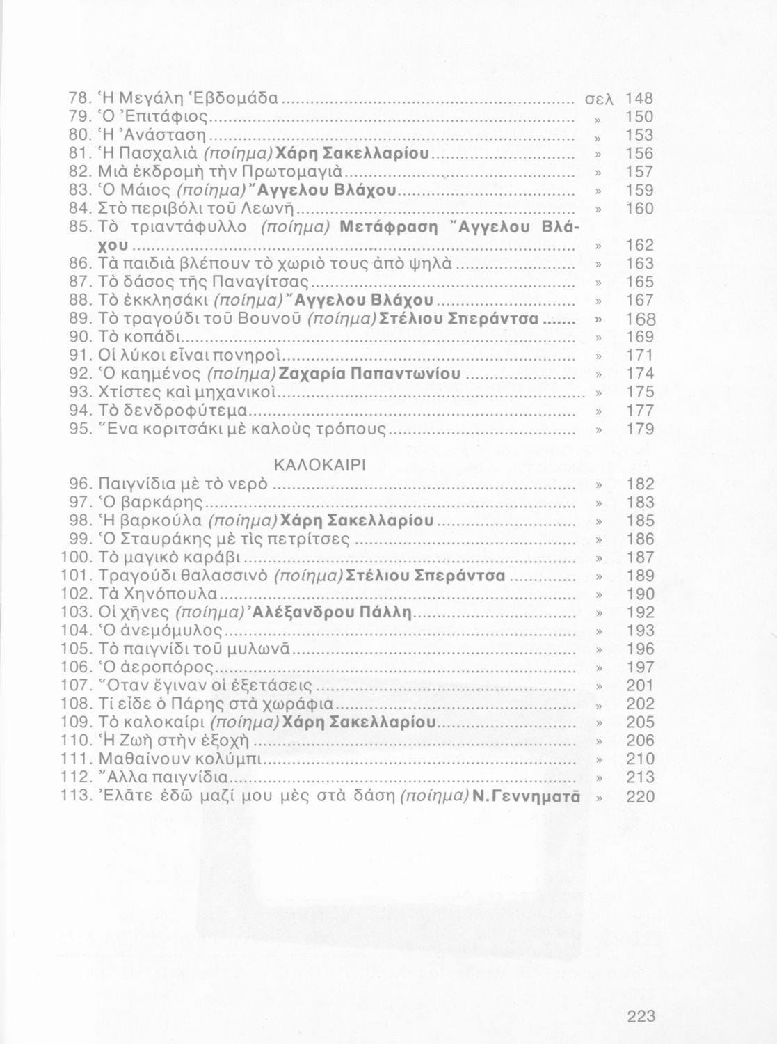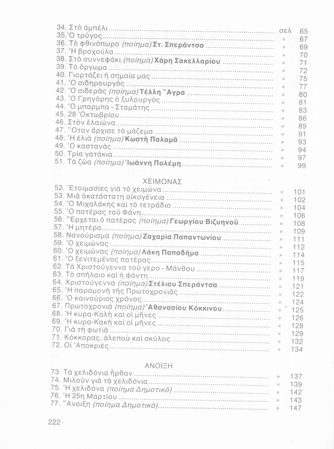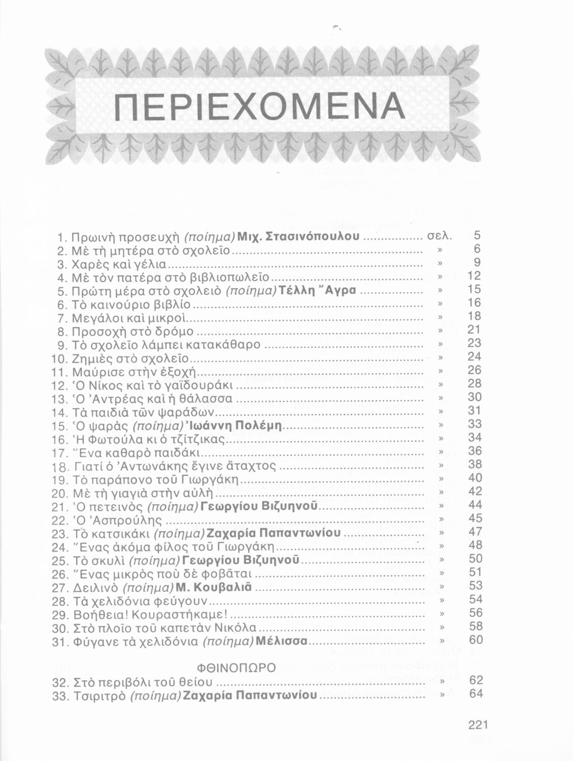 Αναγνωστικό Β' Δημοτικού που περιλαμβάνει ποιήματα και πεζά εμπνευσμένα από την καθημερινή ζωή, την ελληνική μυθολογία, την ελληνική φύση και τη θρησκευτική παράδοση.