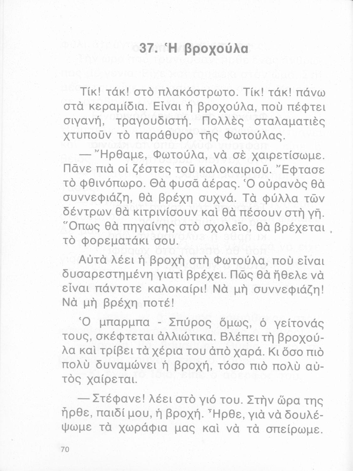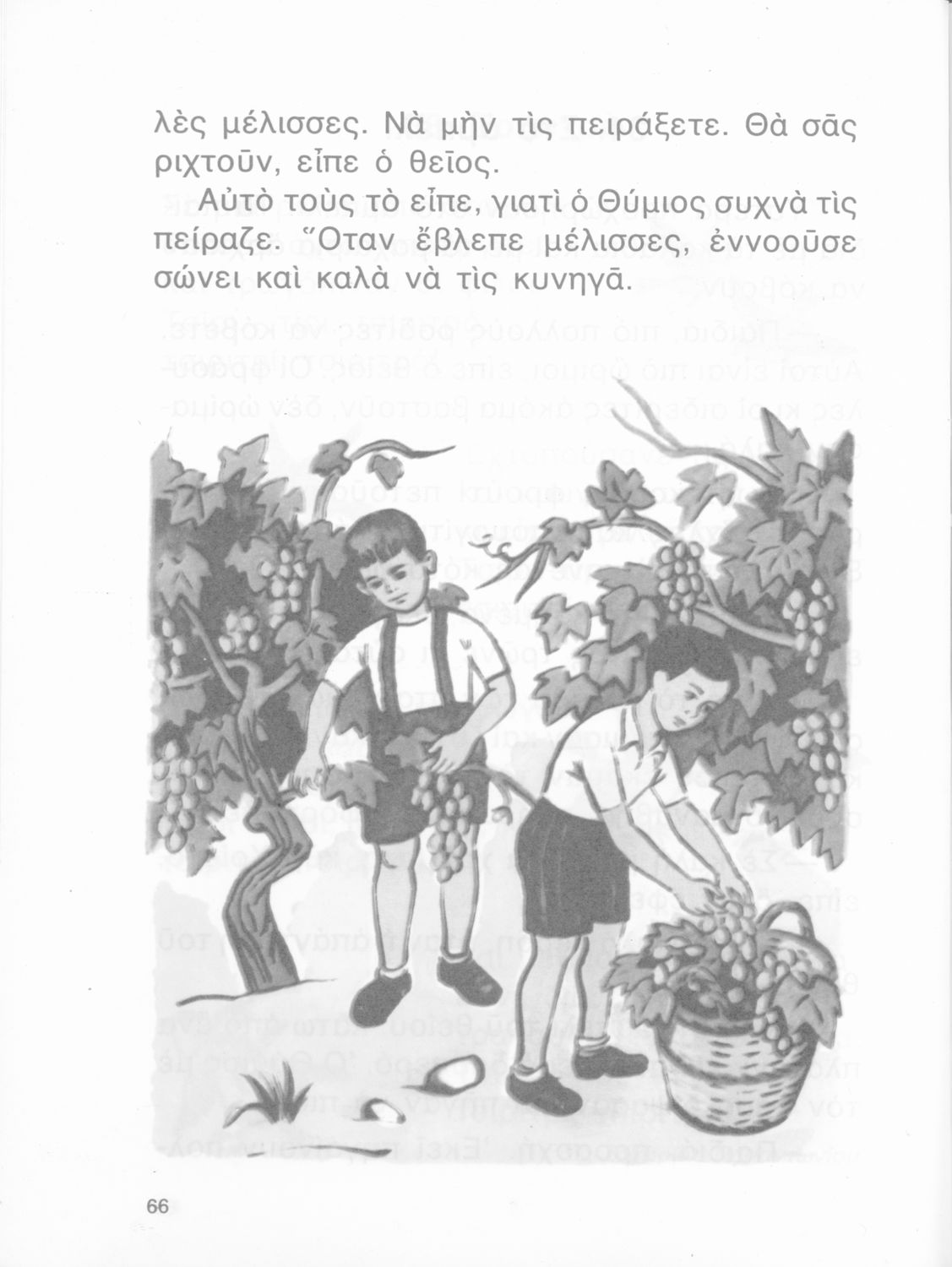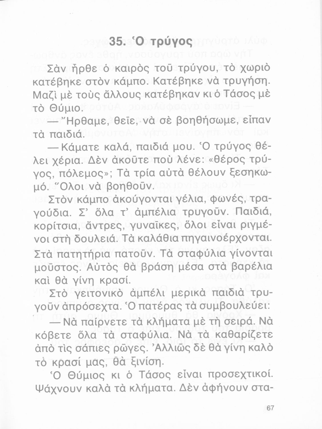 Αναγνωστικό Β' Δημοτικού που περιλαμβάνει μικρά διηγήματα και ποιήματα με περιεχόμενο από την οικογενειακή και κοινωνική ζωή, την ελληνική φύση, την ελληνική ιστορία και μυθολογία και την υγιεινή.
