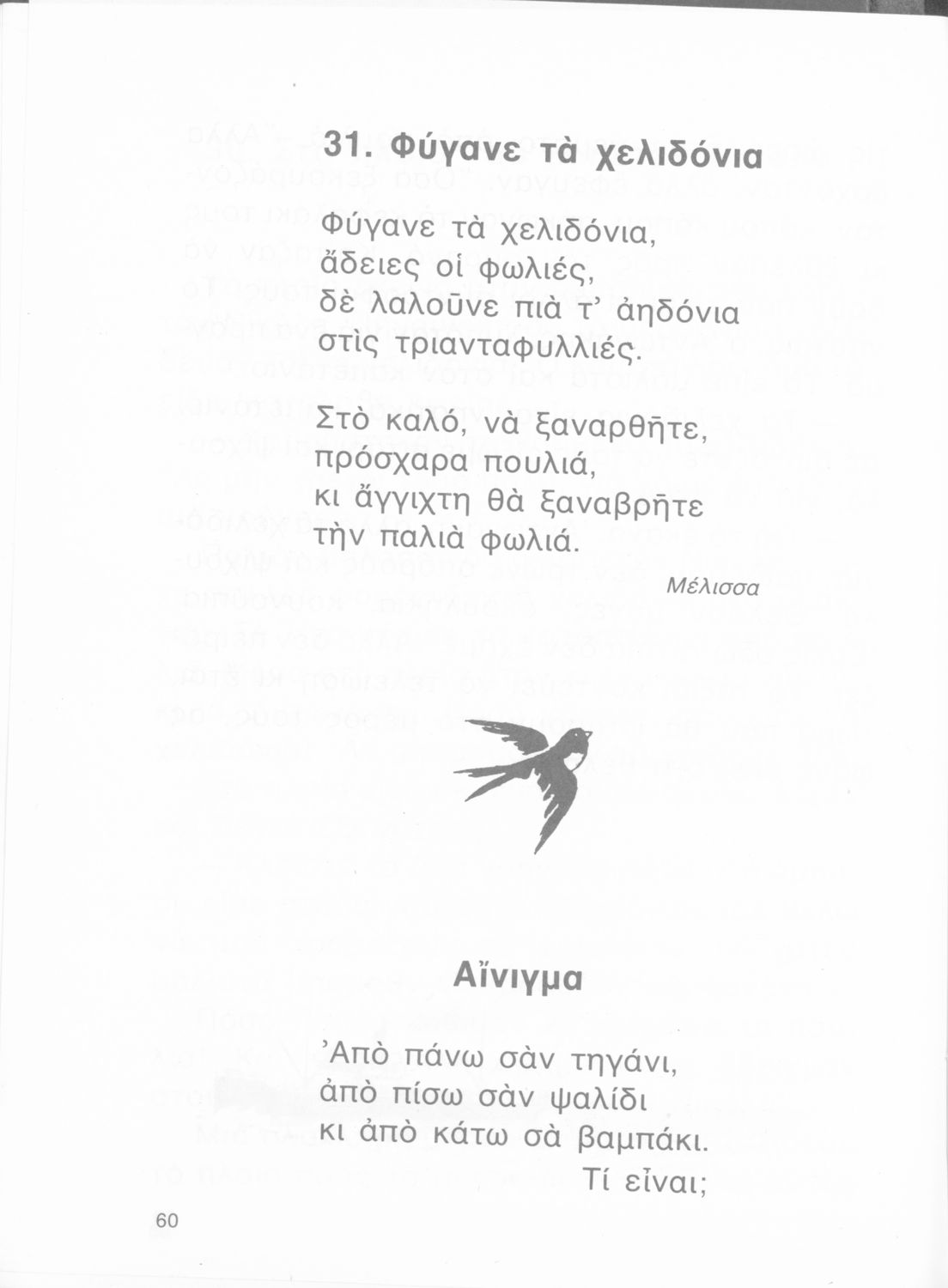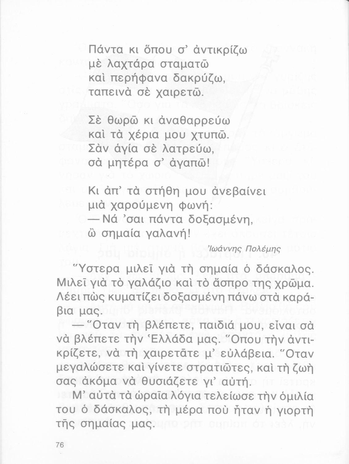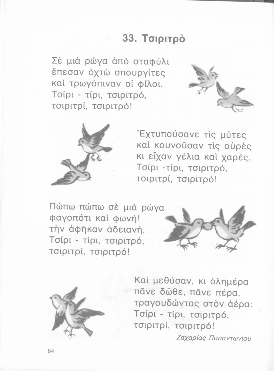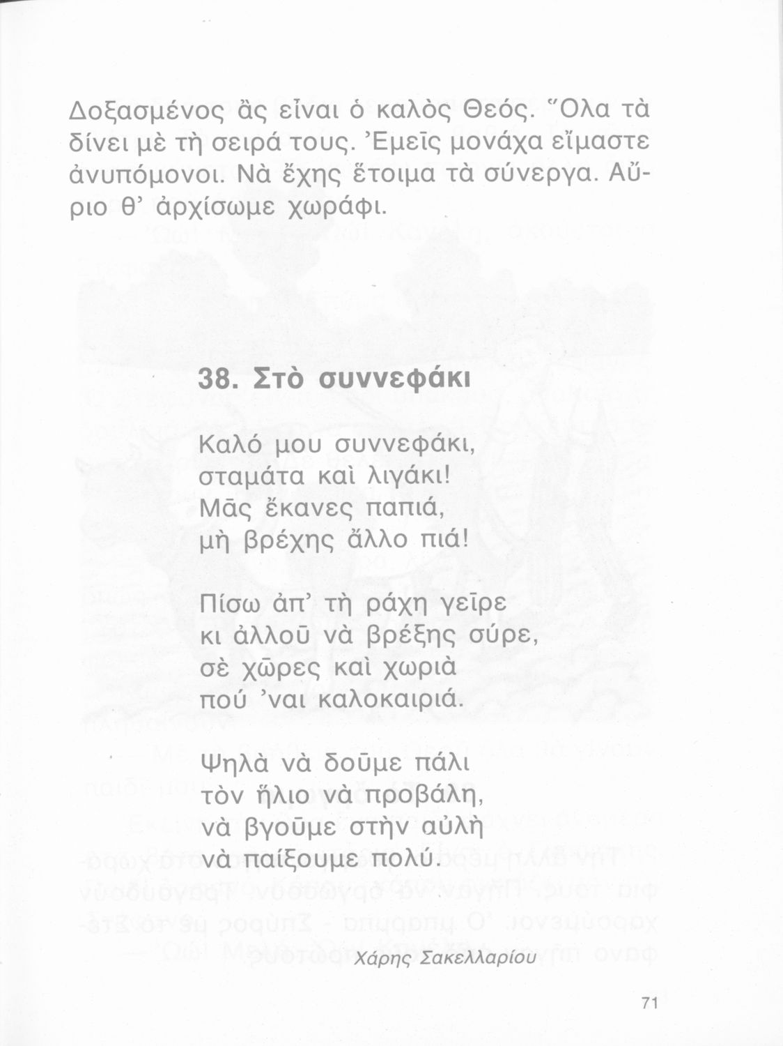 Αναγνωστικό Β' Δημοτικού που περιλαμβάνει ποιήματα και πεζά εμπνευσμένα από την καθημερινή ζωή, την ελληνική μυθολογία, την ελληνική φύση και τη θρησκευτική παράδοση.