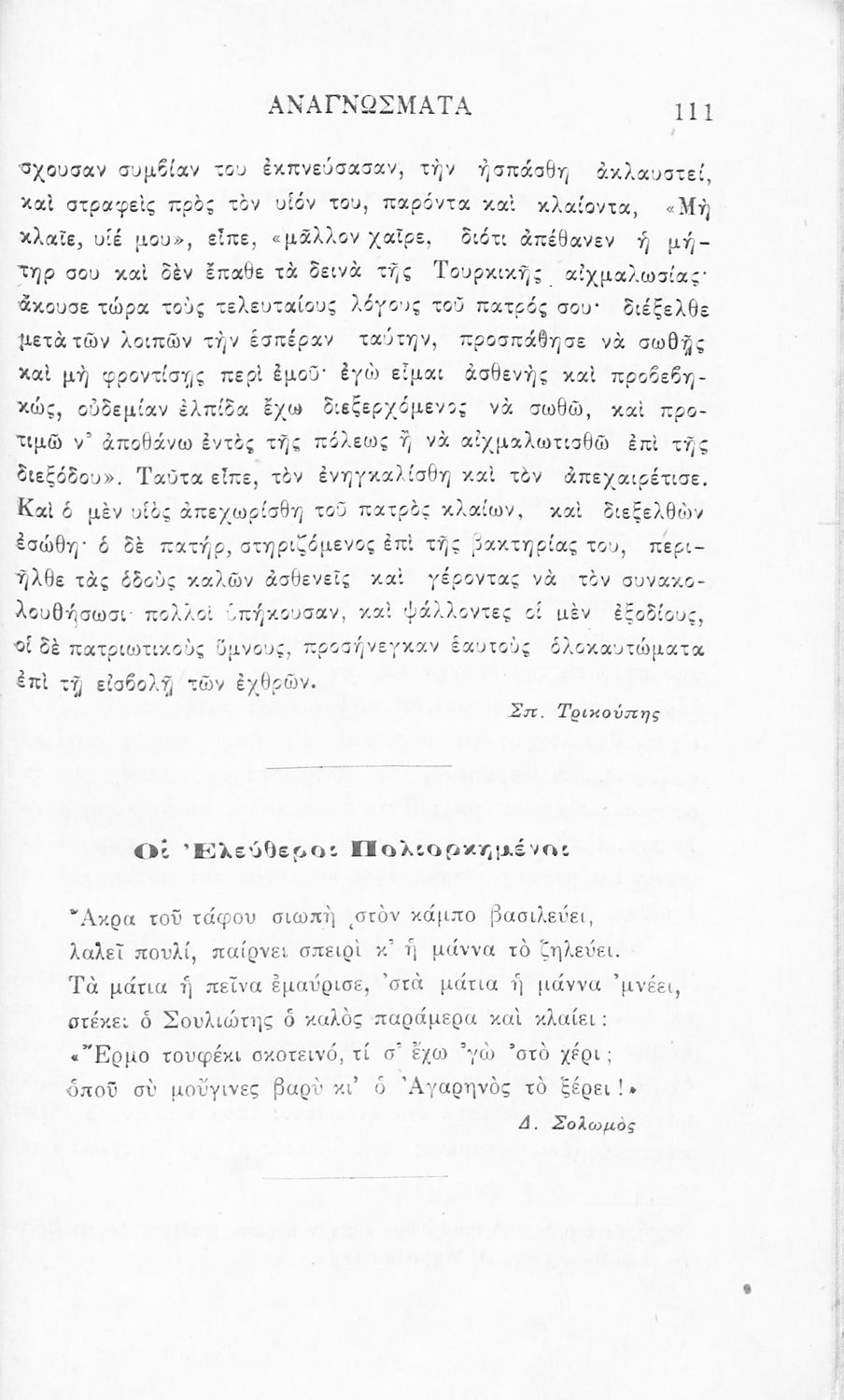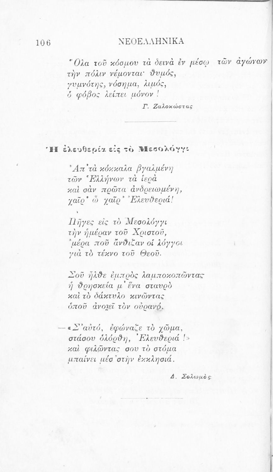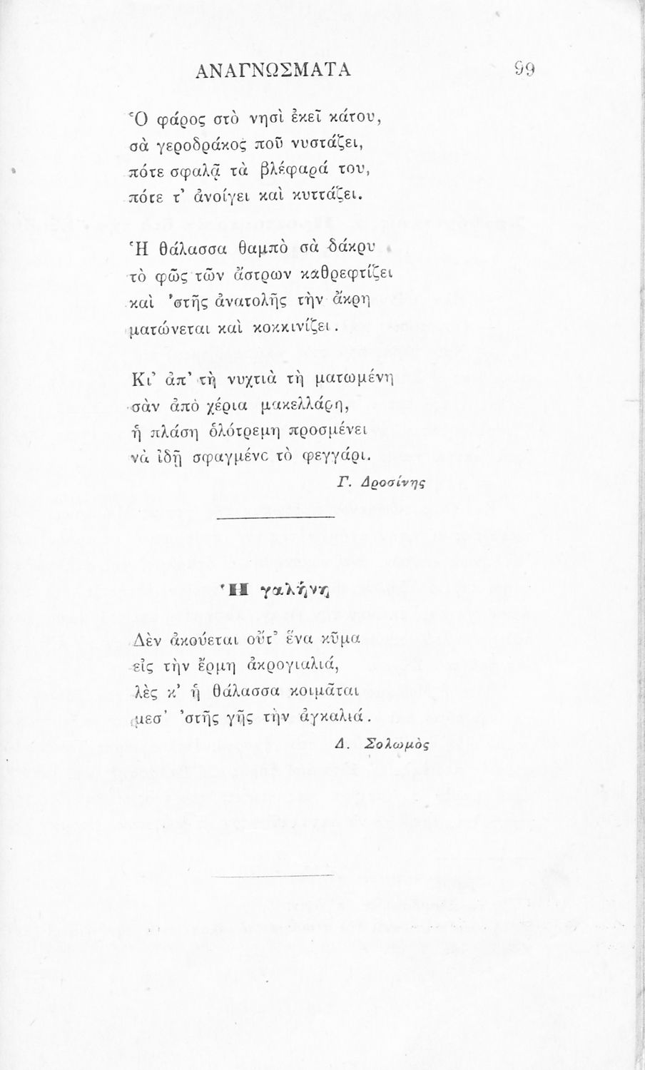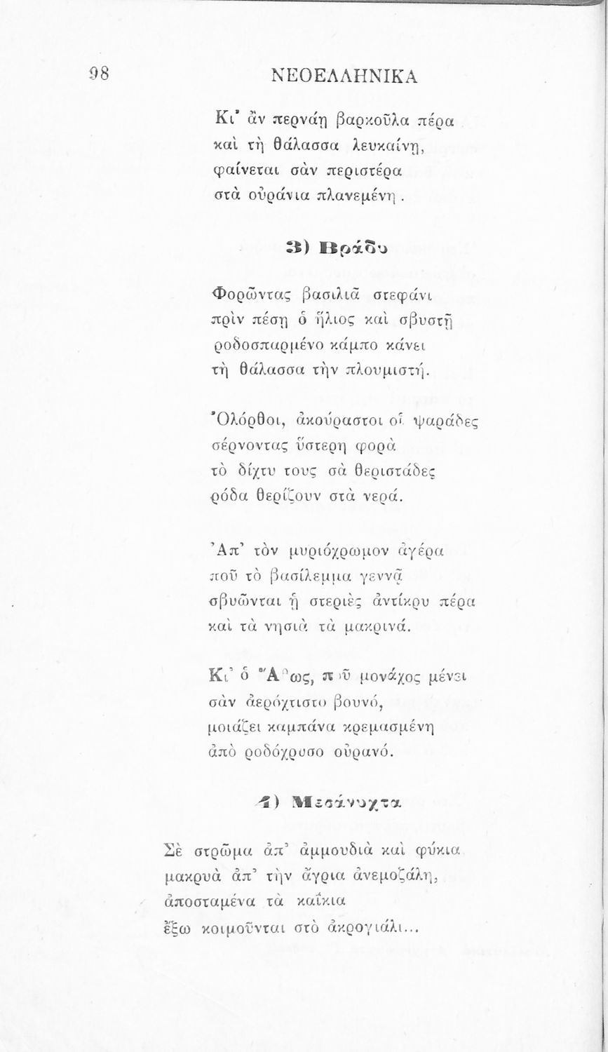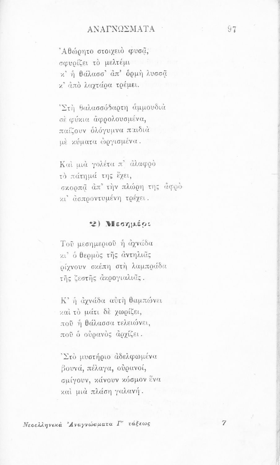 Σχολικό εγχειρίδιο Νέων Ελληνικών Γ' Ελληνικού Σχολείου που περιλαμβάνει ποιήματα και πεζά Ελλήνων συγγραφέων και δημοτικά τραγούδια εμπνευσμένα από την σύγχρονη ελληνική ιστορία, τη βυζαντινή ιστορία, την ελληνική φύση και τη ζωή στην ύπαιθρο, την οικογενειακή ζωή και τη θρησκευτική παράδοση. Περιέχει και παράρτημα με βιογραφίες των συγγραφέων και λεξιλόγιο.