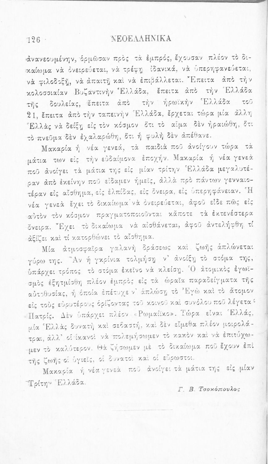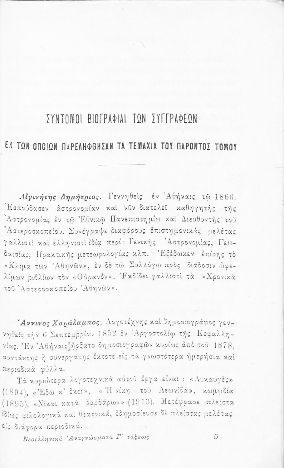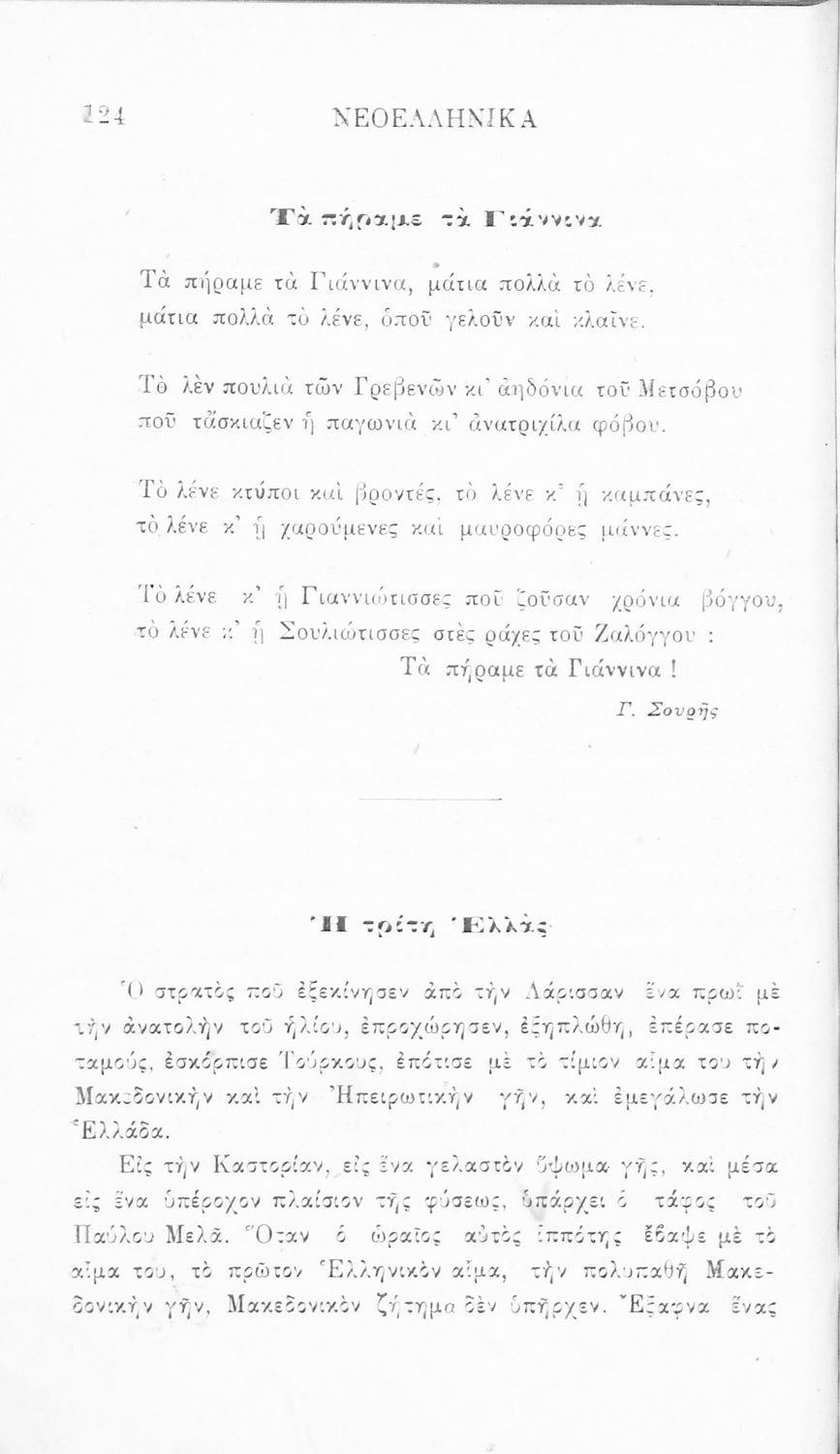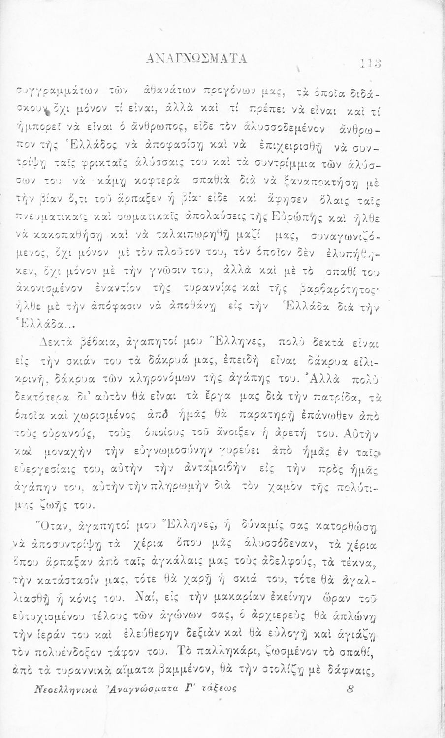 Σχολικό εγχειρίδιο Νέων Ελληνικών Γ' Ελληνικού Σχολείου που περιλαμβάνει ποιήματα και πεζά Ελλήνων συγγραφέων και δημοτικά τραγούδια εμπνευσμένα από την σύγχρονη ελληνική ιστορία, τη βυζαντινή ιστορία, την ελληνική φύση και τη ζωή στην ύπαιθρο, την οικογενειακή ζωή και τη θρησκευτική παράδοση. Περιέχει και παράρτημα με βιογραφίες των συγγραφέων και λεξιλόγιο.