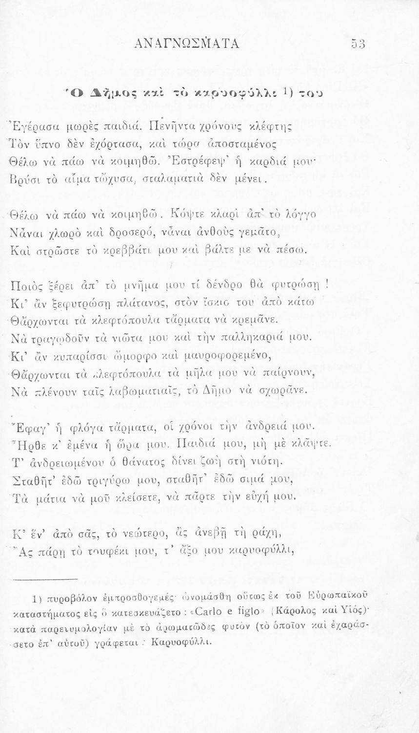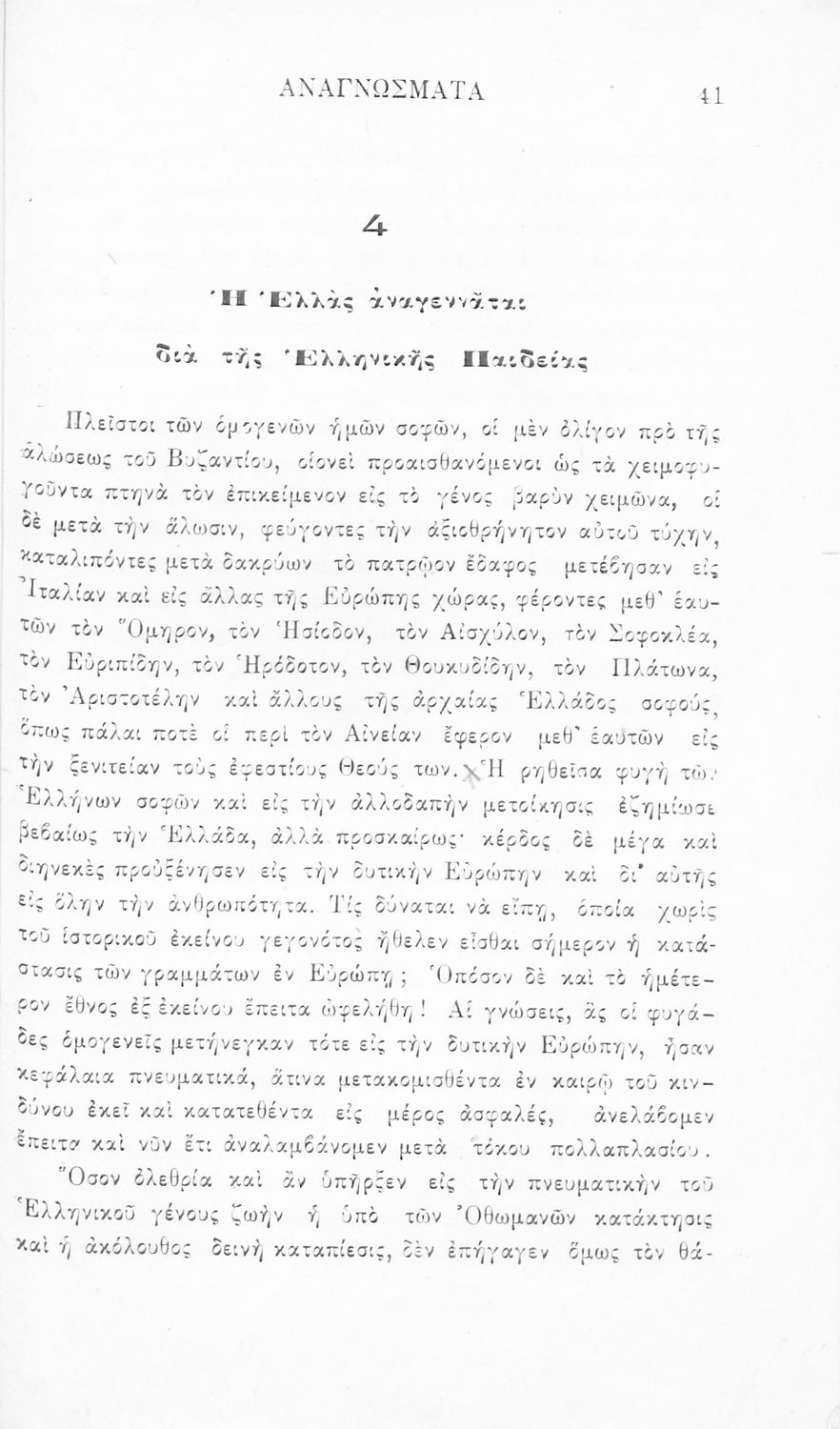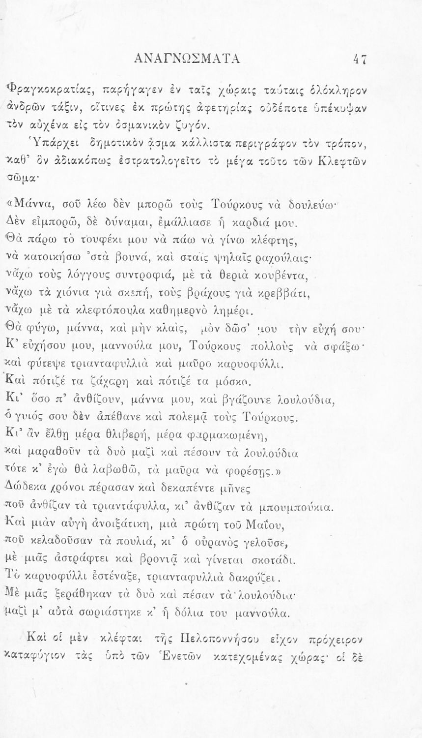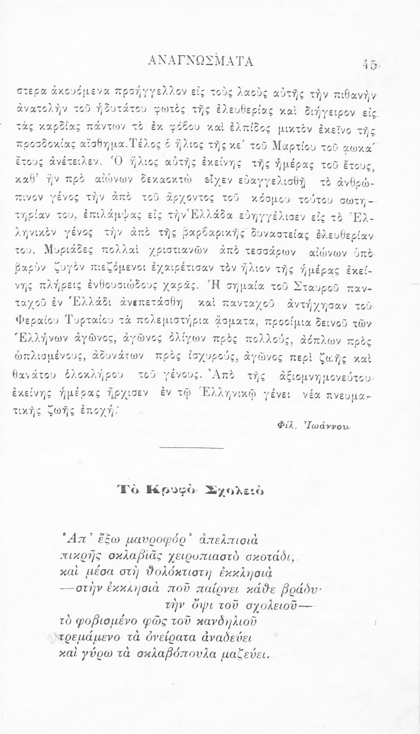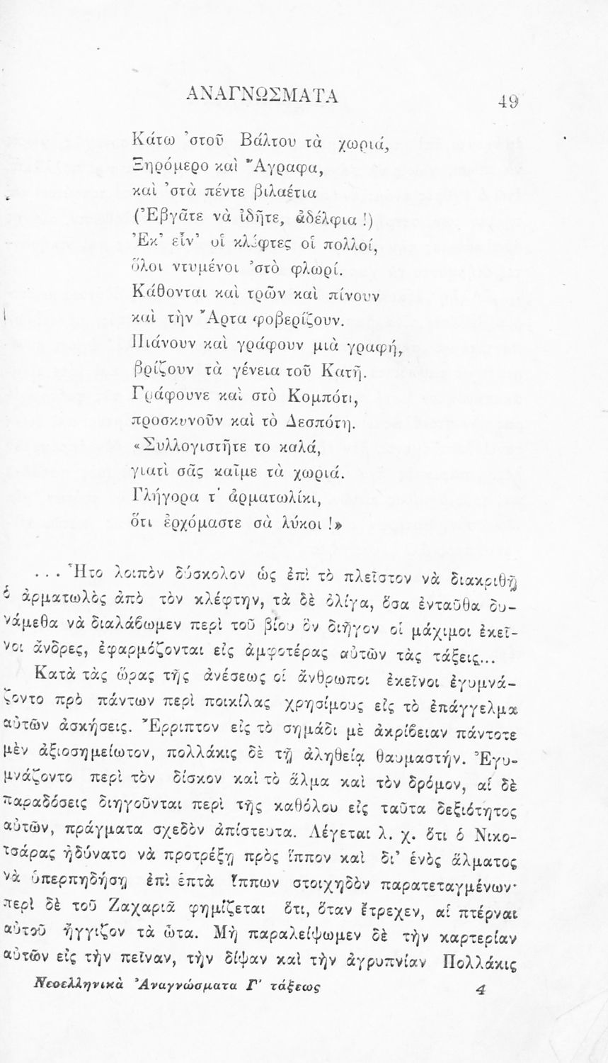 Σχολικό εγχειρίδιο Νέων Ελληνικών Γ' Ελληνικού Σχολείου που περιλαμβάνει ποιήματα και πεζά Ελλήνων συγγραφέων και δημοτικά τραγούδια εμπνευσμένα από την σύγχρονη ελληνική ιστορία, τη βυζαντινή ιστορία, την ελληνική φύση και τη ζωή στην ύπαιθρο, την οικογενειακή ζωή και τη θρησκευτική παράδοση. Περιέχει και παράρτημα με βιογραφίες των συγγραφέων και λεξιλόγιο.