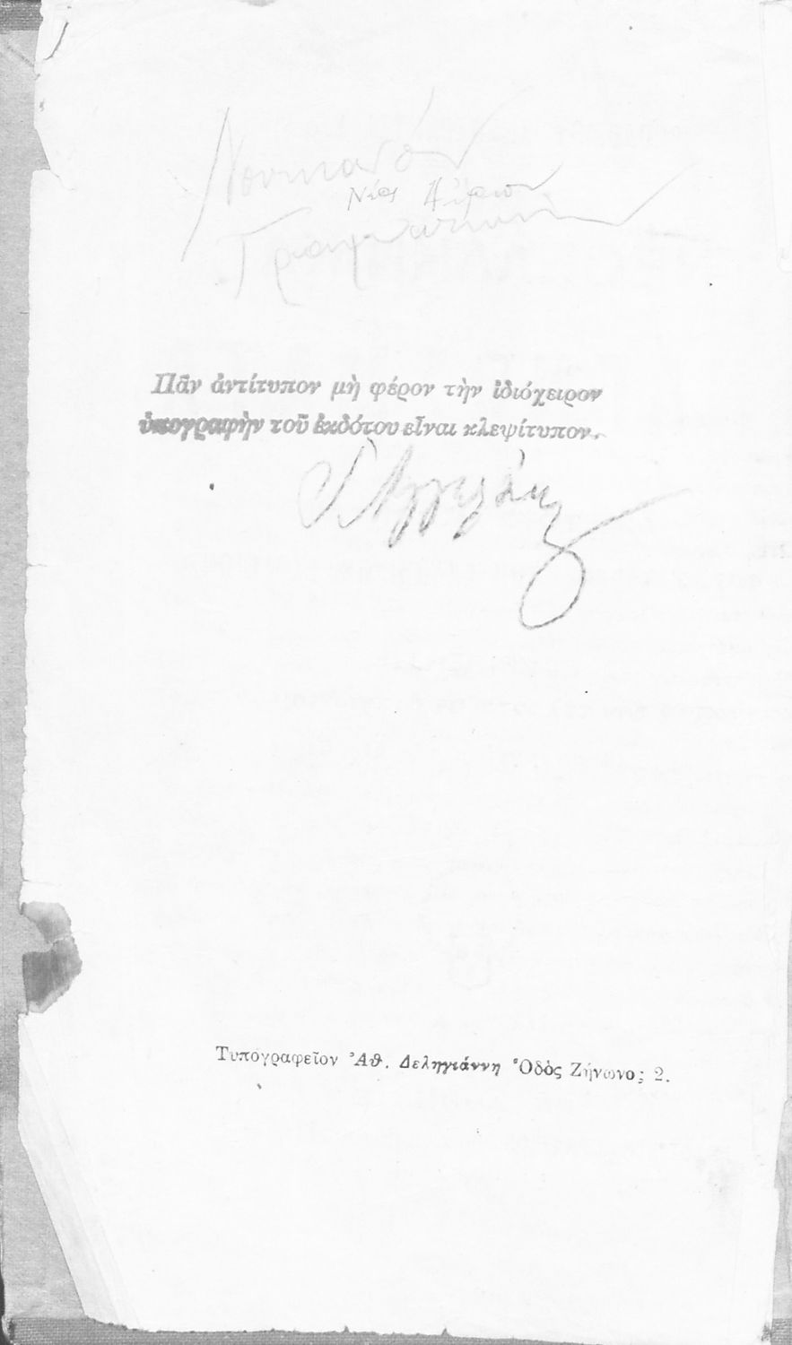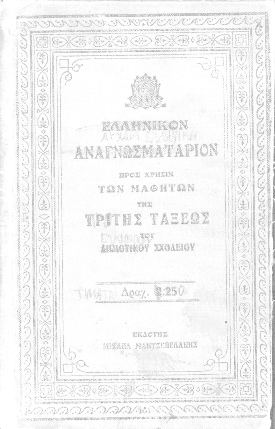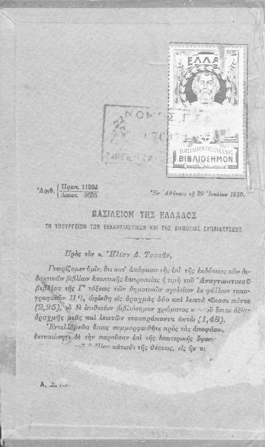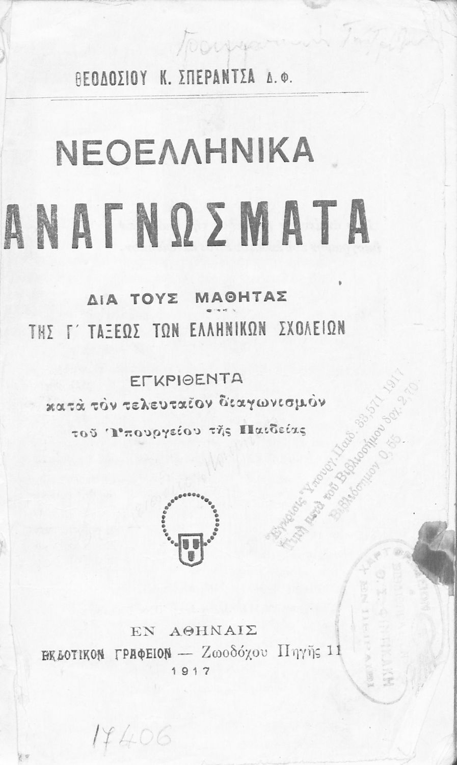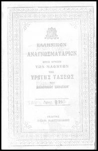 Εκδότης: Εκδοτικόν Γραφείον Έτος έκδοσης: 1917 Τόπος έκδοσης: Αθήνα Υπουργική απόφαση / Σύμβαση: 6245/18/9/1917 Έτος έγκρισης: 1917 |