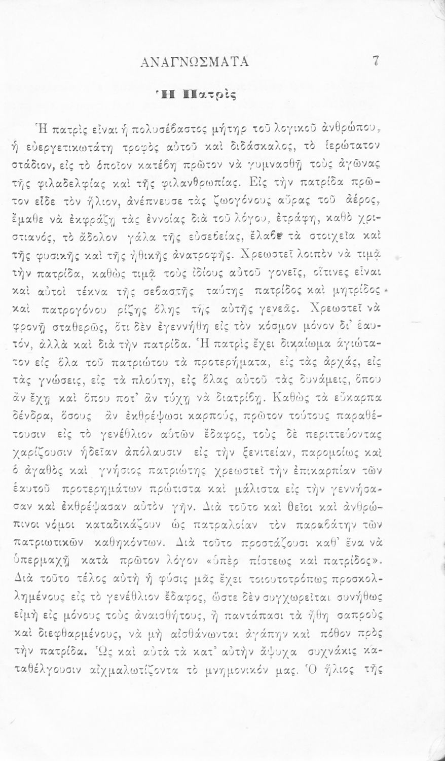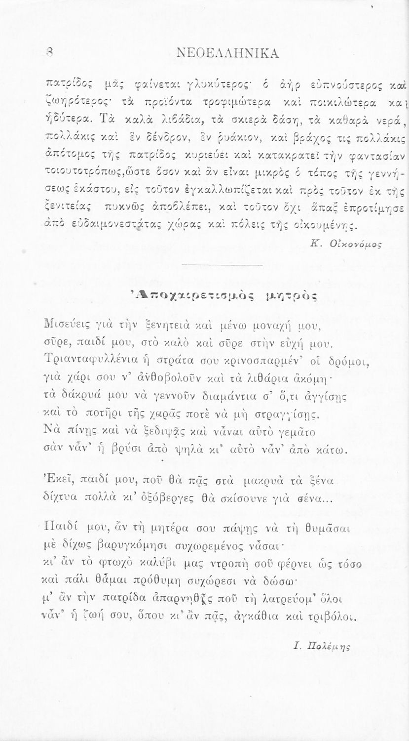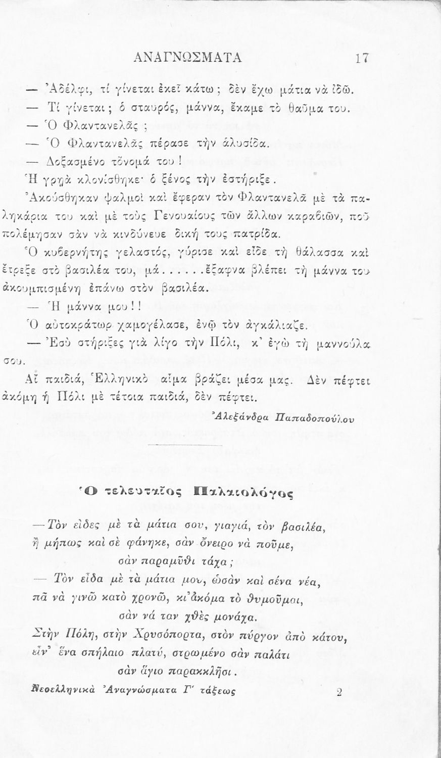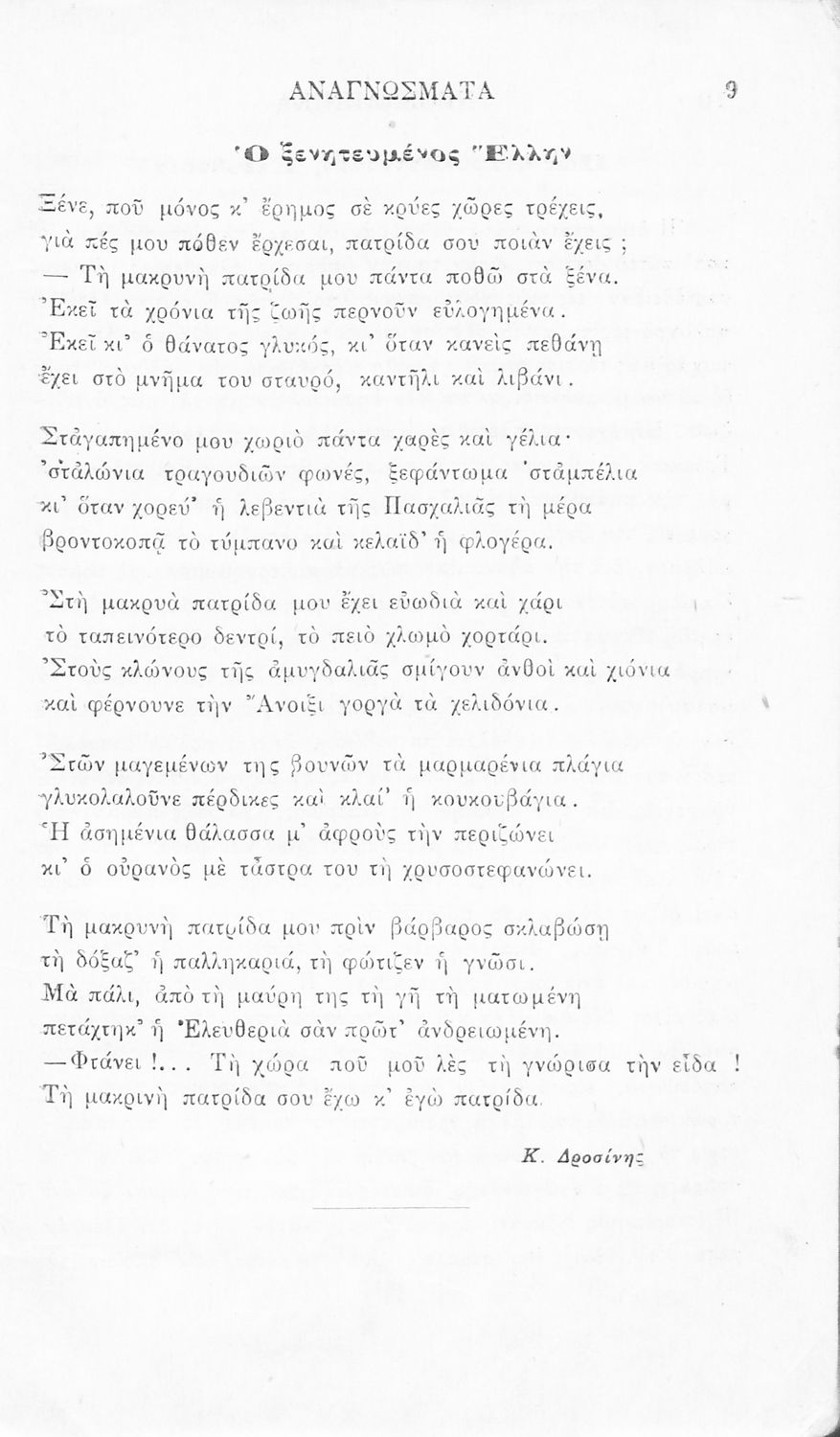 Σχολικό εγχειρίδιο Νέων Ελληνικών Γ' Ελληνικού Σχολείου που περιλαμβάνει ποιήματα και πεζά Ελλήνων συγγραφέων και δημοτικά τραγούδια εμπνευσμένα από την σύγχρονη ελληνική ιστορία, τη βυζαντινή ιστορία, την ελληνική φύση και τη ζωή στην ύπαιθρο, την οικογενειακή ζωή και τη θρησκευτική παράδοση. Περιέχει και παράρτημα με βιογραφίες των συγγραφέων και λεξιλόγιο.