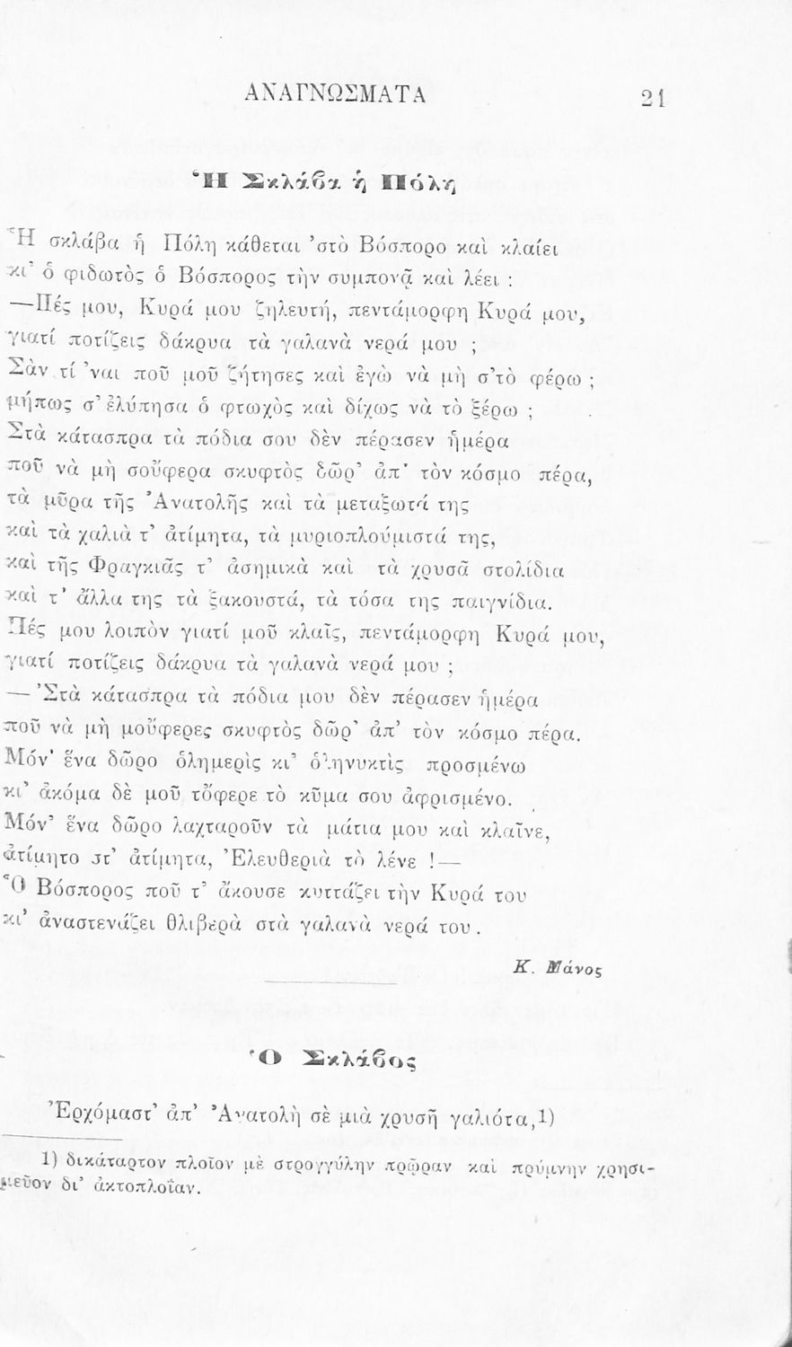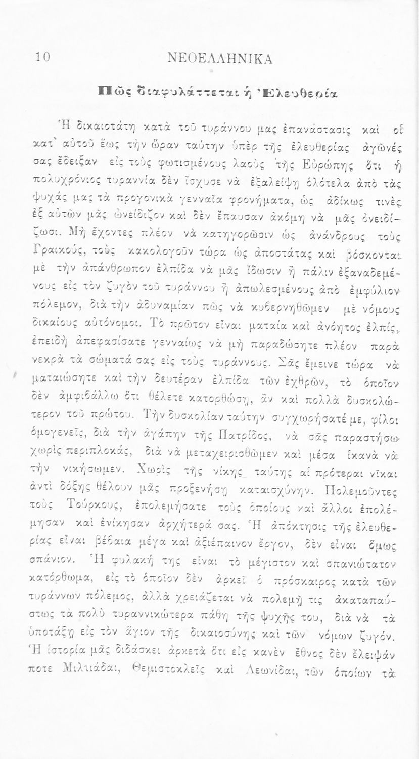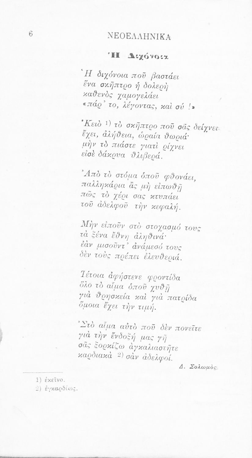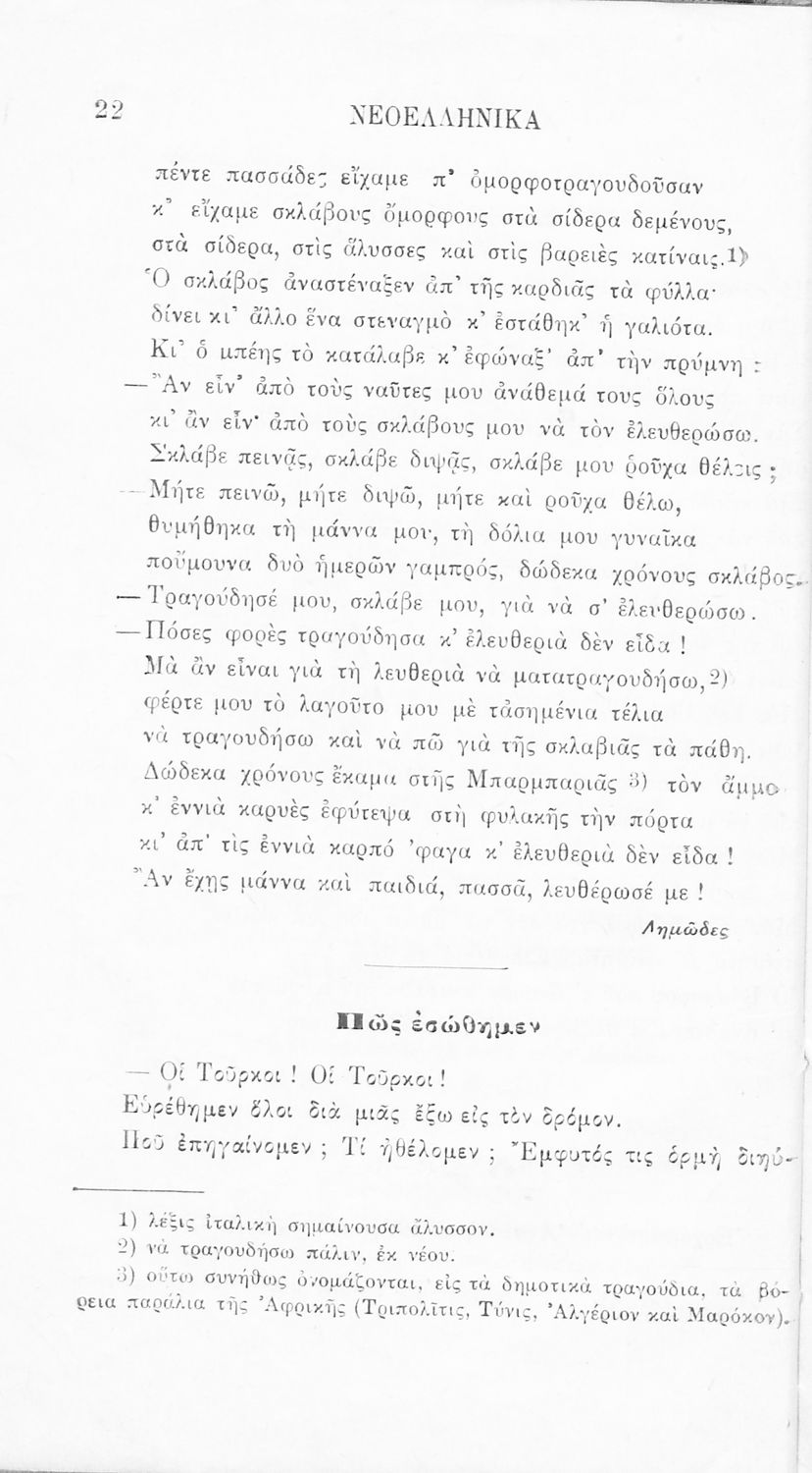 Σχολικό εγχειρίδιο Νέων Ελληνικών Γ' Ελληνικού Σχολείου που περιλαμβάνει ποιήματα και πεζά Ελλήνων συγγραφέων και δημοτικά τραγούδια εμπνευσμένα από την σύγχρονη ελληνική ιστορία, τη βυζαντινή ιστορία, την ελληνική φύση και τη ζωή στην ύπαιθρο, την οικογενειακή ζωή και τη θρησκευτική παράδοση. Περιέχει και παράρτημα με βιογραφίες των συγγραφέων και λεξιλόγιο.