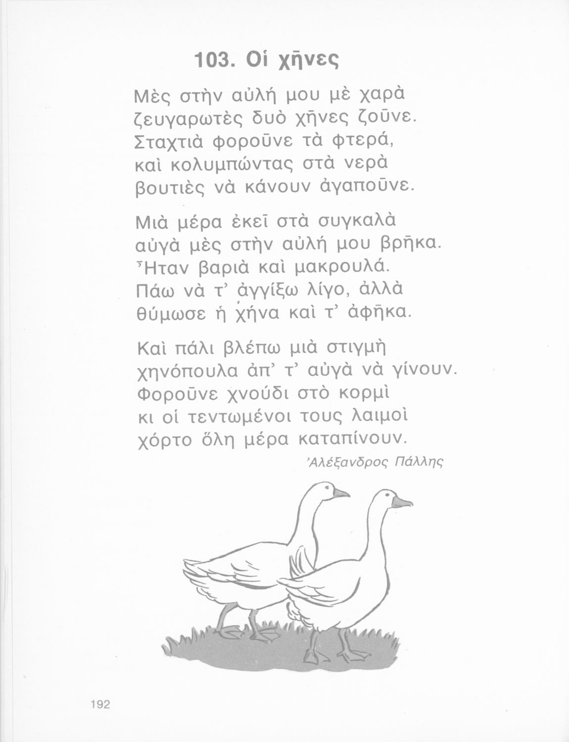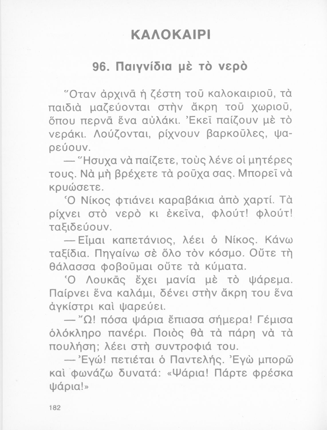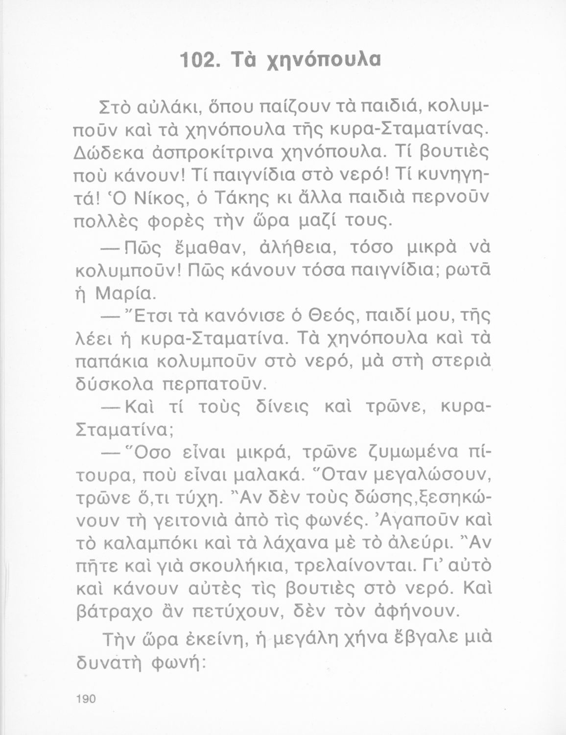 Αναγνωστικό Β' Δημοτικού που είναι χωρισμένο σύμφωνα με τις εποχές του χρόνου και περιλαμβάνει κείμενα ηθοποιητικού περιεχομένου εμπνευσμένα από τη θρησκευτική, εθνική, κοινωνική και οικογενειακή ζωή.
