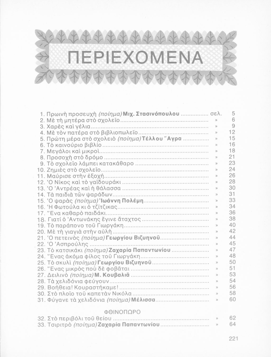 Αναγνωστικό Β' Δημοτικού που είναι χωρισμένο σύμφωνα με τις εποχές του χρόνου και περιλαμβάνει κείμενα ηθοποιητικού περιεχομένου εμπνευσμένα από τη θρησκευτική, εθνική, κοινωνική και οικογενειακή ζωή.