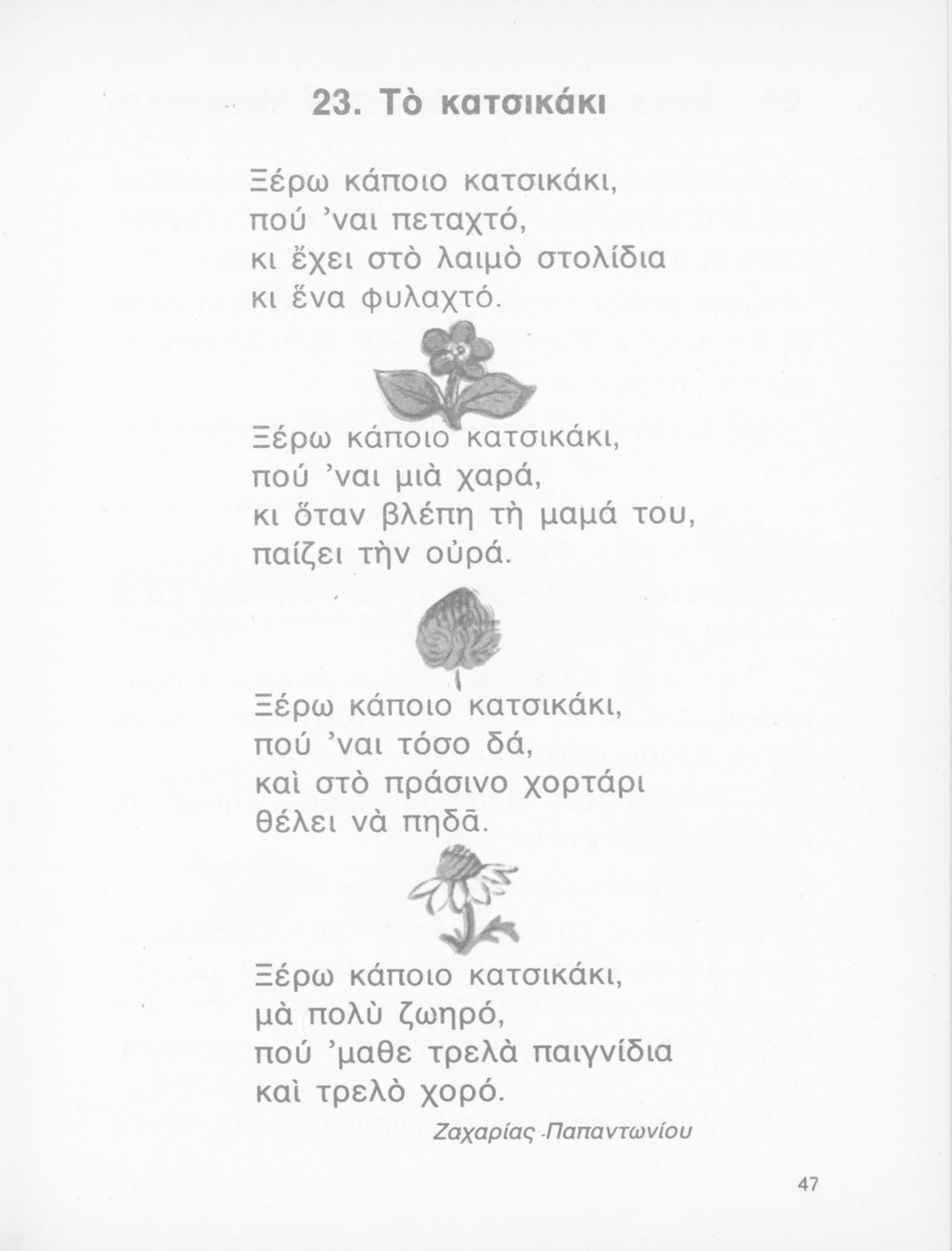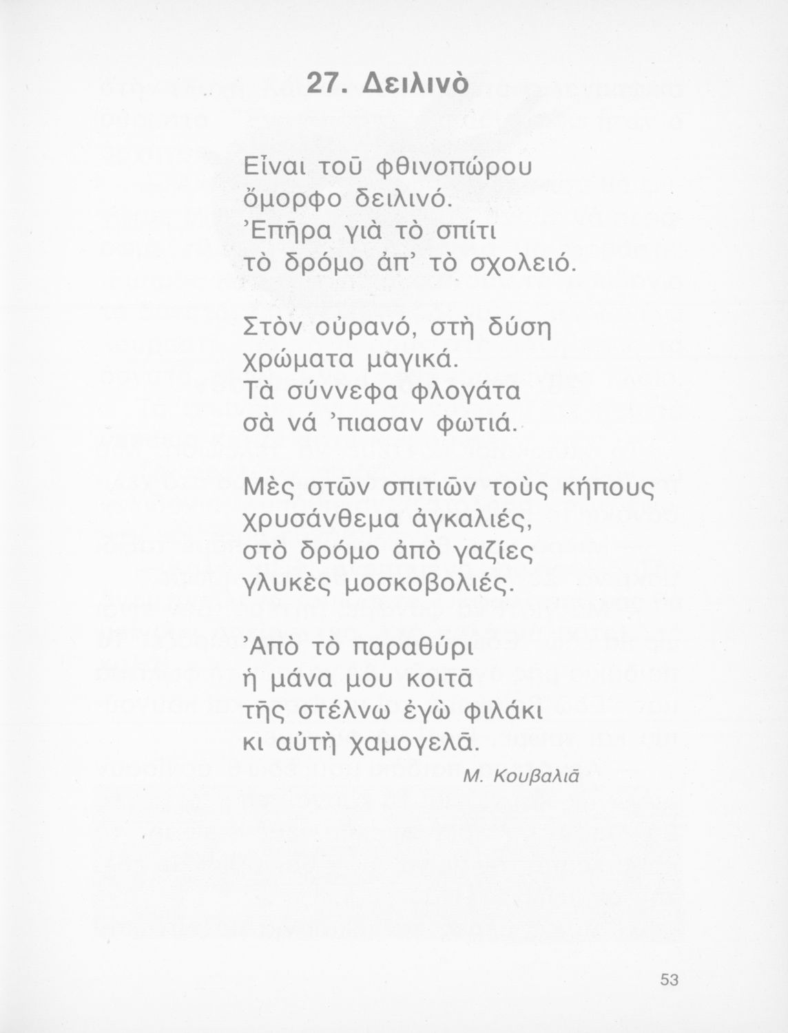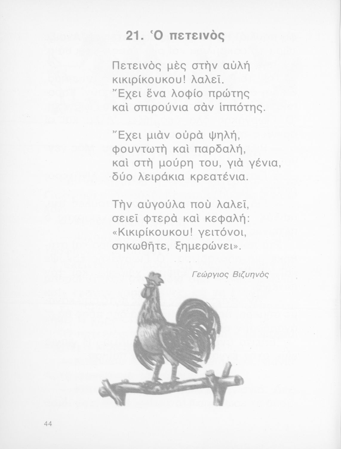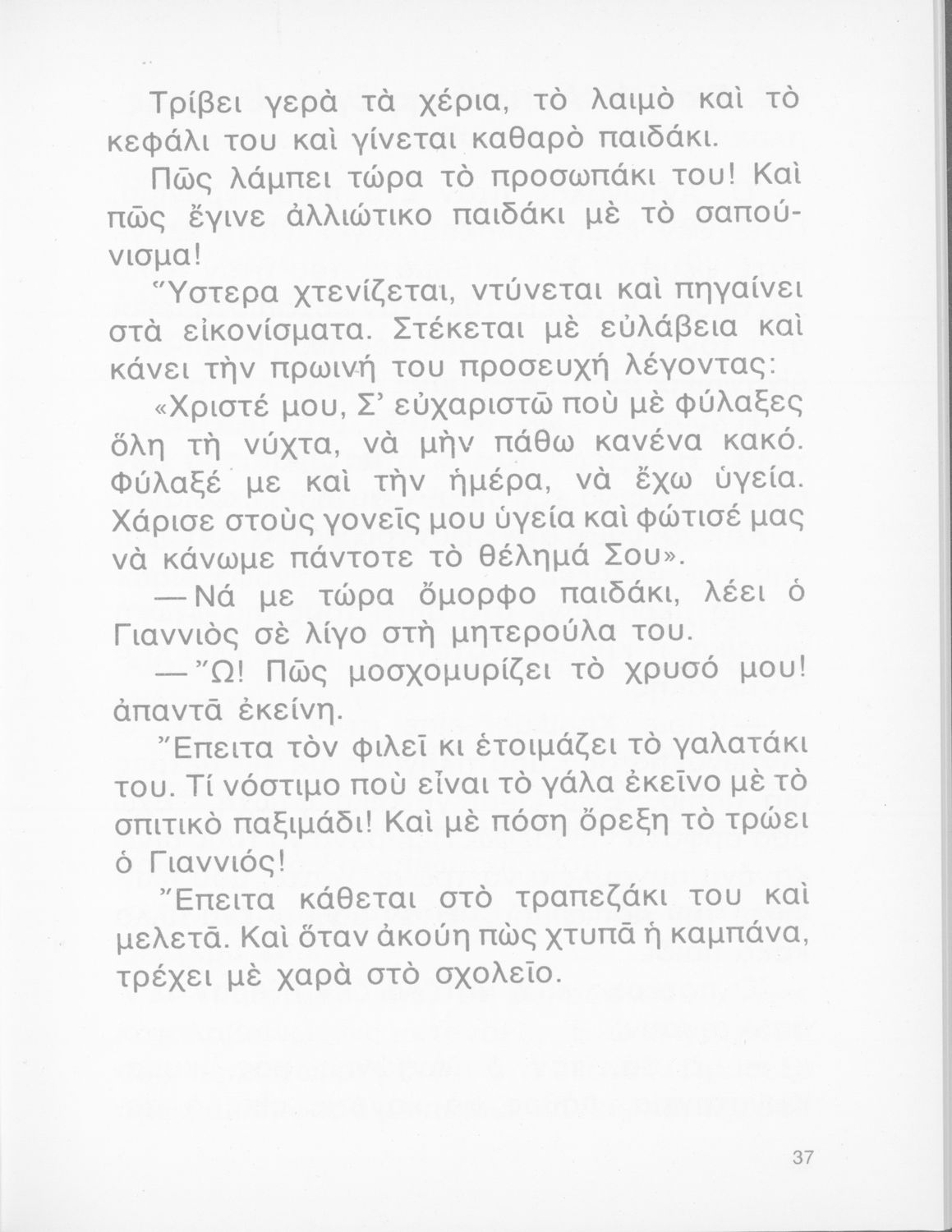 Αναγνωστικό Β' Δημοτικού που είναι χωρισμένο σύμφωνα με τις εποχές του χρόνου και περιλαμβάνει κείμενα ηθοποιητικού περιεχομένου εμπνευσμένα από τη θρησκευτική, εθνική, κοινωνική και οικογενειακή ζωή.
