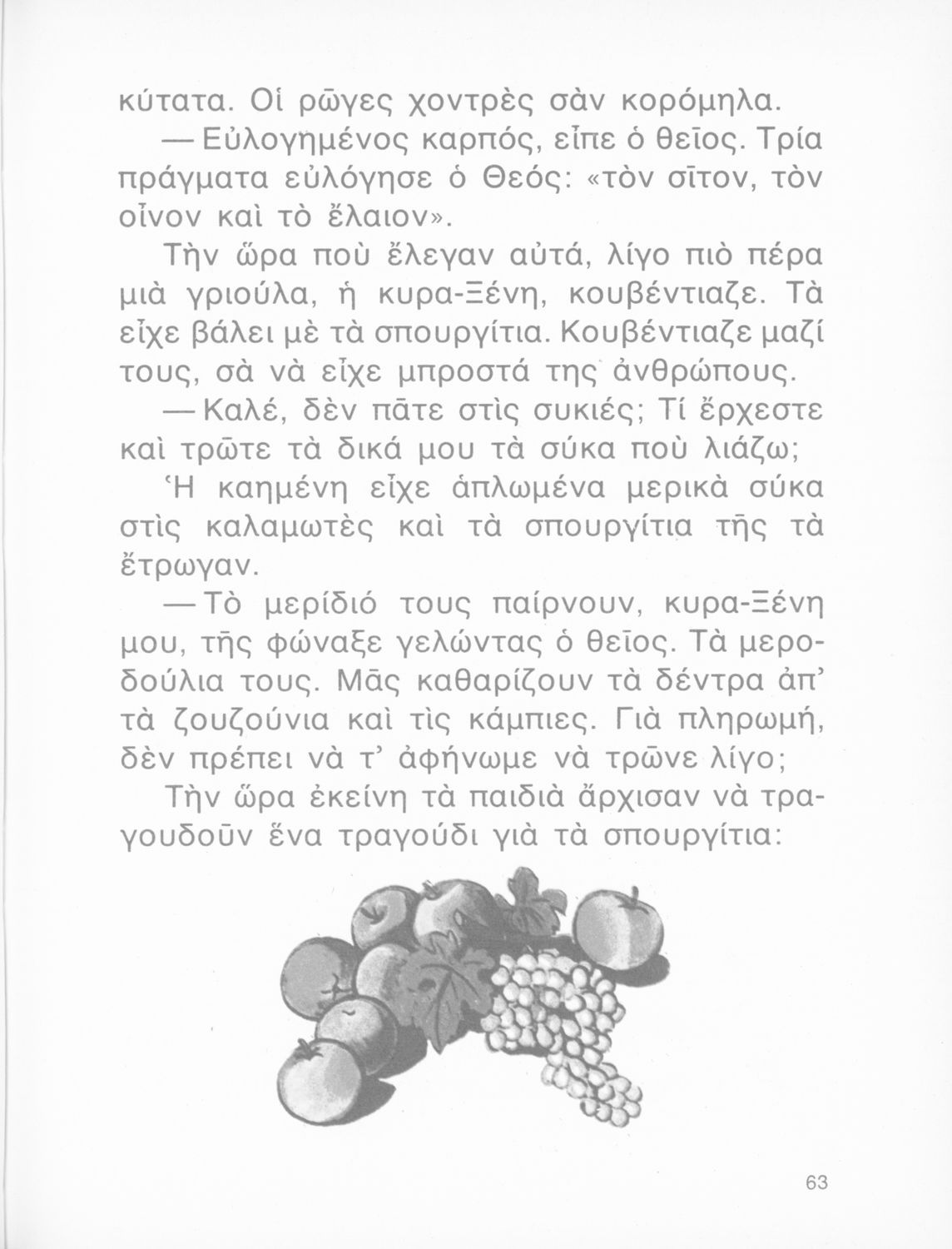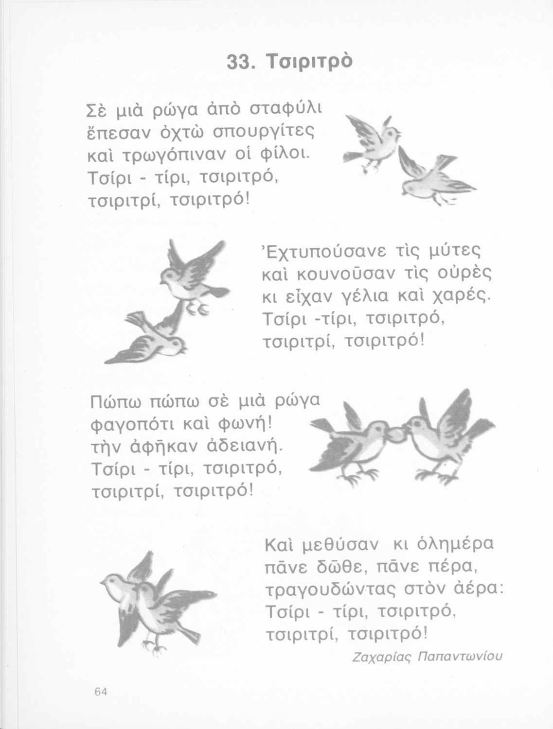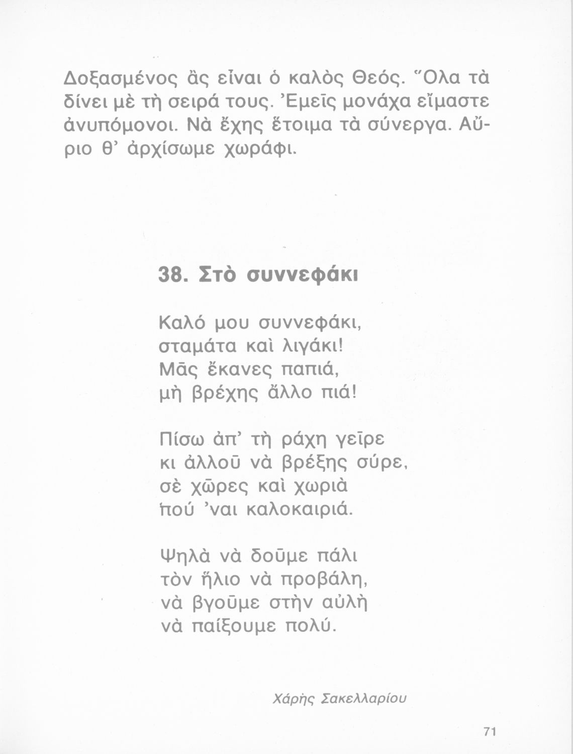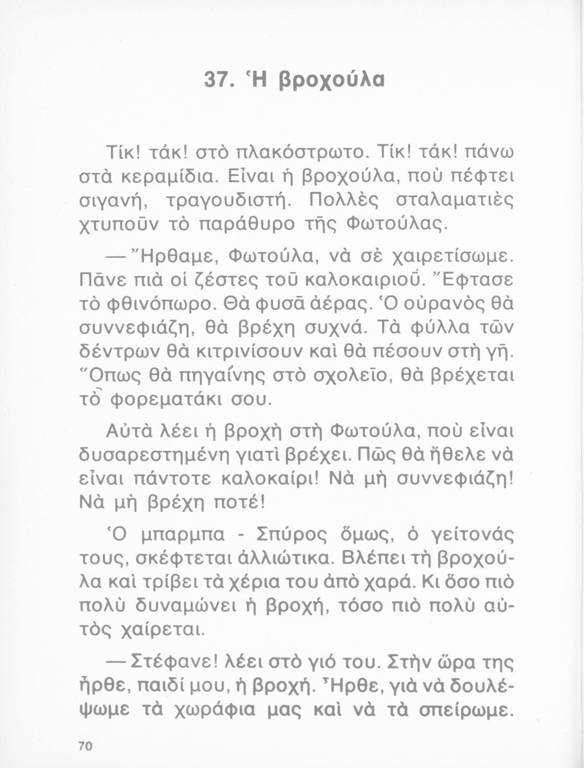 Αναγνωστικό Β' Δημοτικού που είναι χωρισμένο σύμφωνα με τις εποχές του χρόνου και περιλαμβάνει κείμενα ηθοποιητικού περιεχομένου εμπνευσμένα από τη θρησκευτική, εθνική, κοινωνική και οικογενειακή ζωή.