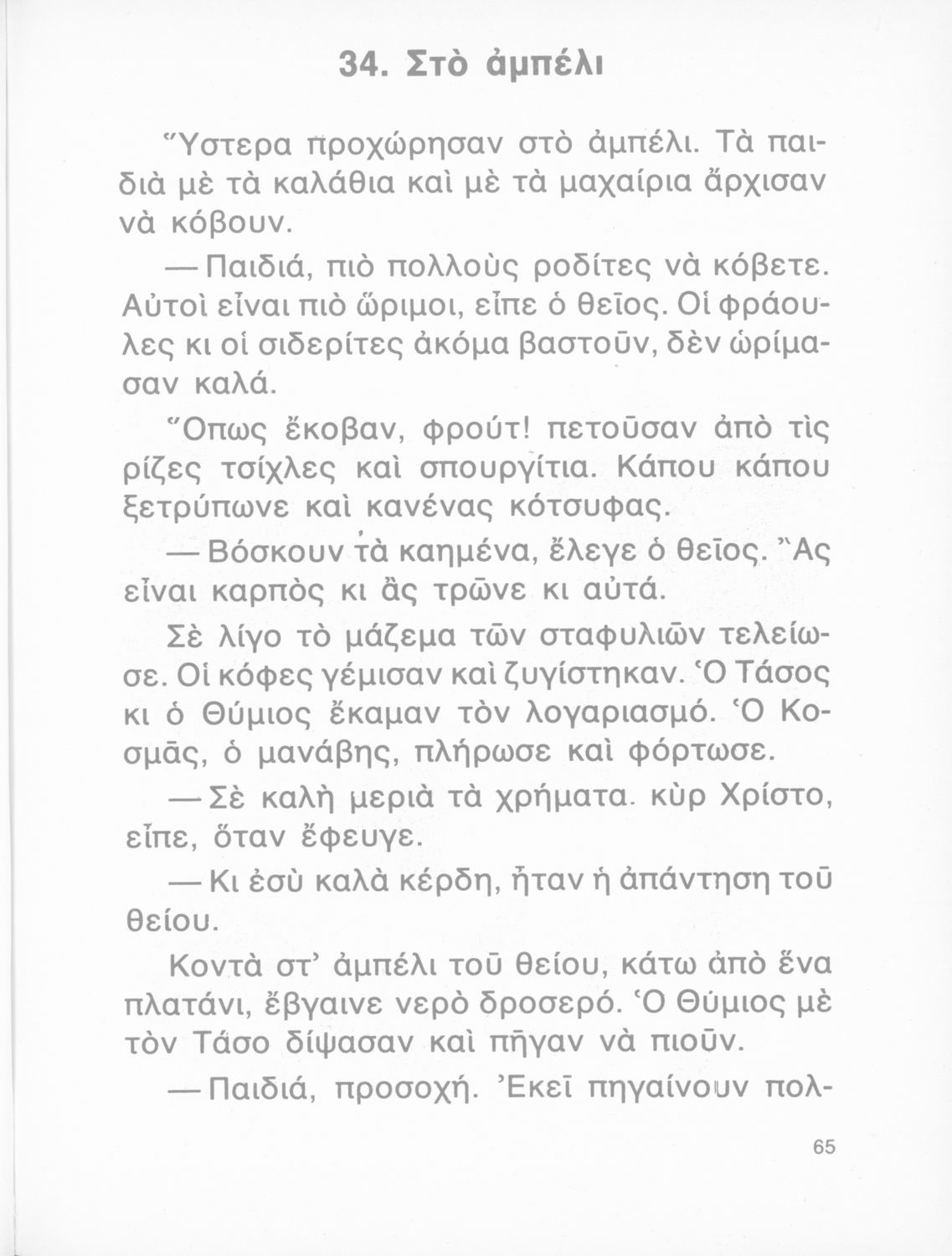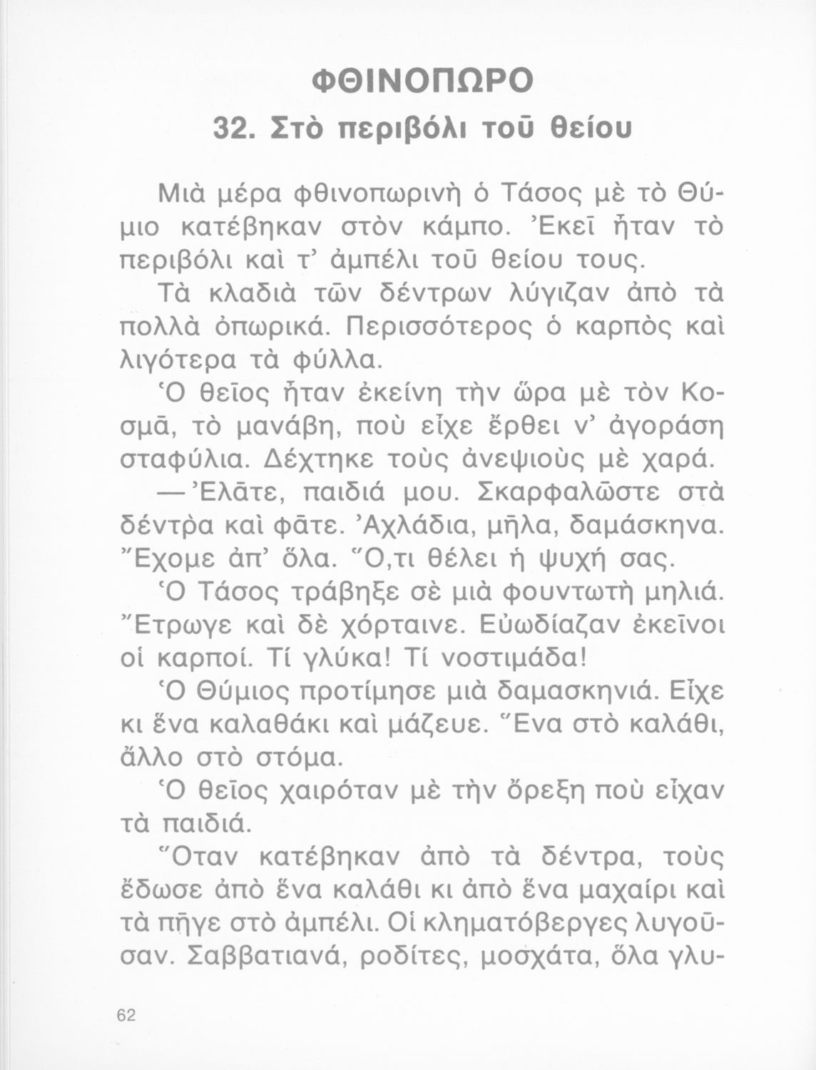 Βαθμίδα εκπαίδευσης: Πρωτοβάθμια Τάξη: Β' Δημοτικού Μάθημα: Νέα Ελληνικά Γλώσσα: Δημοτική Παρουσίαση περιεχομένου: Αναγνωστικό Β' Δημοτικού που είναι χωρισμένο σύμφωνα με τις εποχές του χρόνου και περιλαμβάνει κείμενα ηθοποιητικού περιεχομένου εμπνευσμένα από τη θρησκευτική, εθνική, κοινωνική και οικογενειακή ζωή. |
