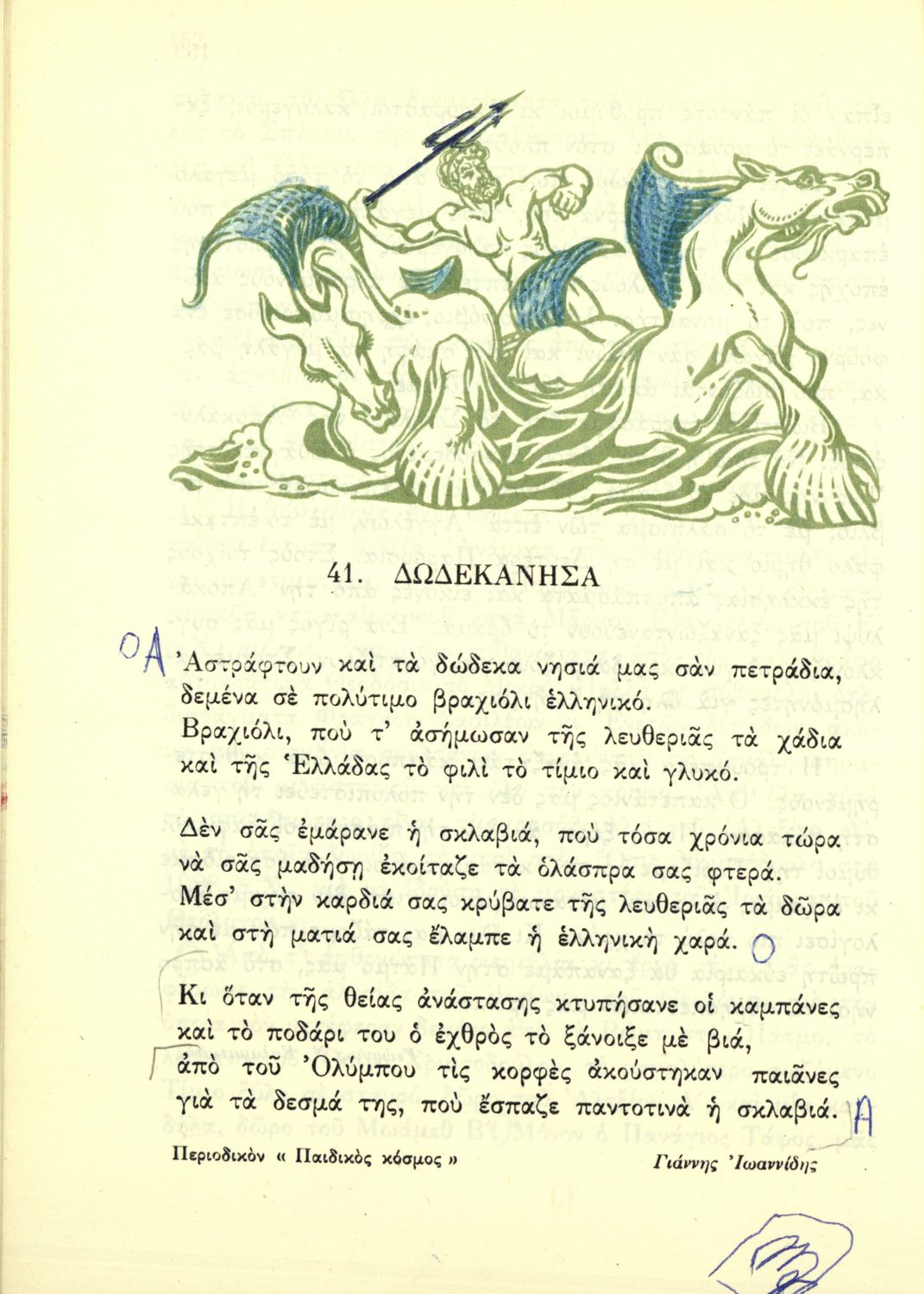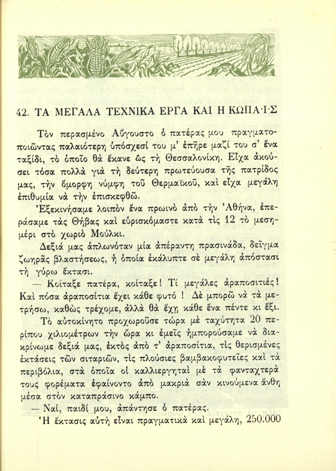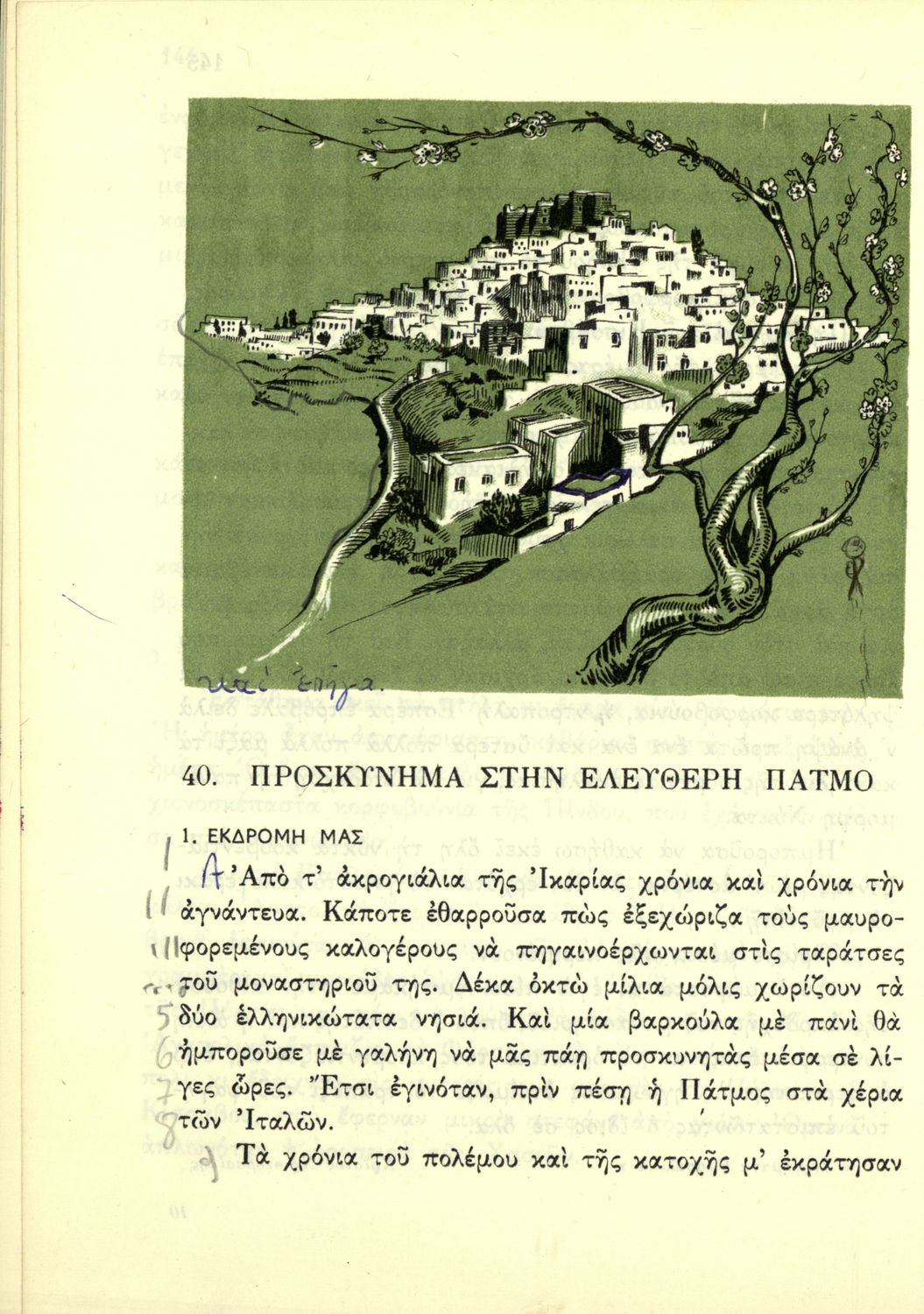Αναγνωστικό Ε΄ Δημοτικού που περιέχει κείμενα εμπνευσμένα από την εθνική, κοινωνική και οικογενειακή ζωή και την ελληνική φύση, μυθολογία και ιστορία. Φέρει το σύμβολο της δικτατορίας.