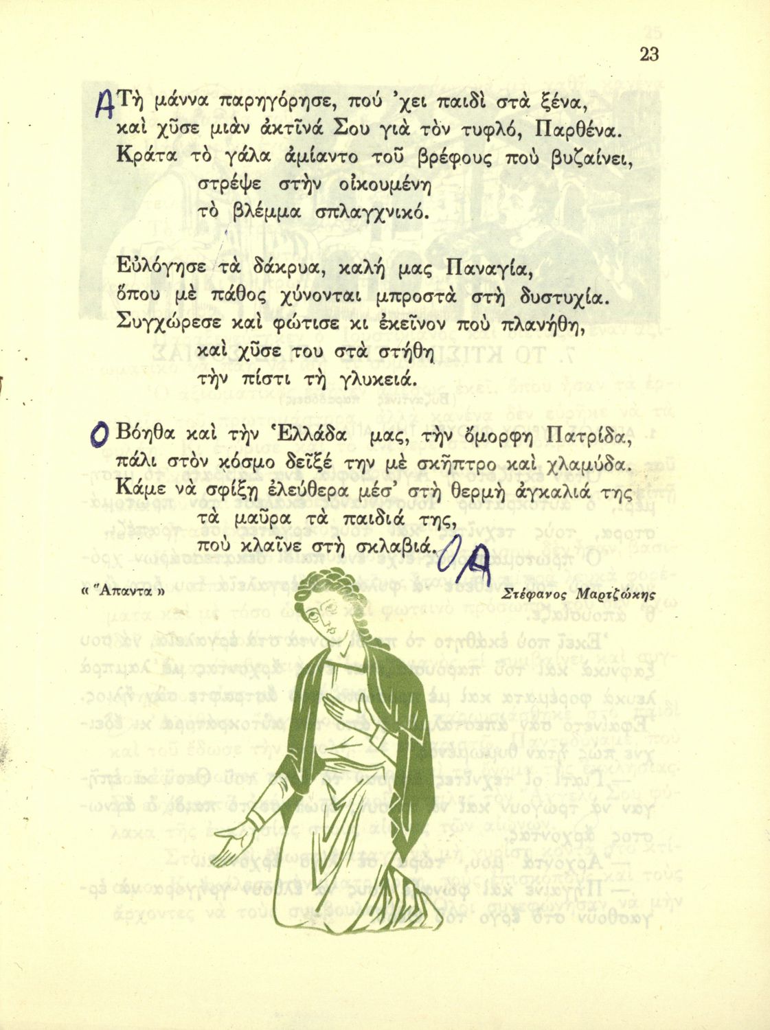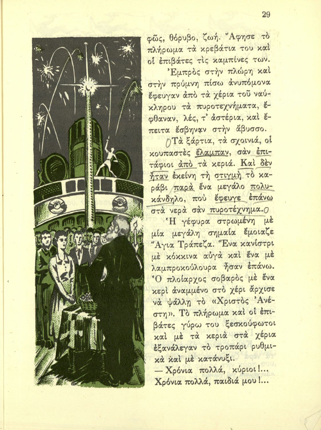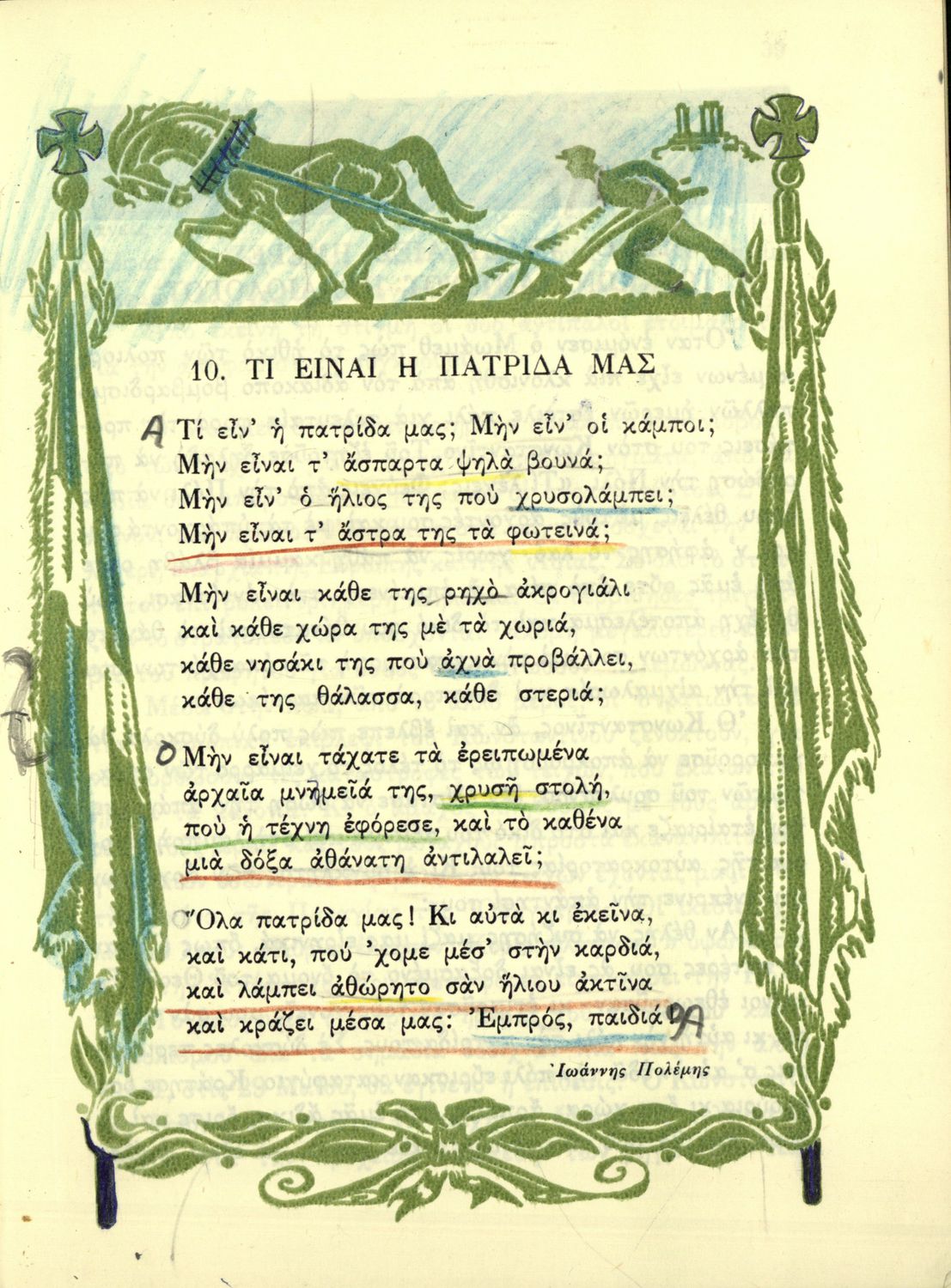 Αναγνωστικό Ε΄ Δημοτικού που περιέχει κείμενα εμπνευσμένα από την εθνική, κοινωνική και οικογενειακή ζωή και την ελληνική φύση, μυθολογία και ιστορία. Φέρει το σύμβολο της δικτατορίας.