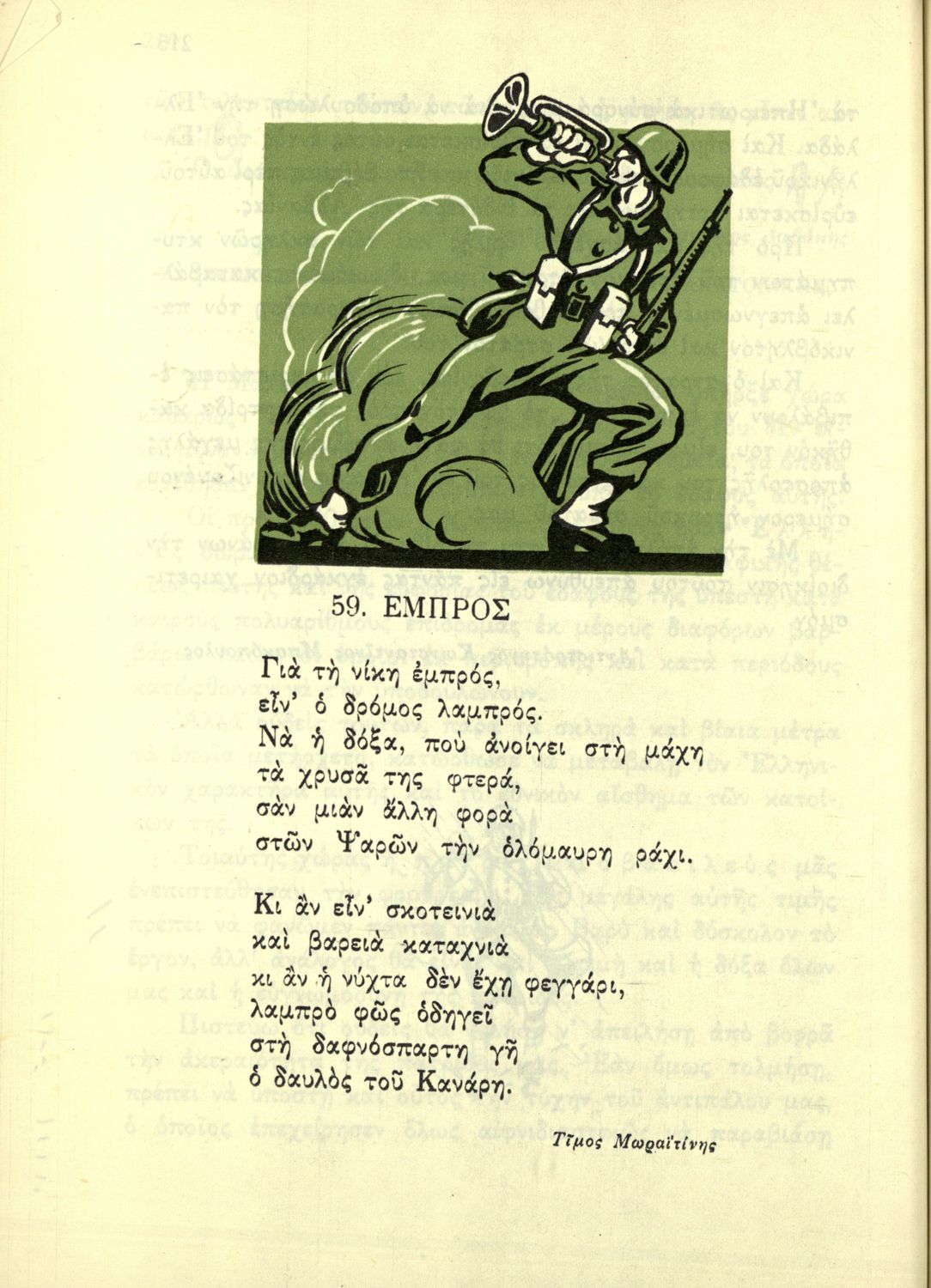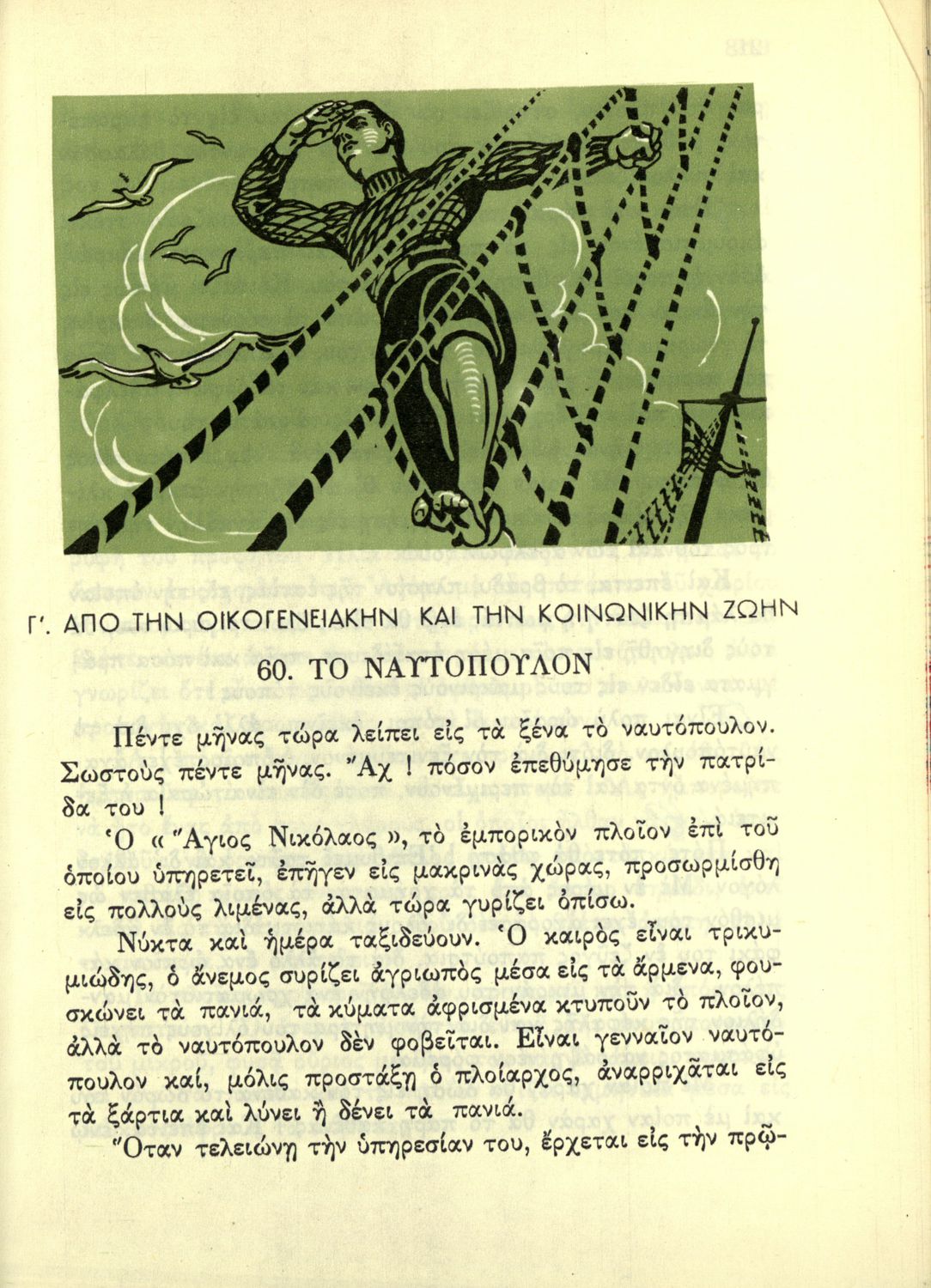 Αναγνωστικό Ε΄ Δημοτικού που περιέχει κείμενα εμπνευσμένα από την εθνική, κοινωνική και οικογενειακή ζωή και την ελληνική φύση, μυθολογία και ιστορία. Φέρει το σύμβολο της δικτατορίας.