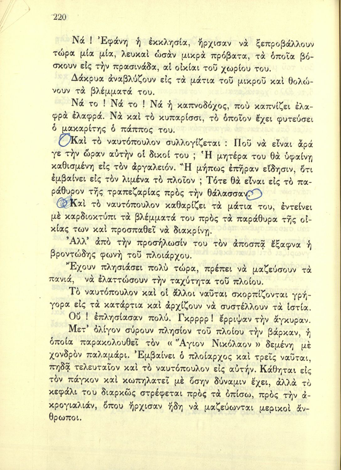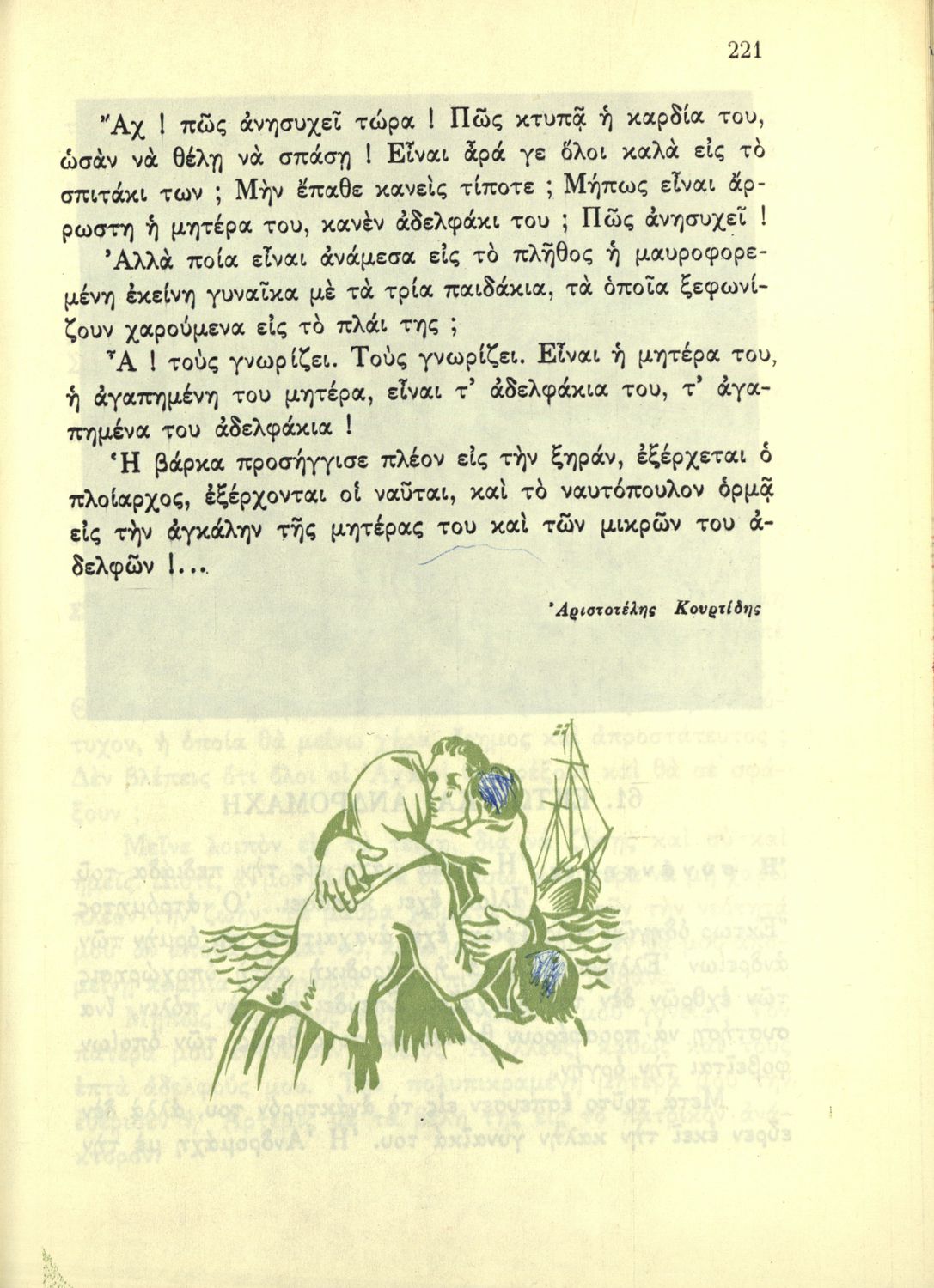 Αναγνωστικό Ε΄ Δημοτικού που περιέχει κείμενα εμπνευσμένα από την εθνική, κοινωνική και οικογενειακή ζωή και την ελληνική φύση, μυθολογία και ιστορία.