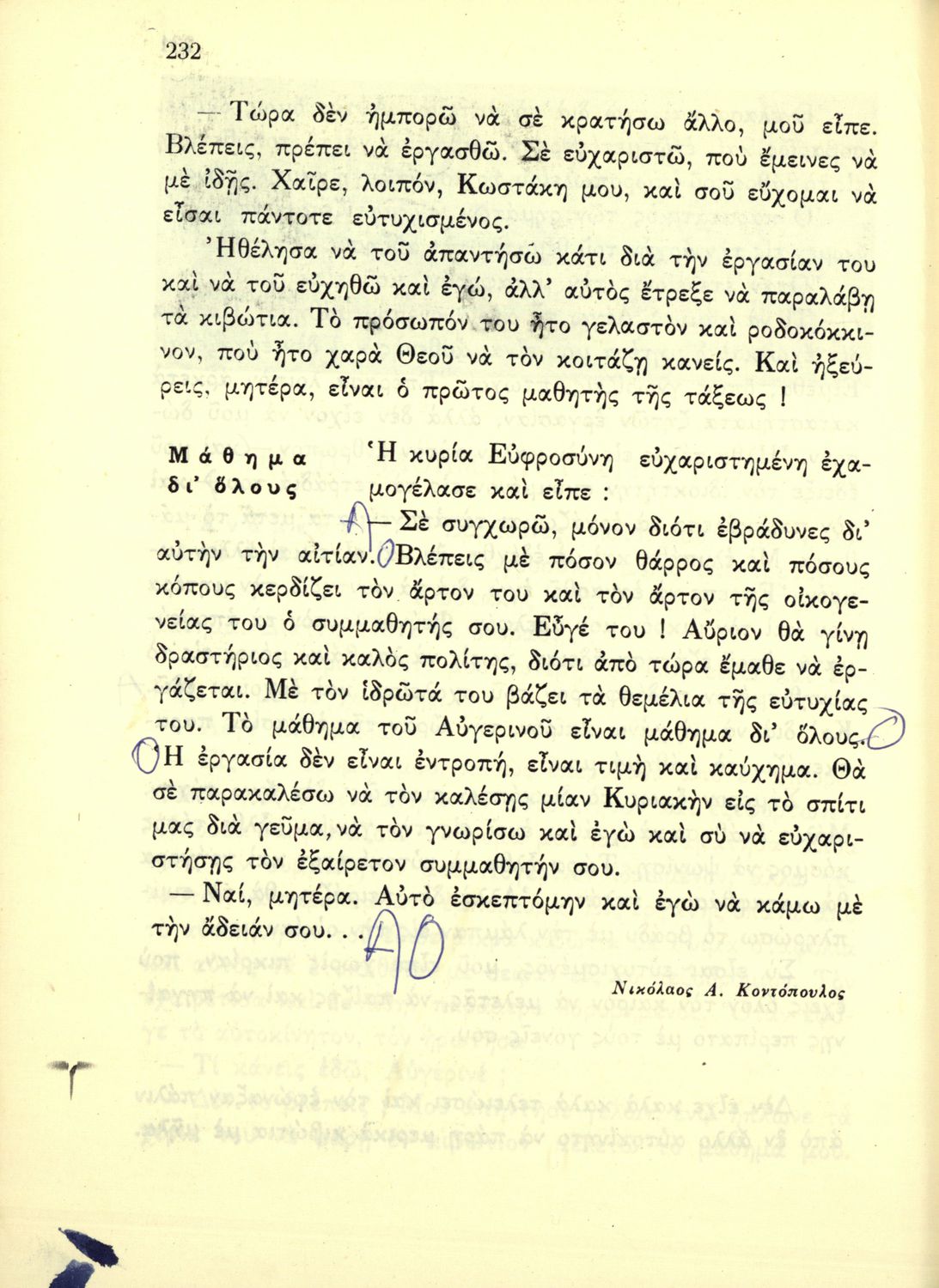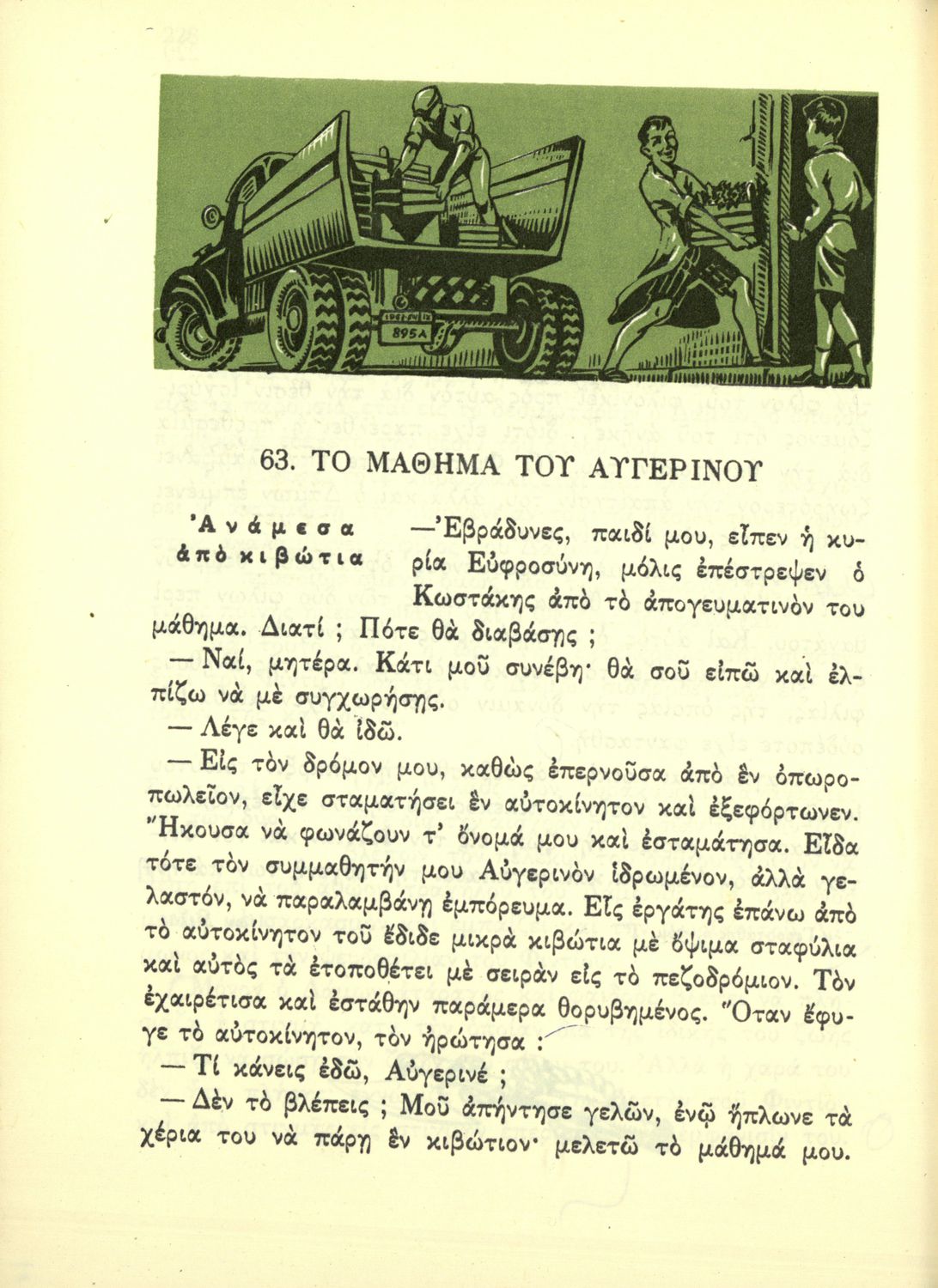 Αναγνωστικό Ε΄ Δημοτικού που περιέχει κείμενα εμπνευσμένα από την εθνική, κοινωνική και οικογενειακή ζωή και την ελληνική φύση, μυθολογία και ιστορία. Φέρει το σύμβολο της δικτατορίας.