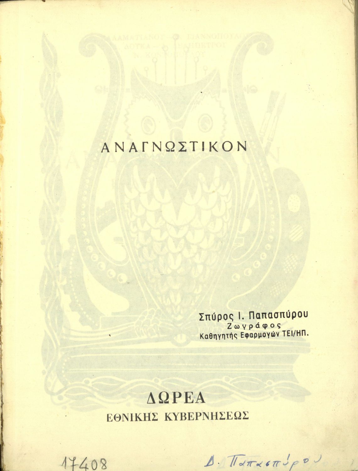 Κωδικός αναγνώρισης: 01-17408 Τίτλος: Αναγνωστικόν Ε΄ Δημοτικού Συγγραφέας: Γ. Καλαματιανός, Θ. Γιαννόπουλος, Δ. Δούκας, Δ. Δεληπέτρος, Ν. Κοντόπουλος Μέγεθος και υπόστρωμα: Σχολικό εγχειρίδιο, μαλακό εξώφυλλο, 300 σελίδες. Σκίτσα (έγχρωμα). |