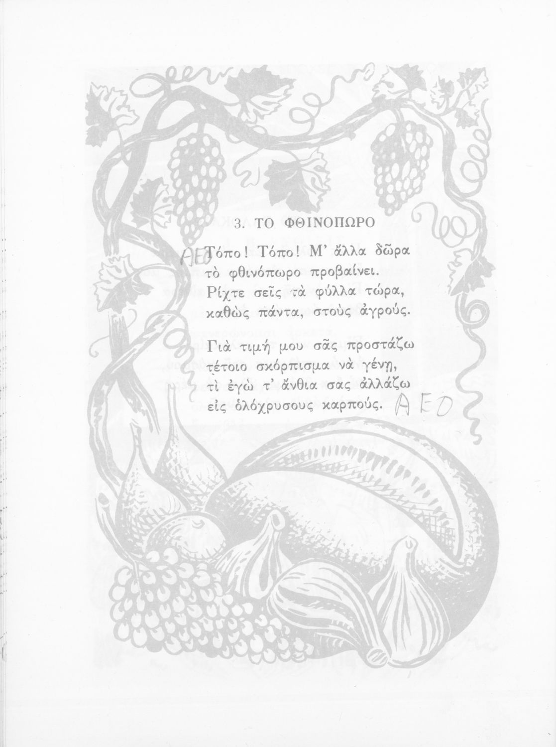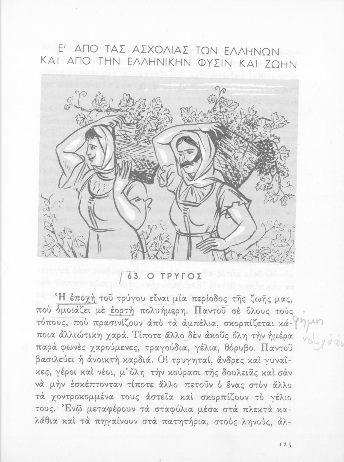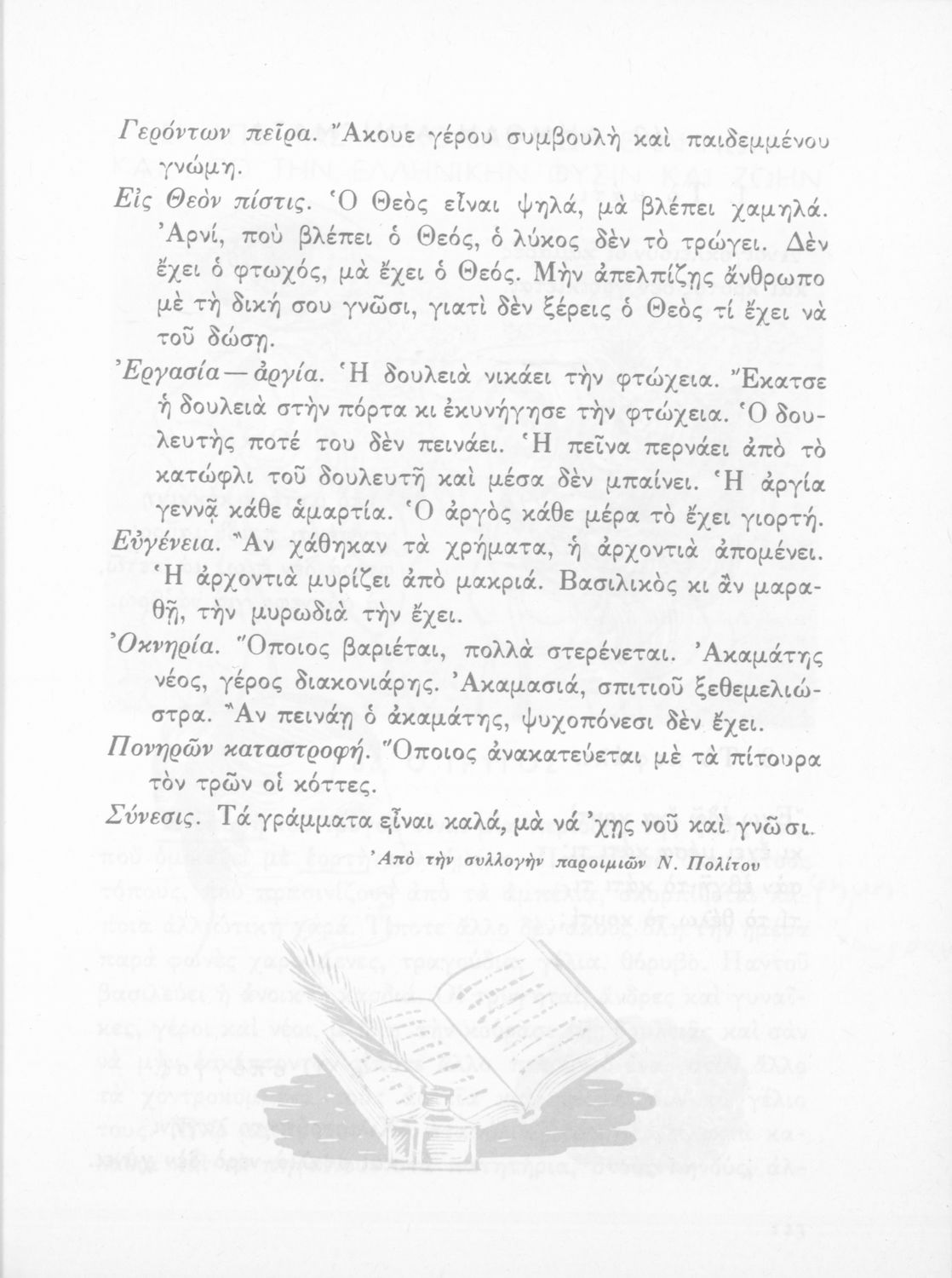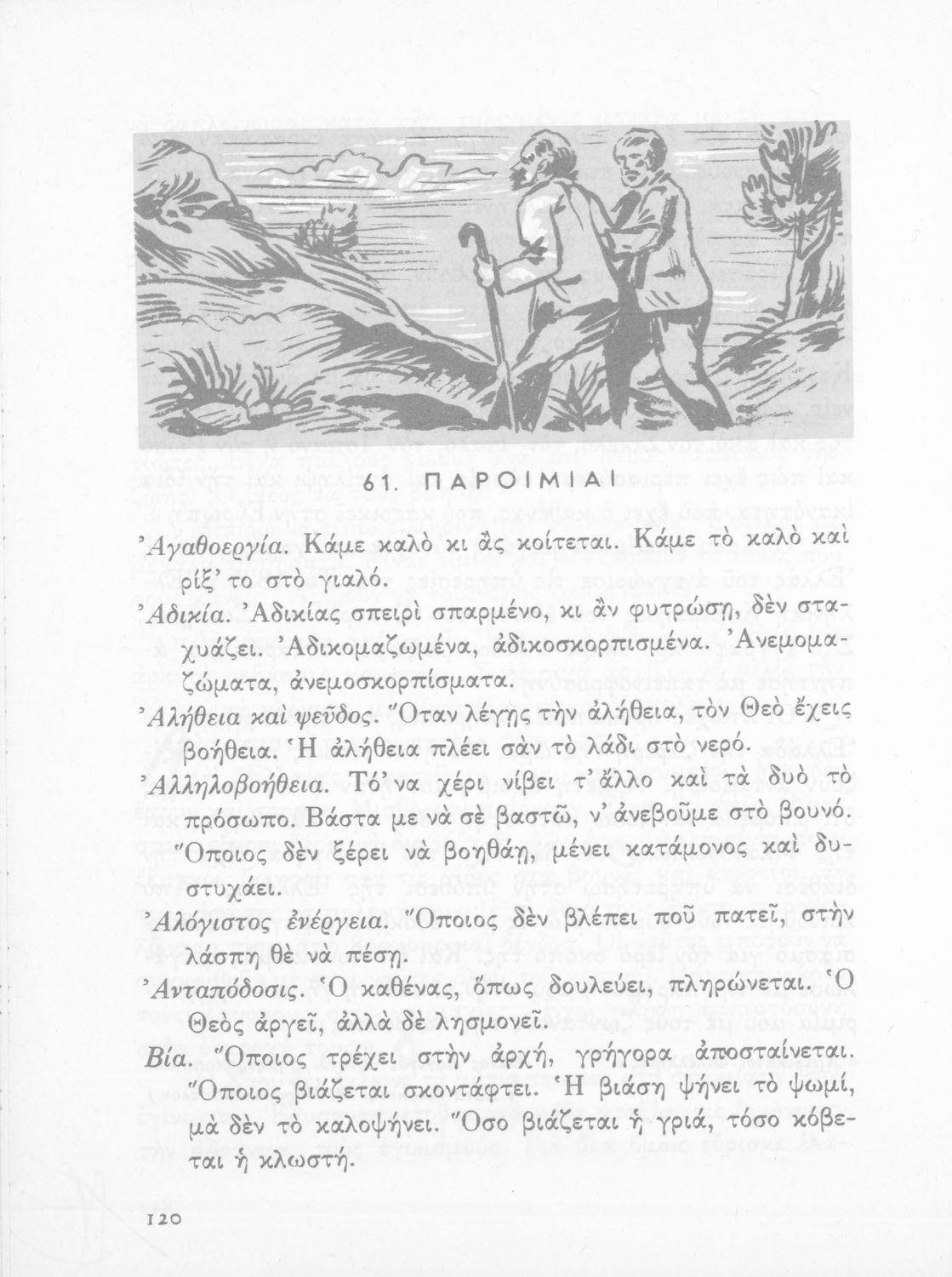Αναγνωστικό ΣΤ΄ Δημοτικού που περιλαμβάνει θέματα από τις ελληνικές παραδόσεις και μύθους, την ελληνική φύση και θάλασσα και το τρίπτυχο "Πατρίς-θρησκεία-οικογένειαα".