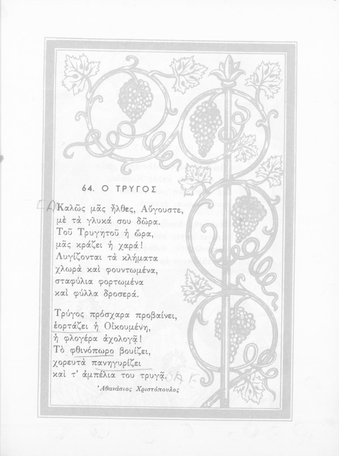 Αναγνωστικό ΣΤ΄ Δημοτικού που περιέχει πεζά και ποιήματα εμπνευσμένα από τη θρησκευτική, εθνική, κοινωνική και ατομική ζωή, την ελληνική φύση, ιστορία και μυθολογία και την υγιεινή.
