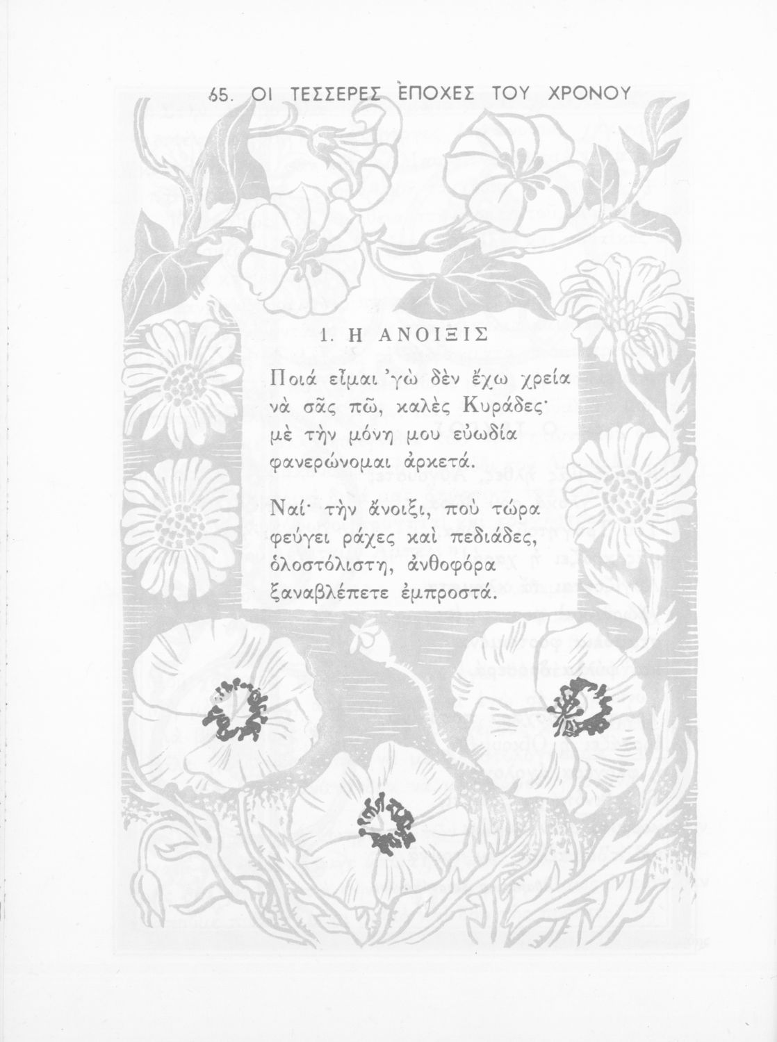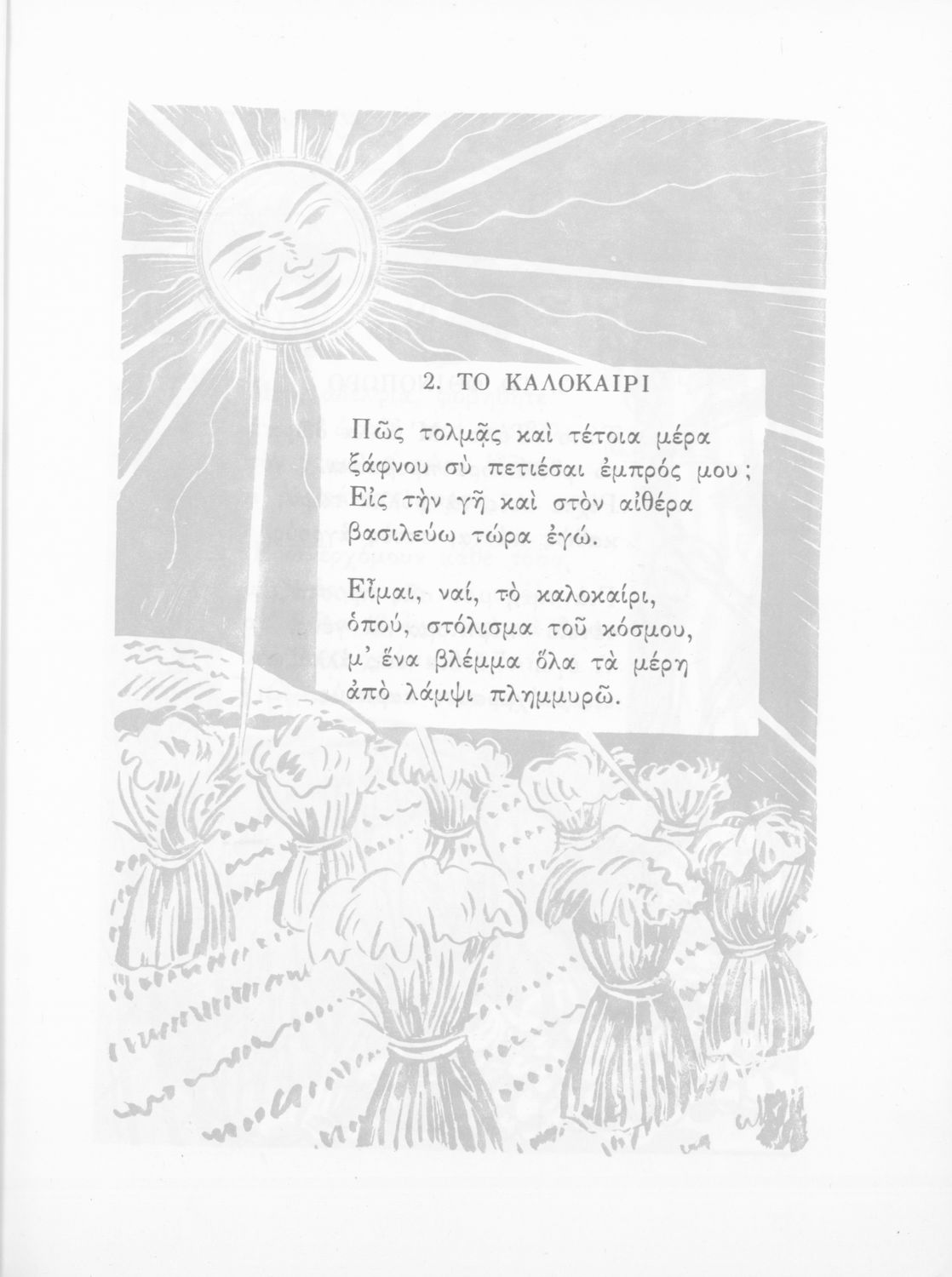 Αναγνωστικό Β' Δημοτικού που είναι χωρισμένο σύμφωνα με τις εποχές του χρόνου και περιλαμβάνει κείμενα ηθοποιητικού περιεχομένου εμπνευσμένα από τη θρησκευτική, εθνική, κοινωνική και οικογενειακή ζωή.