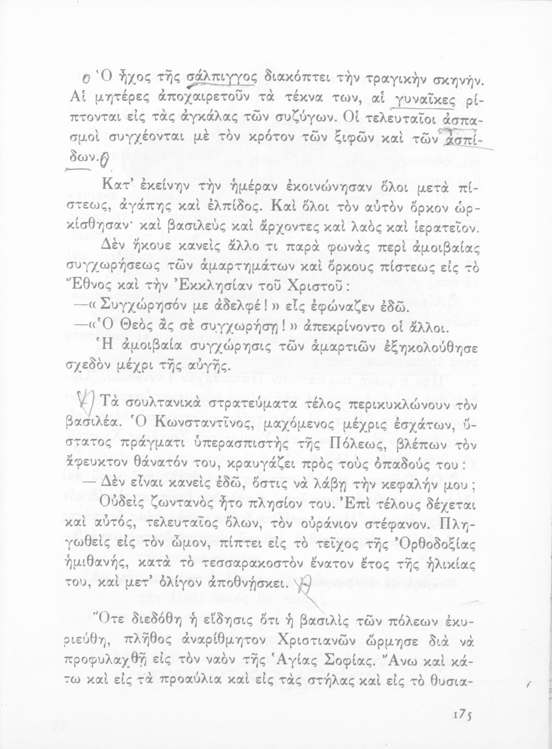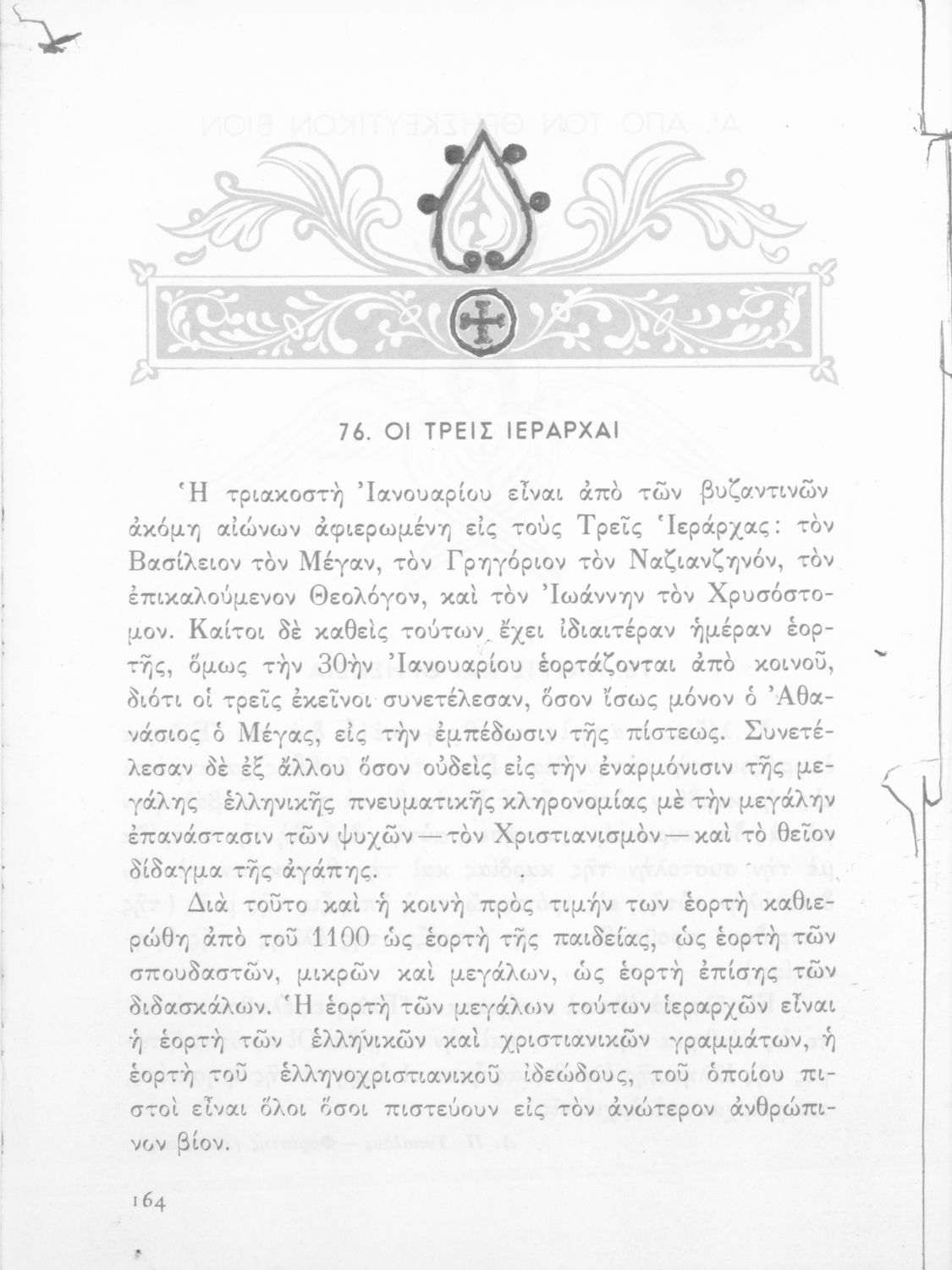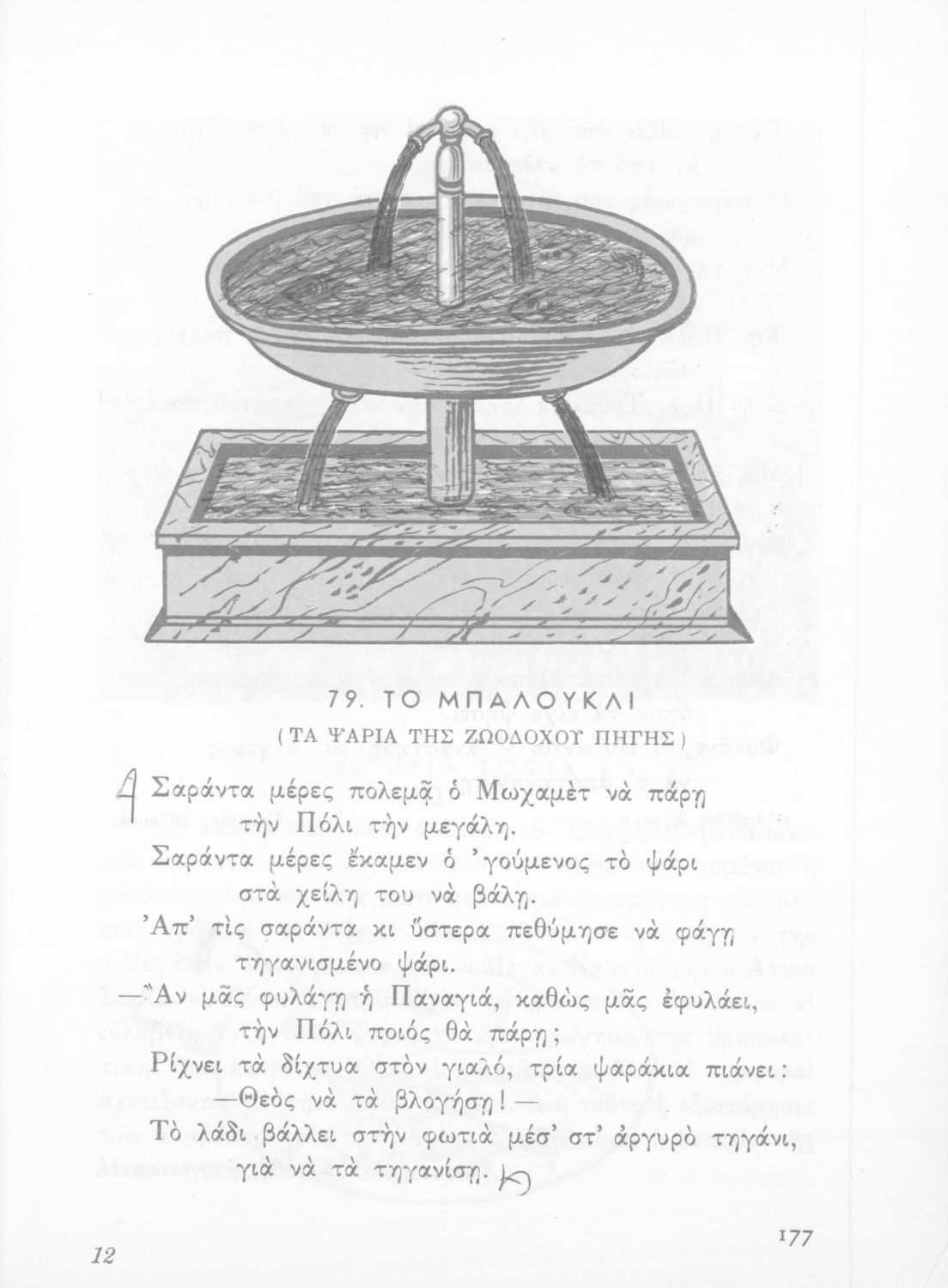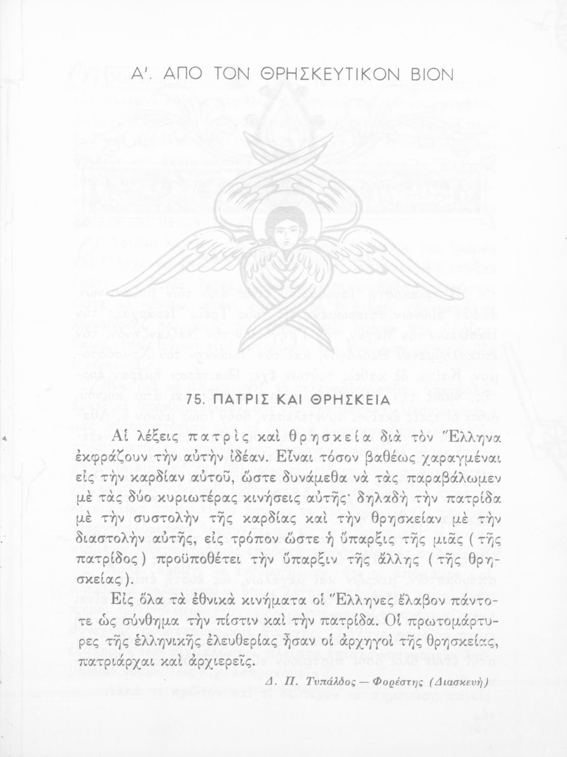 Αναγνωστικό ΣΤ΄ Δημοτικού που περιλαμβάνει θέματα από τις ελληνικές παραδόσεις και μύθους, την ελληνική φύση και θάλασσα και το τρίπτυχο "Πατρίς-θρησκεία-οικογένειαα".