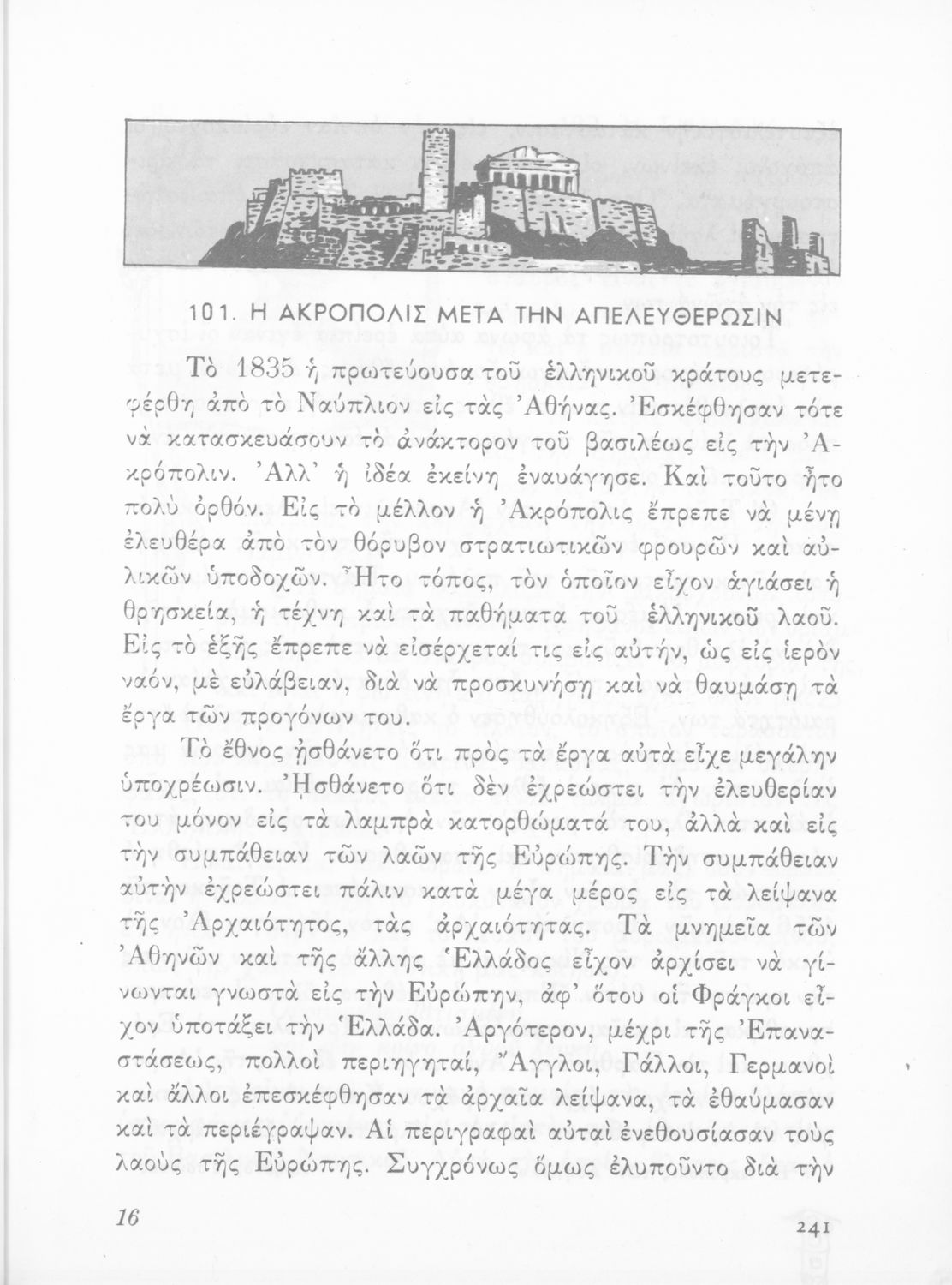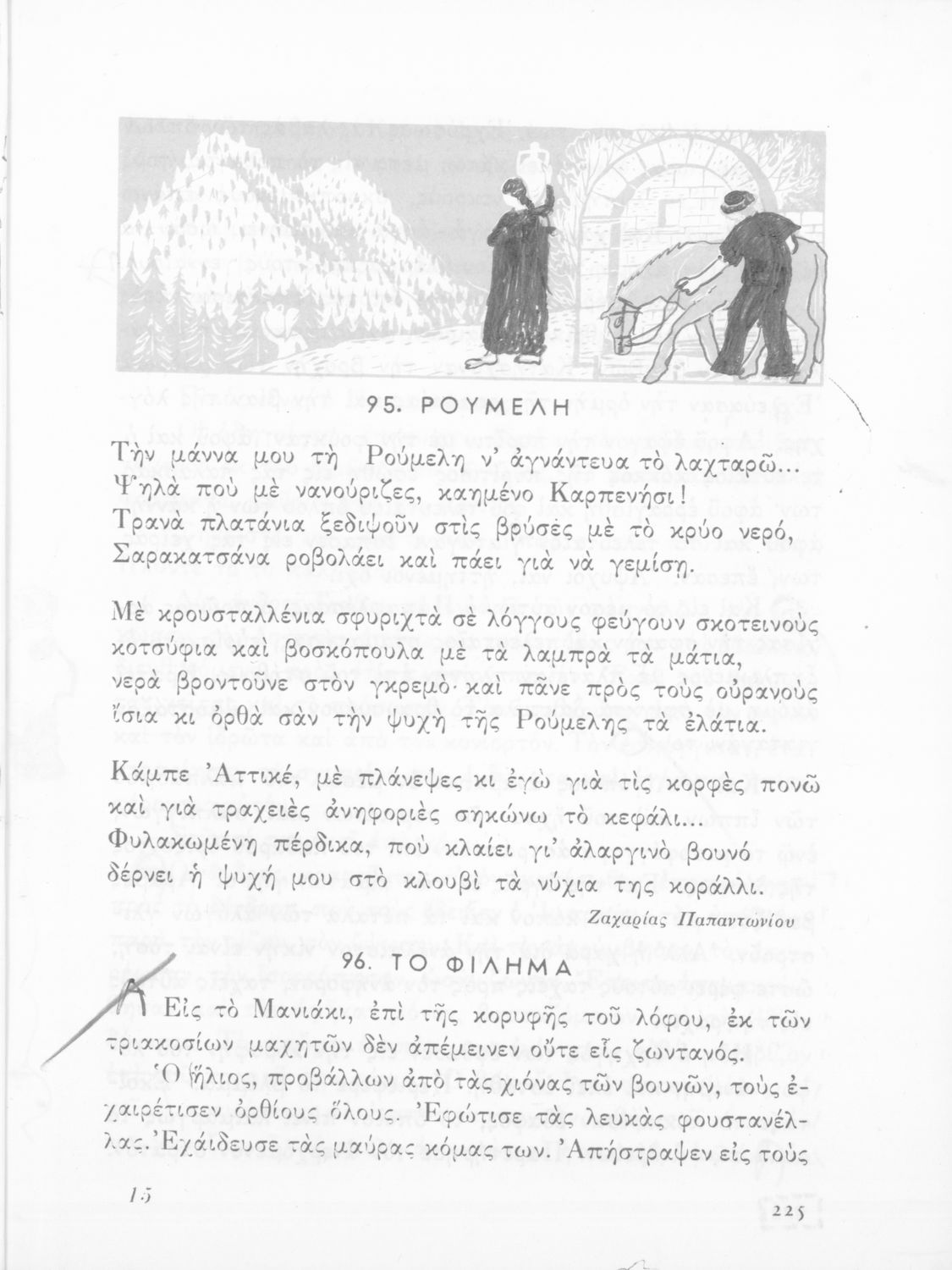 Αναγνωστικό ΣΤ΄ Δημοτικού που περιέχει πεζά και ποιήματα εμπνευσμένα από τη θρησκευτική, εθνική, κοινωνική και ατομική ζωή, την ελληνική φύση, ιστορία και μυθολογία και την υγιεινή.