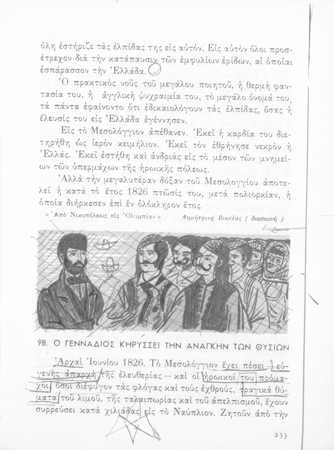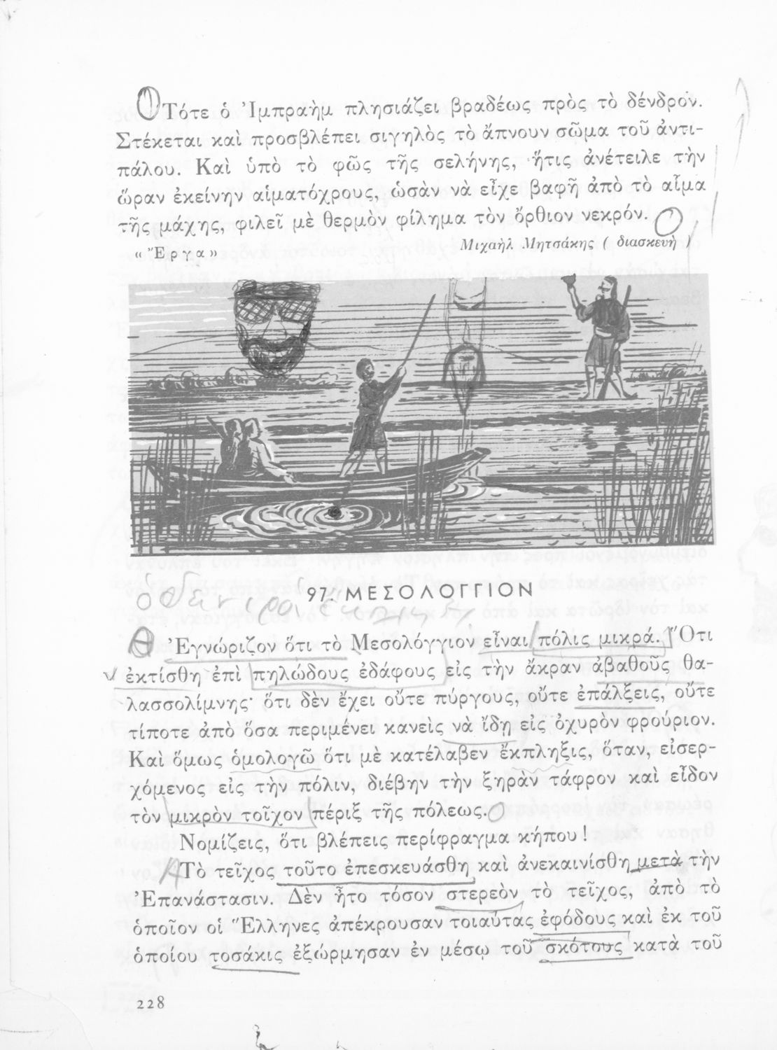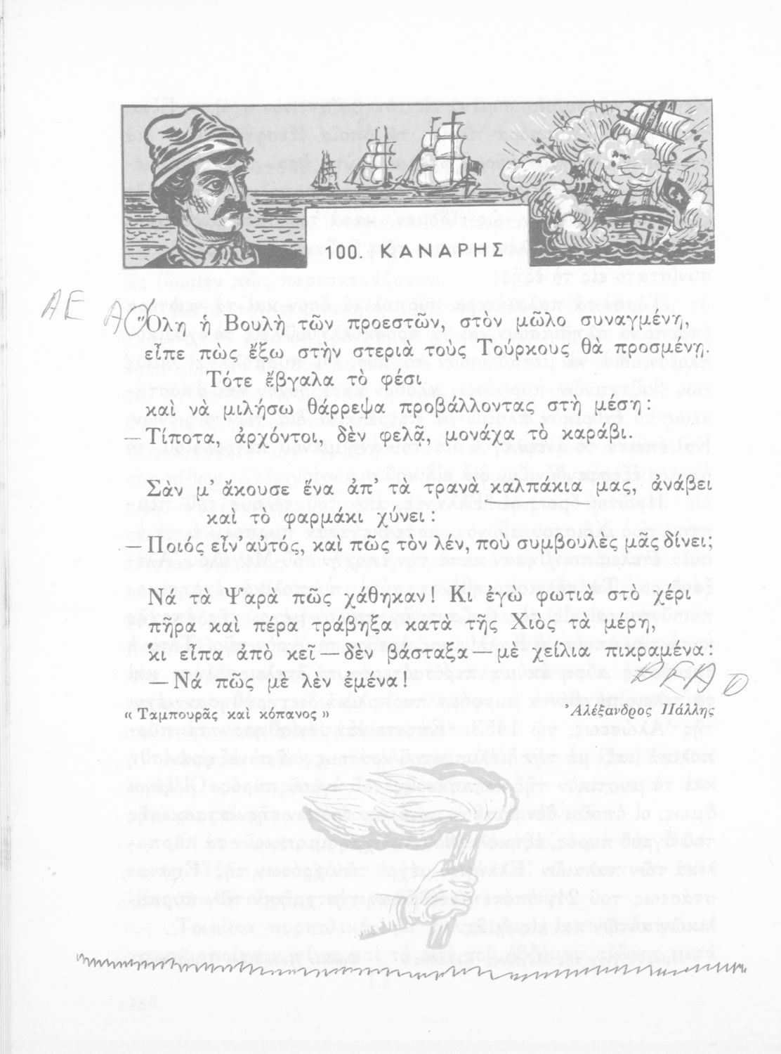 Αναγνωστικό ΣΤ΄ Δημοτικού που περιλαμβάνει θέματα από τις ελληνικές παραδόσεις και μύθους, την ελληνική φύση και θάλασσα και το τρίπτυχο "Πατρίς-θρησκεία-οικογένειαα".