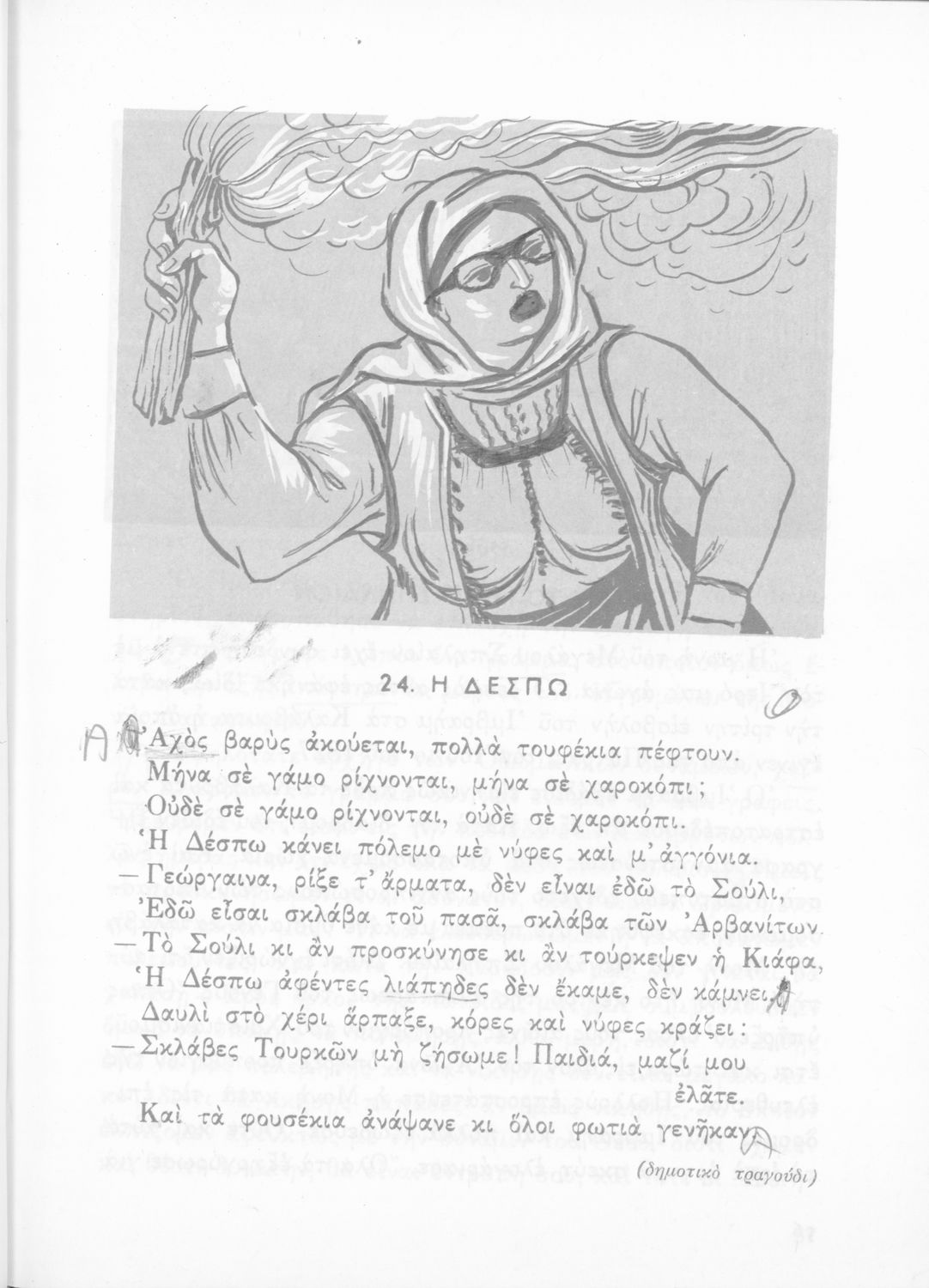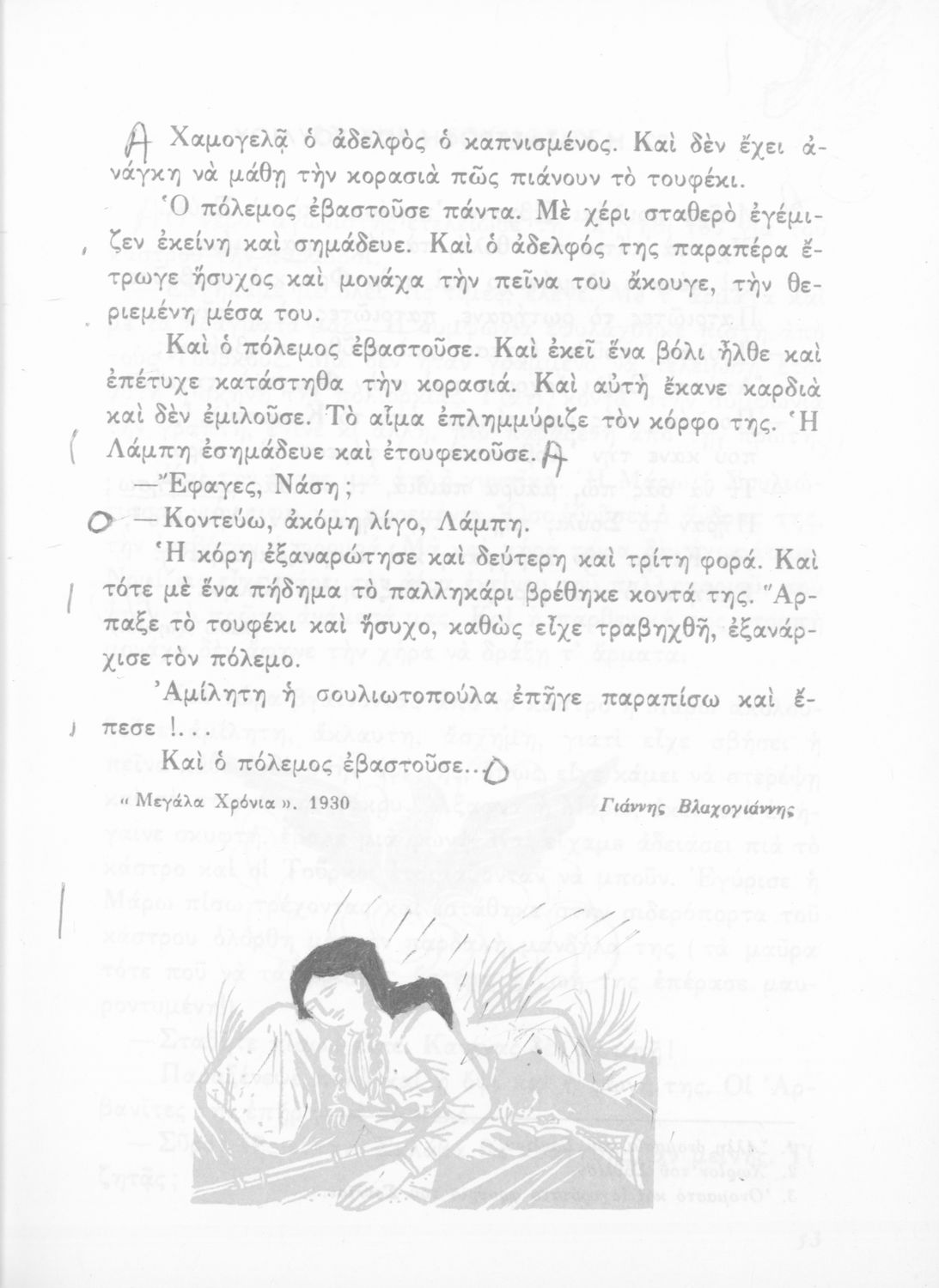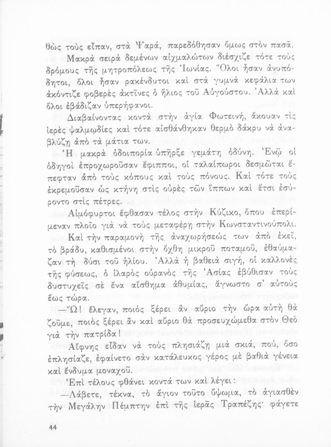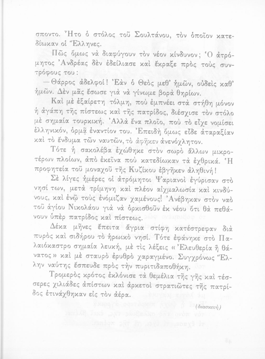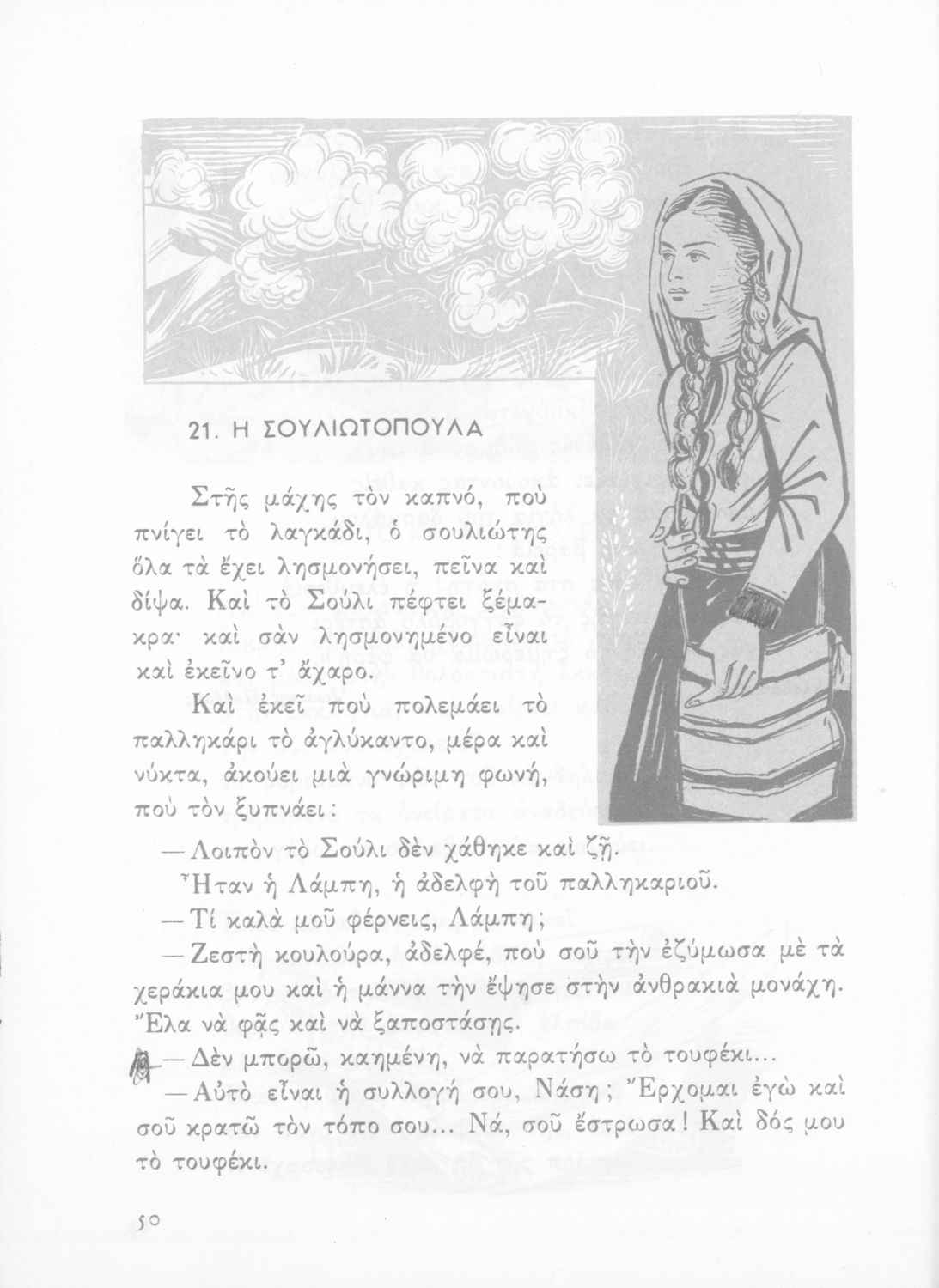 Αναγνωστικό ΣΤ΄ Δημοτικού που περιλαμβάνει θέματα από τις ελληνικές παραδόσεις και μύθους, την ελληνική φύση και θάλασσα και το τρίπτυχο "Πατρίς-θρησκεία-οικογένειαα".