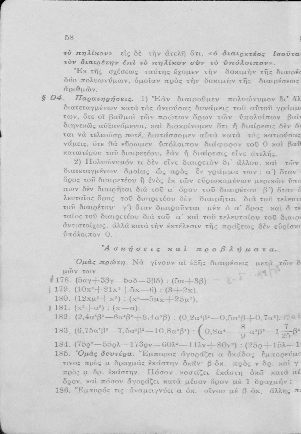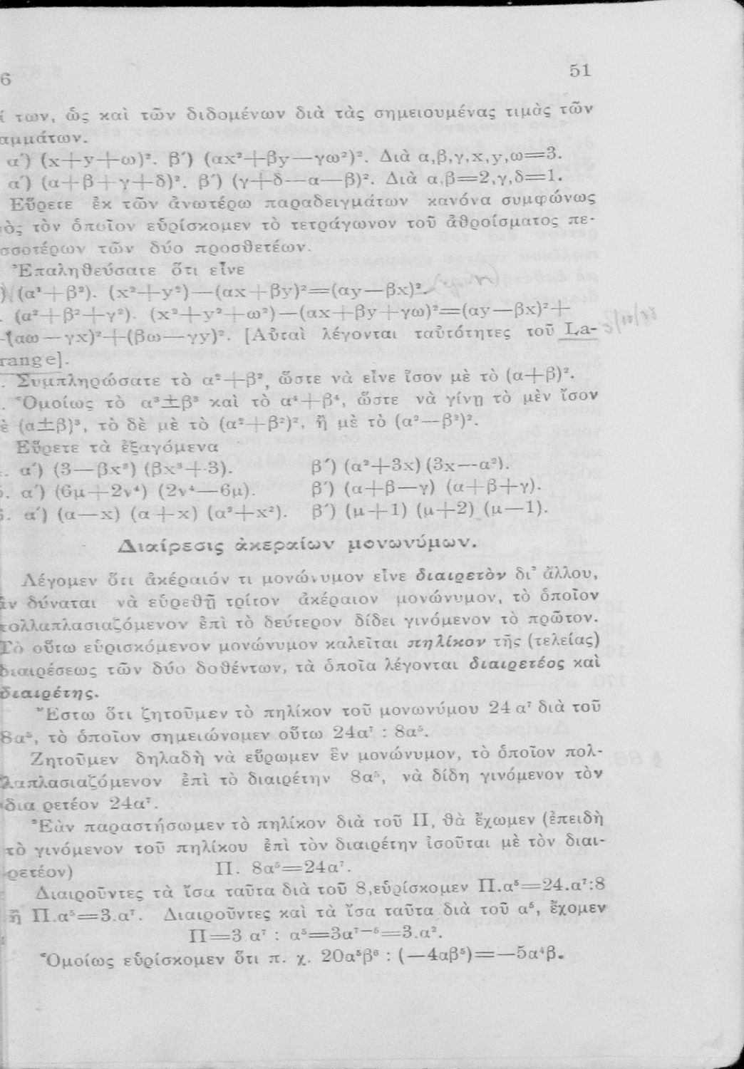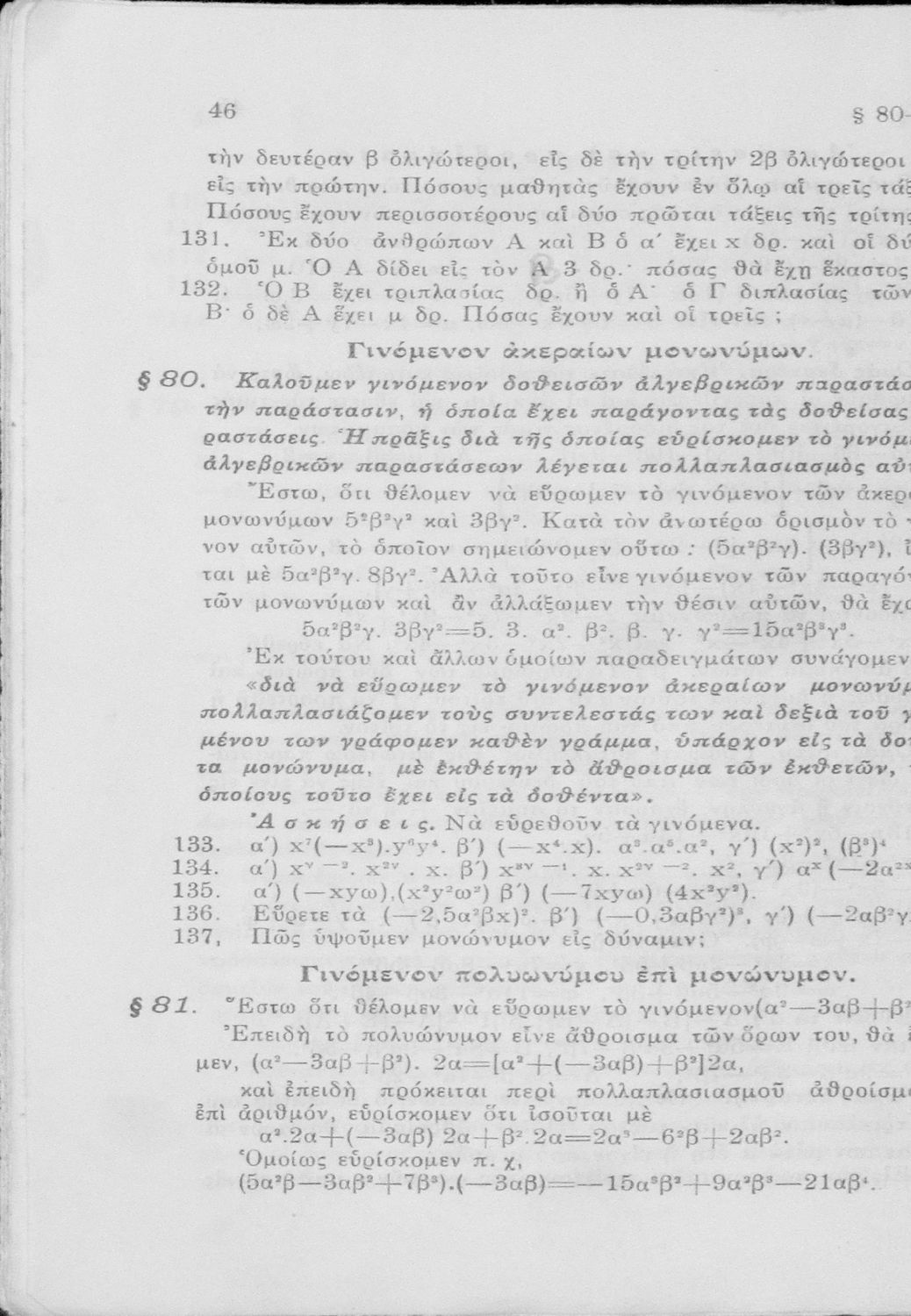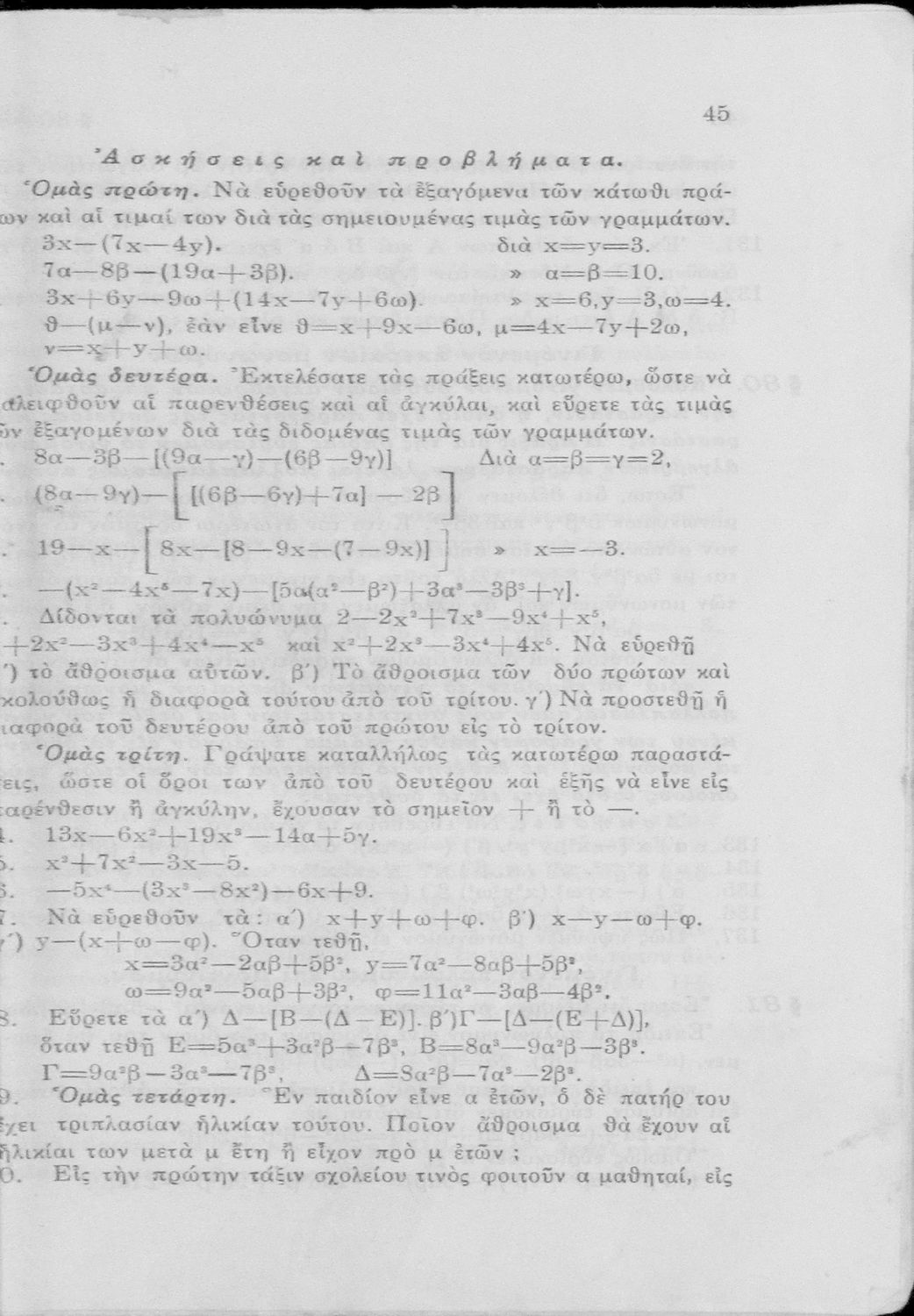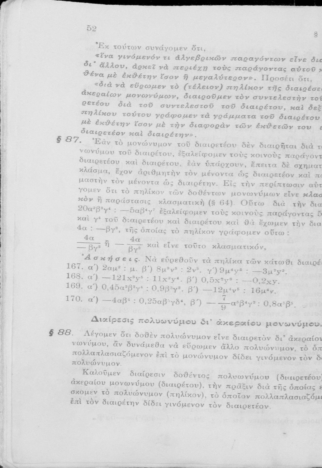 Σχολικό εγχειρίδιο Άλγεβρας για τα Γυμνάσια χωρισμένο σε θεωρία και ασκήσεις. Ο συγγραφέας ήταν καθηγητής στο Πανεπιστήμιο Αθηνών.