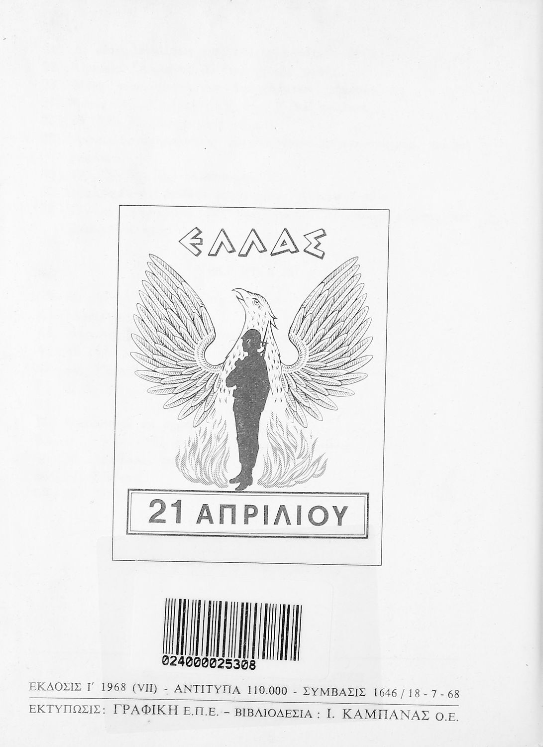 Σχολικό Εγχειρίδιο Αρχαίων Ελληνικών που περιλαμβάνει κείμενα προσαρμοσμένα στη διδασκαλία των γραμματικών και συντακτικών φαινομένων, και ερμηνευτικές και λεξιλογικές σημειώσεις. Φέρει το σύμβολο της δικτατορίας.